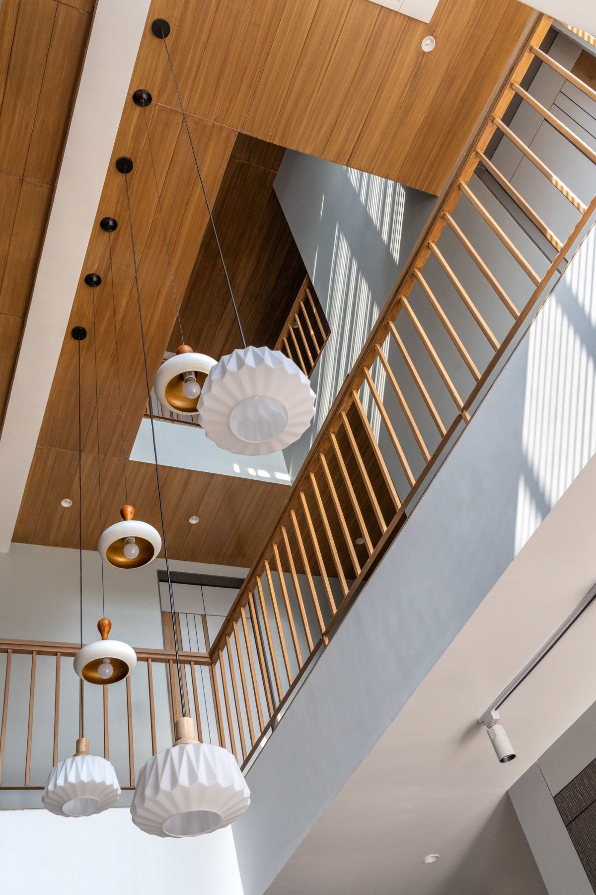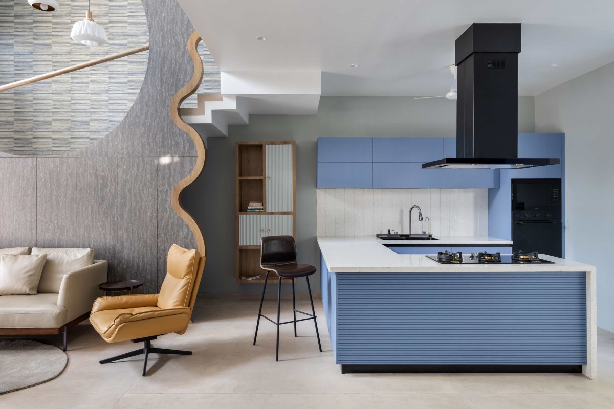 Upon entering the house, one is greeted by a soaring triple-height living room, where an artistic staircase ascends gracefully in the backdrop. Blending of these 2 functions, details how circulation form and flow in architecture meets art in harmony. Using of wooden palette with textured laminates, colours and wallpapers, marks in the interiors for this house. Organic silhouettes of various motifs and free forms, let the concept of curves flowing inside the house in furniture detail.