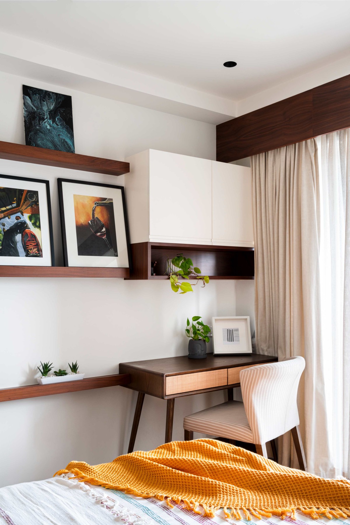 Each bedroom carries its own character: the master bedroom is soft and monochromatic, the son's room uses darker tones and a sharper palette, while the daughter's room introduces brighter colours and playful warmth.