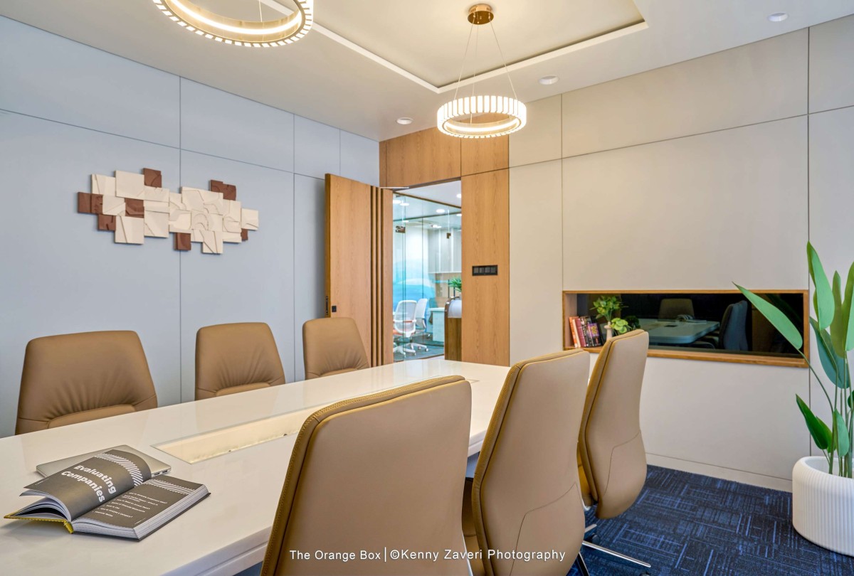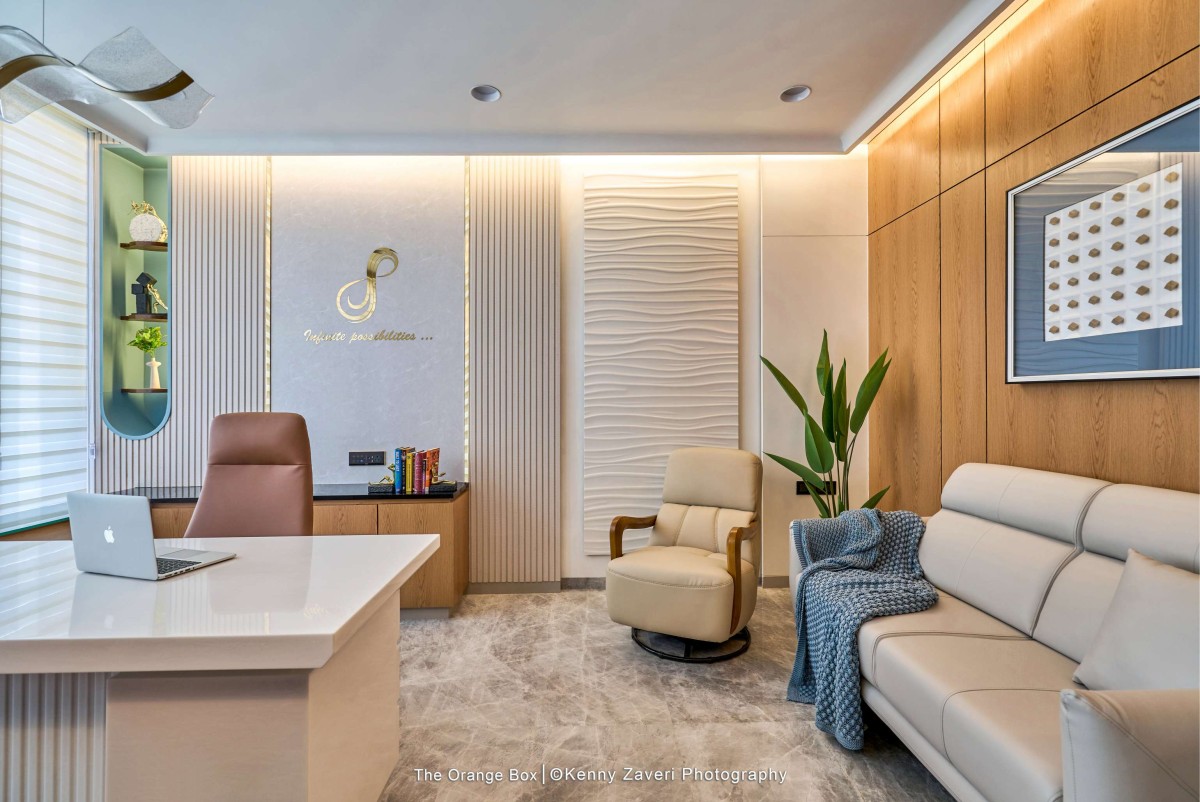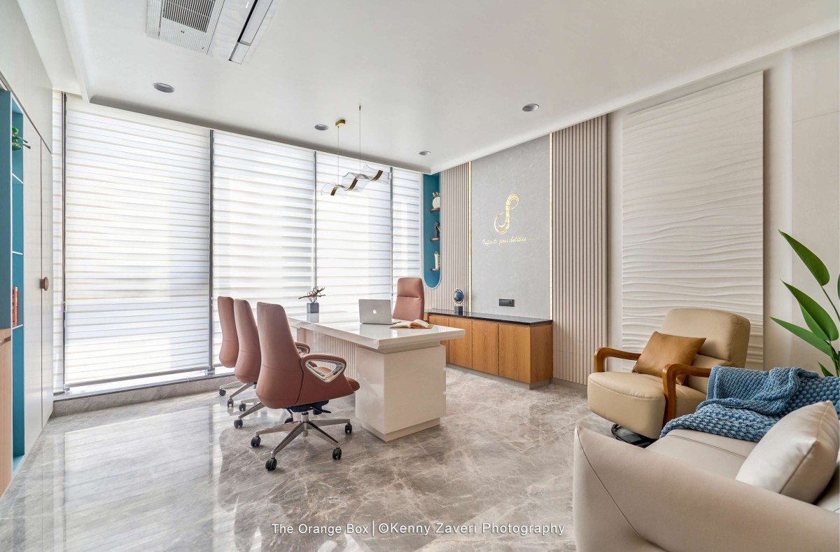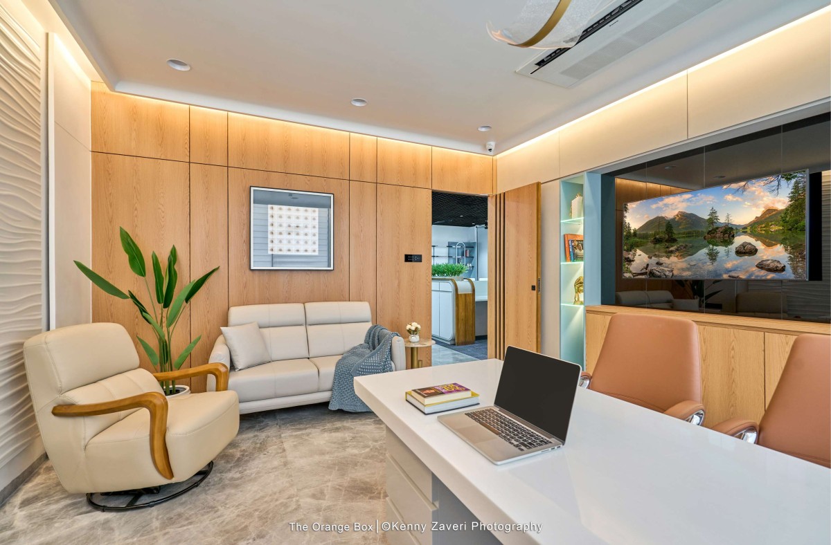 The director’s cabin, also located along the external face of the site, receives ample natural light that can be easily controlled as needed. Soft colors and warm materials are used throughout the space, creating a cozy and inviting atmosphere while maintaining a sense of professionalism and functionality.