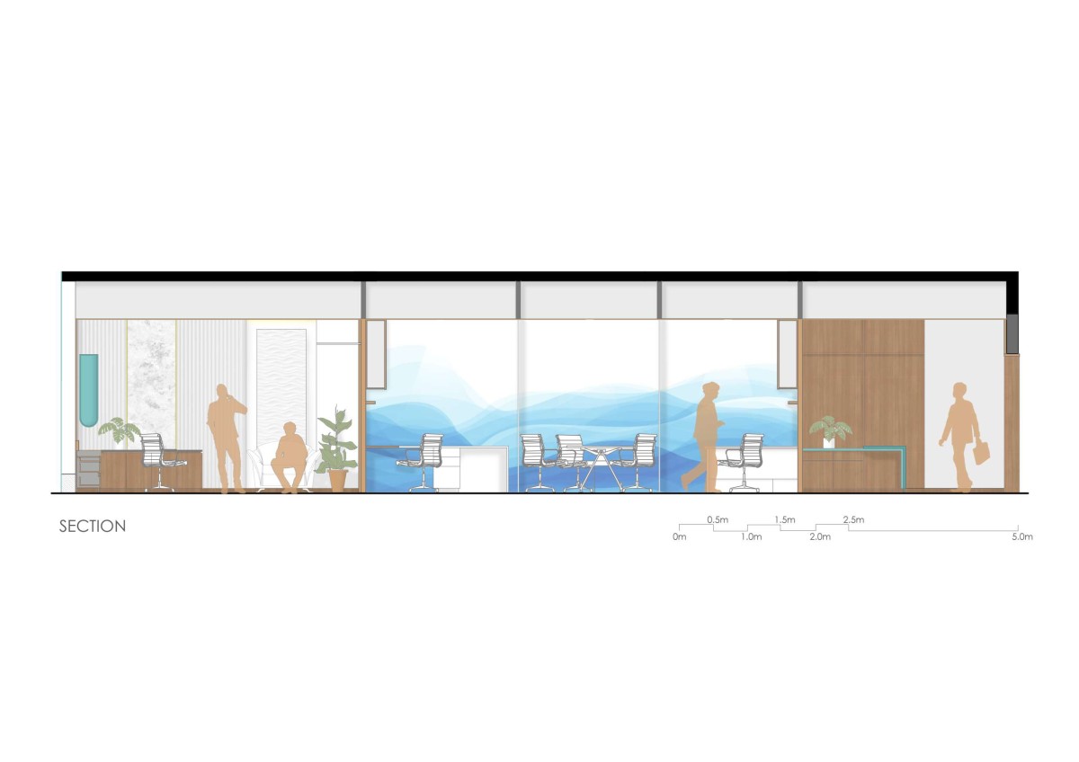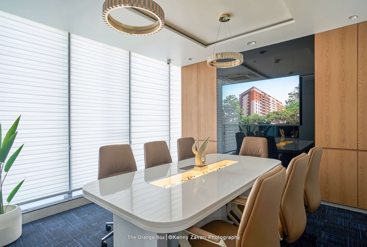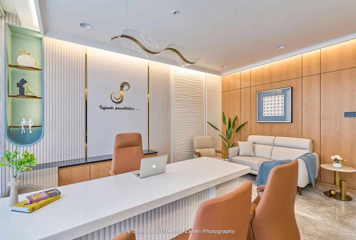 The director’s cabin, also located along the external face of the site, receives ample natural light that can be easily controlled as needed. Soft colors and warm materials are used throughout the space, creating a cozy and inviting atmosphere while maintaining a sense of professionalism and functionality.