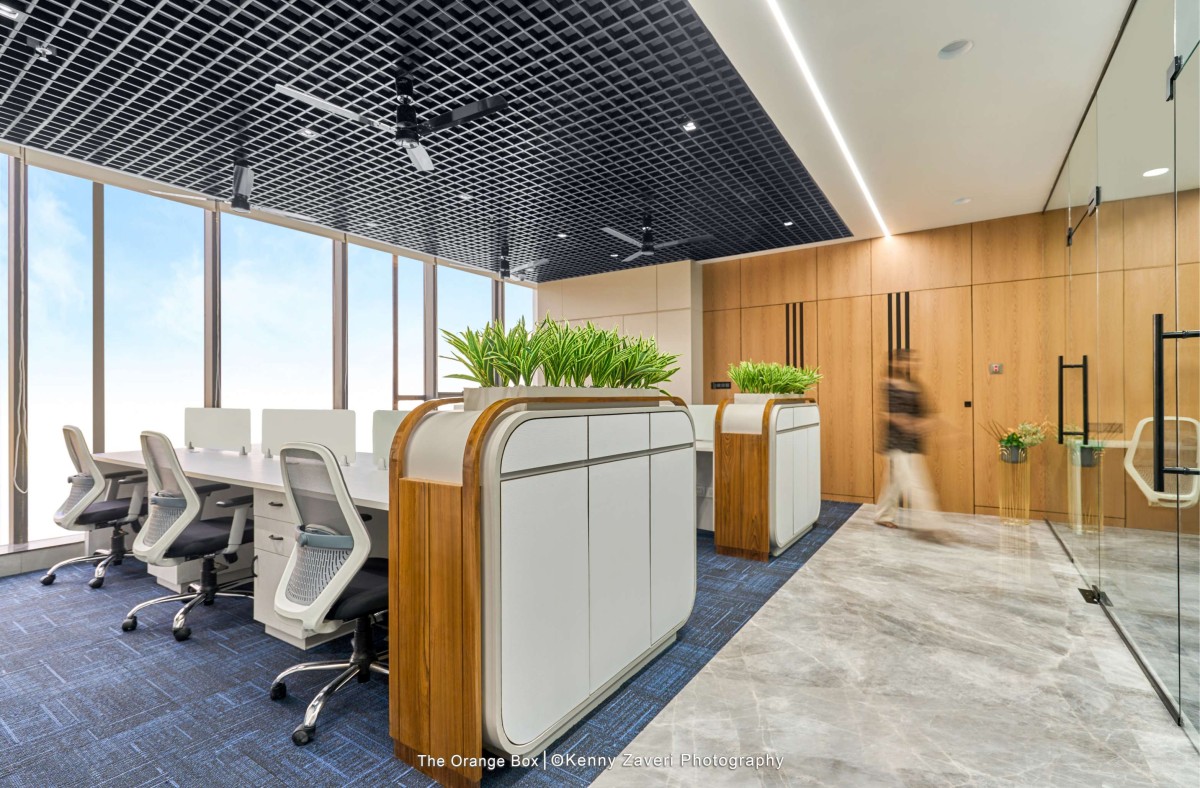 The staff work area, partitioned by the planter-integrated storage units, is situated along the external edge of the office, allowing ample daylight to flood the workspace. The flooring transitions to a blue carpet, enhancing the aesthetics while functionally demarcating the work zone and aiding in acoustic comfort by reducing ambient noise.