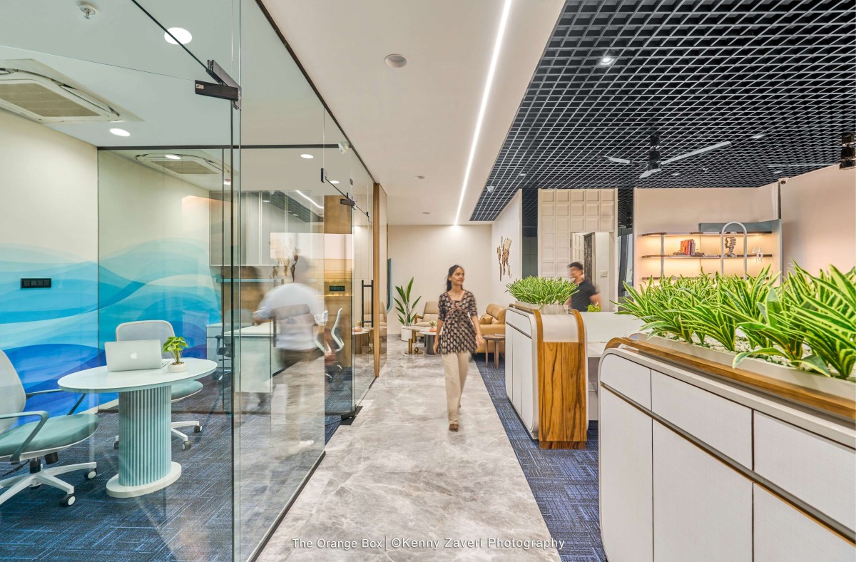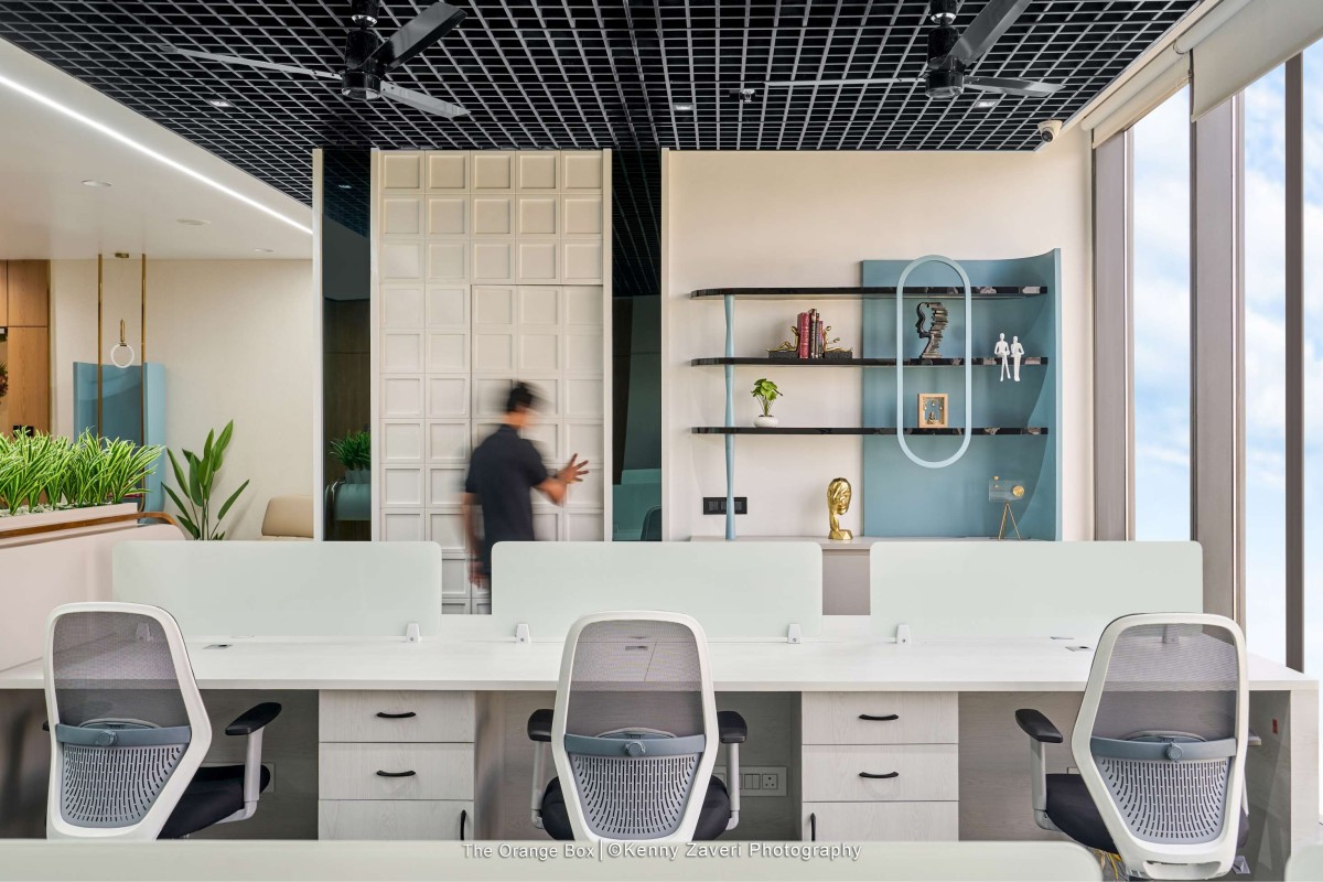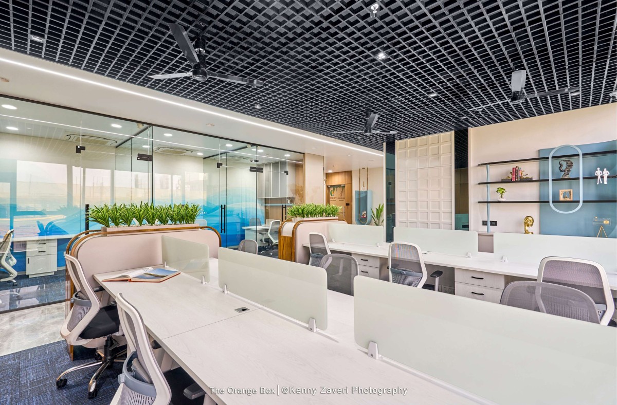Our design solution focused on transforming the workspace into a bright, inviting, and efficient environment that enhances both productivity and comfort. To overcome the challenge of limited natural light, glass partitions and reflective surfaces were strategically placed to maximize brightness and openness, creating a spacious and energizing atmosphere. Planters integrated into storage cabinets along the passage add a refreshing touch of greenery, softening the overall look and making the environment more pleasant for employees. A bright blue wallpaper framed by three work cabins serves as a vibrant focal point, bringing character and liveliness to the space. Together, these elements of colour, light, and greenery create a balanced and contemporary workspace that supports focus, collaboration, and creativity.