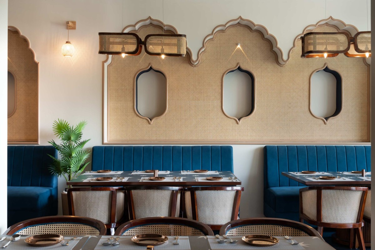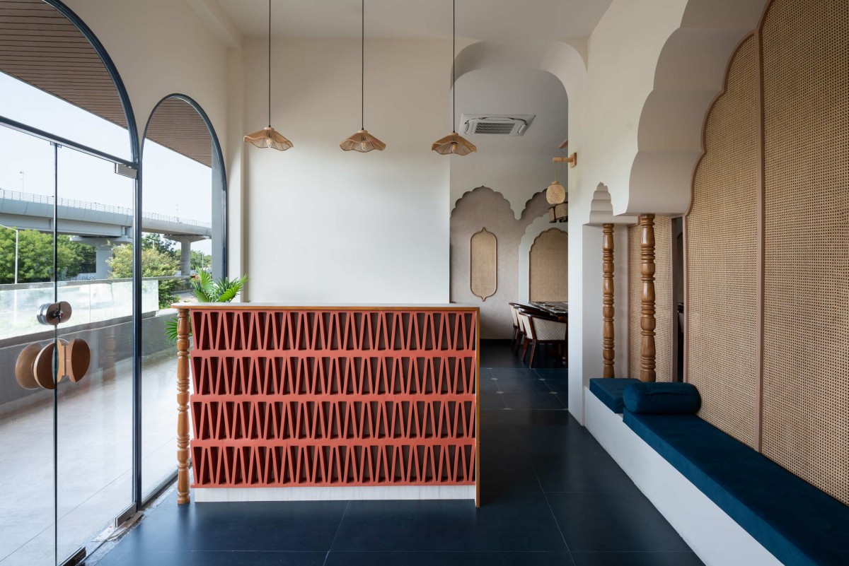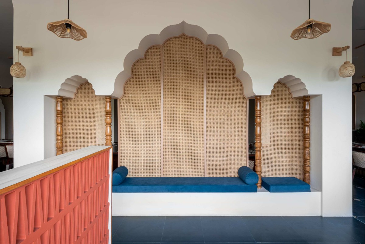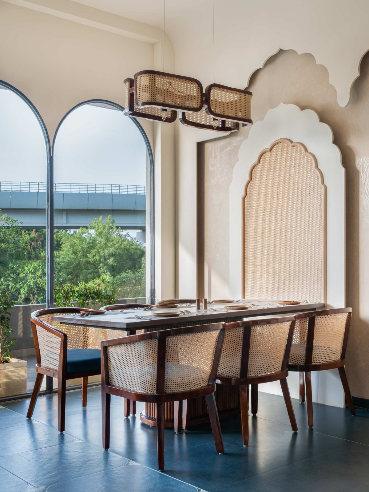 The spatial experience is anchored by a series of scalloped arches, inspired by traditional haveli forms, translated here in a minimalist palette. Cane-clad partitions, turned wooden columns, and curated lighting compositions bring warmth and tactility to the setting, softening the strong geometry of the envelope. The material palette celebrates earthy finishes—terracotta screens, natural cane, polished timber, and muted plaster walls—balanced with pops of teal upholstery to create visual vibrancy.
