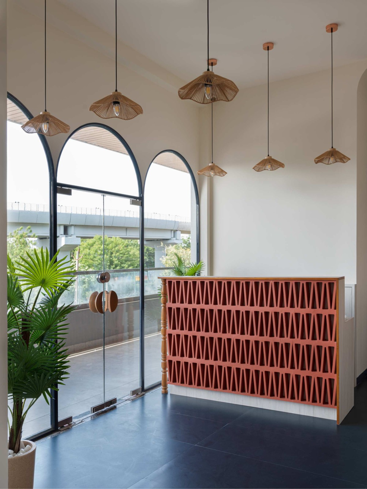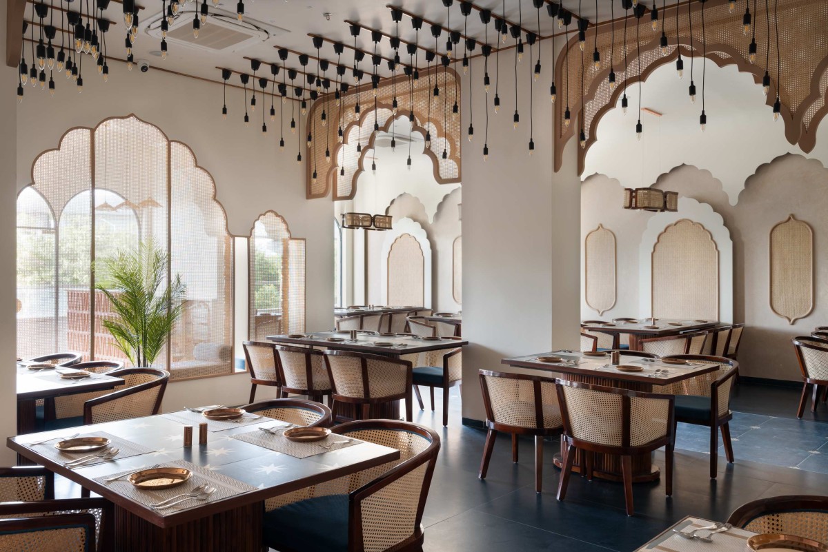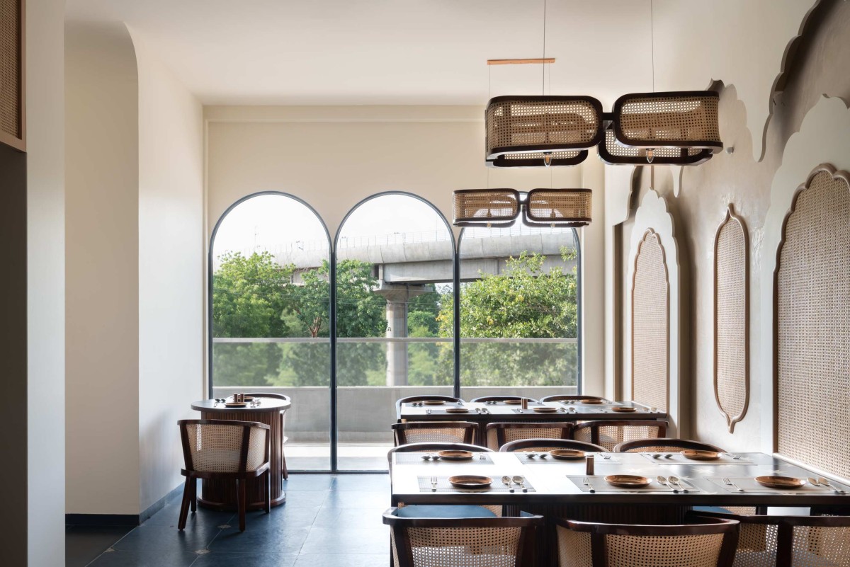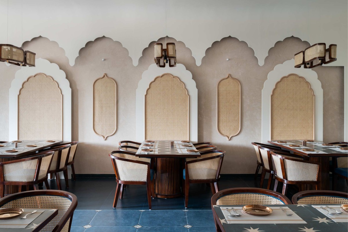The spatial experience is anchored by a series of scalloped arches, inspired by traditional haveli forms, translated here in a minimalist palette. Cane-clad partitions, turned wooden columns, and curated lighting compositions bring warmth and tactility to the setting, softening the strong geometry of the envelope. The material palette celebrates earthy finishes—terracotta screens, natural cane, polished timber, and muted plaster walls—balanced with pops of teal upholstery to create visual vibrancy.