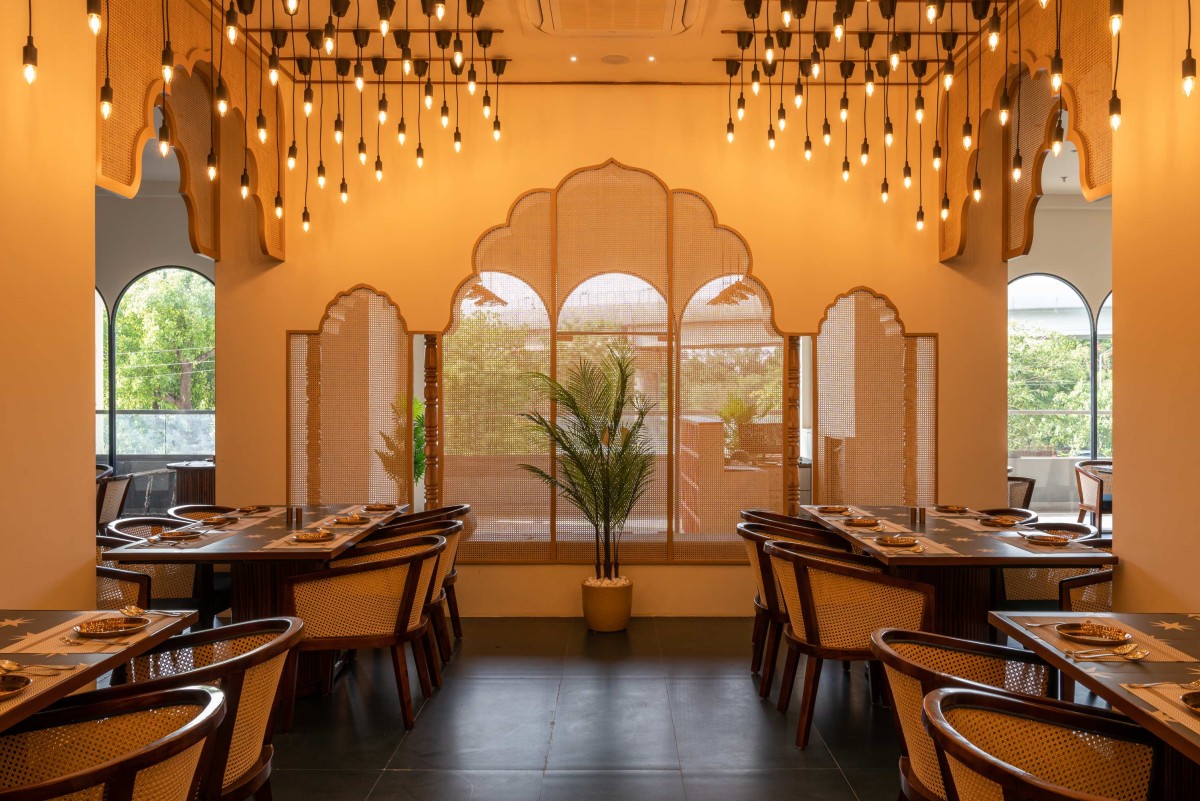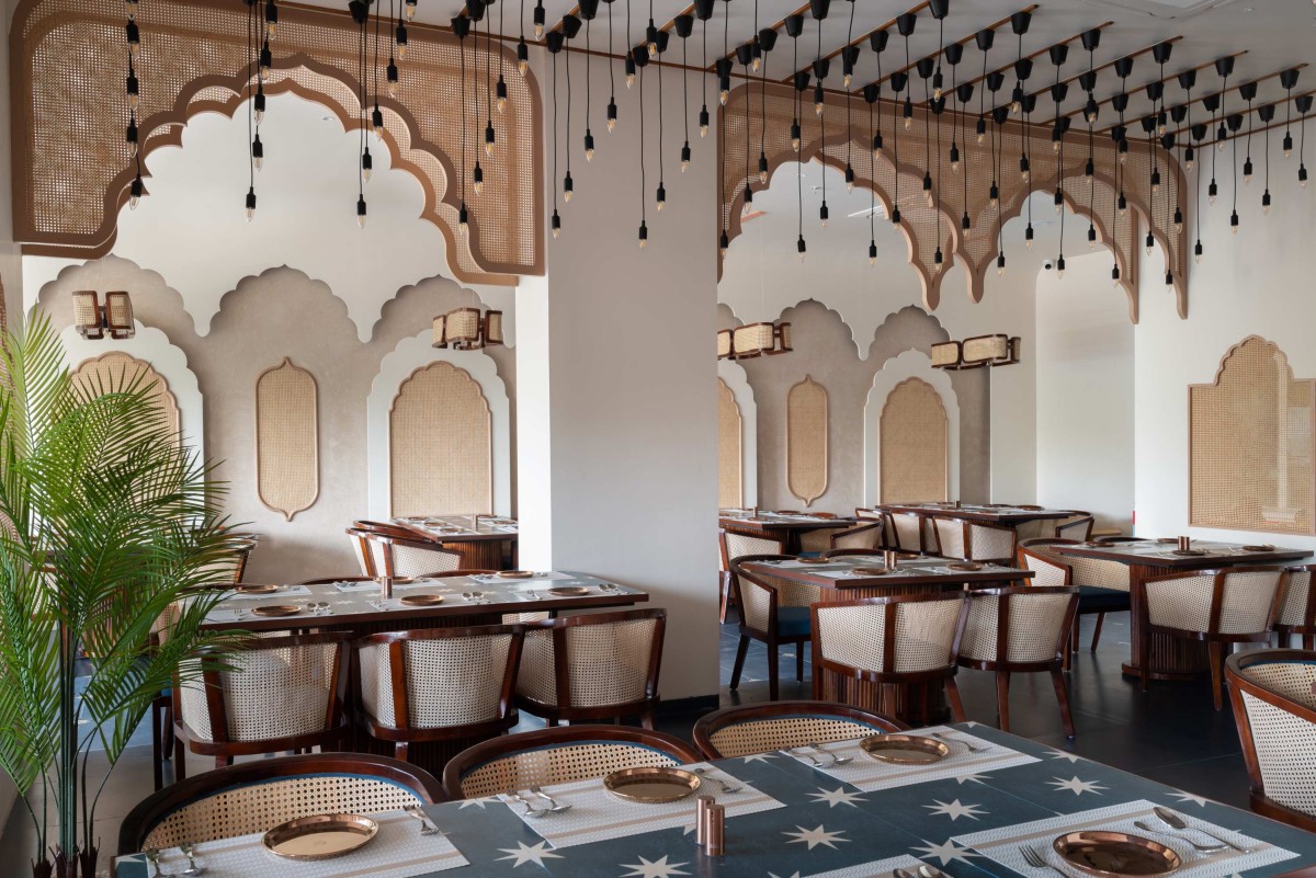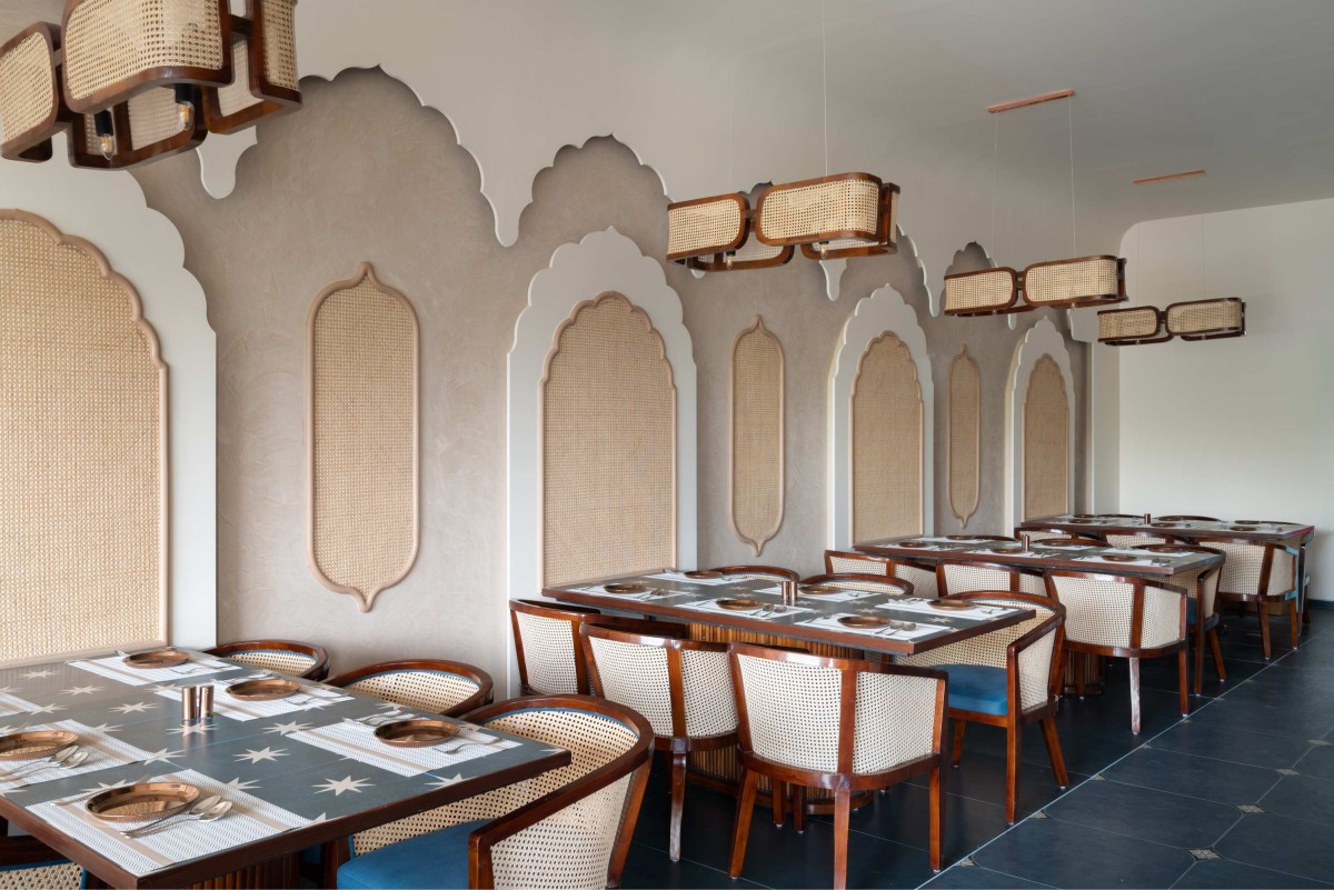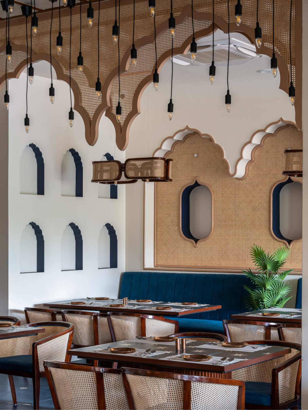 Custom-designed elements form the project’s identity: the patterned reception counter in terracotta modules, fluted bench seating, cane-paneled arches, and suspended cluster lights that create a celebratory ambiance. The tables feature bespoke star-pattern inlays, adding subtle ornamentation without overwhelming the space.