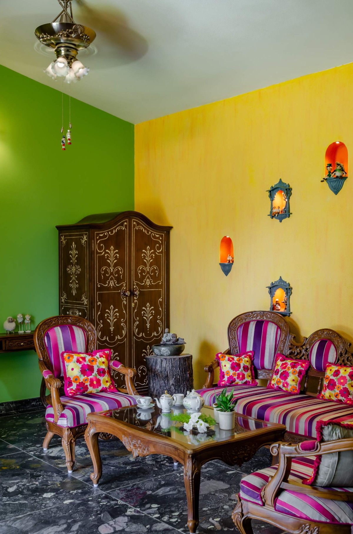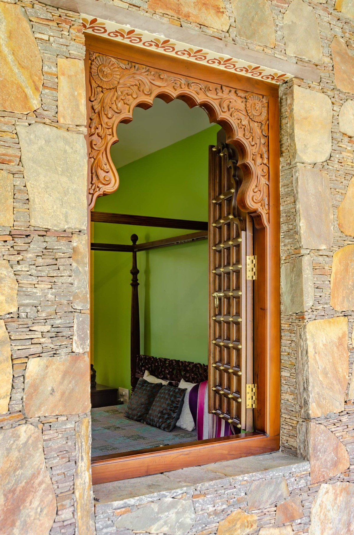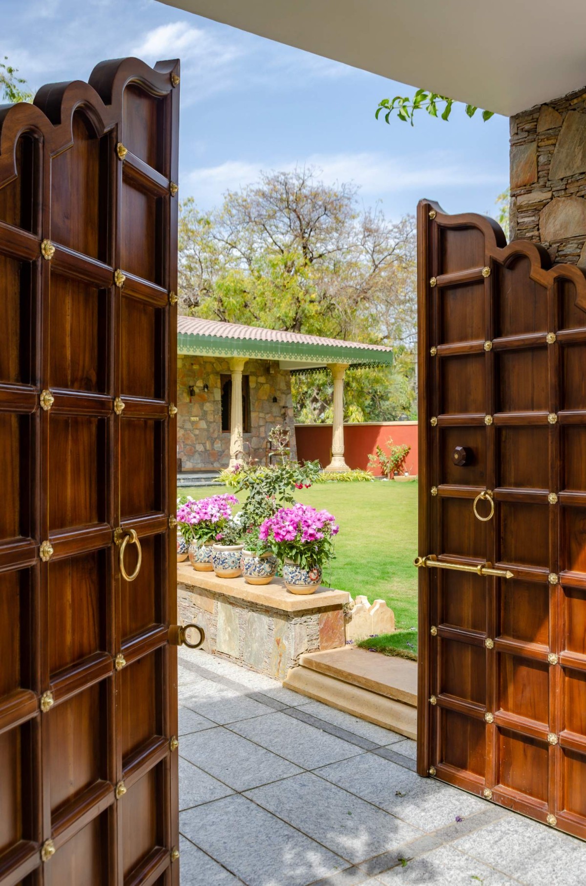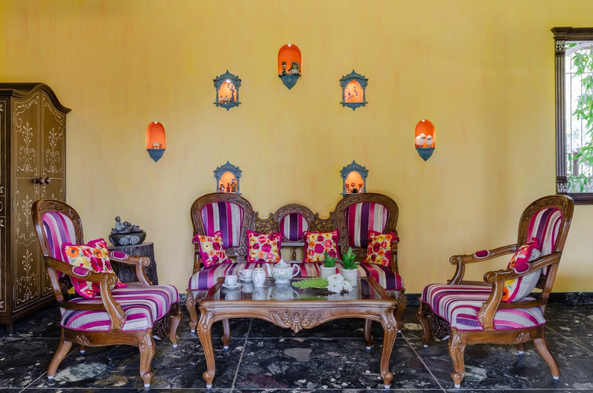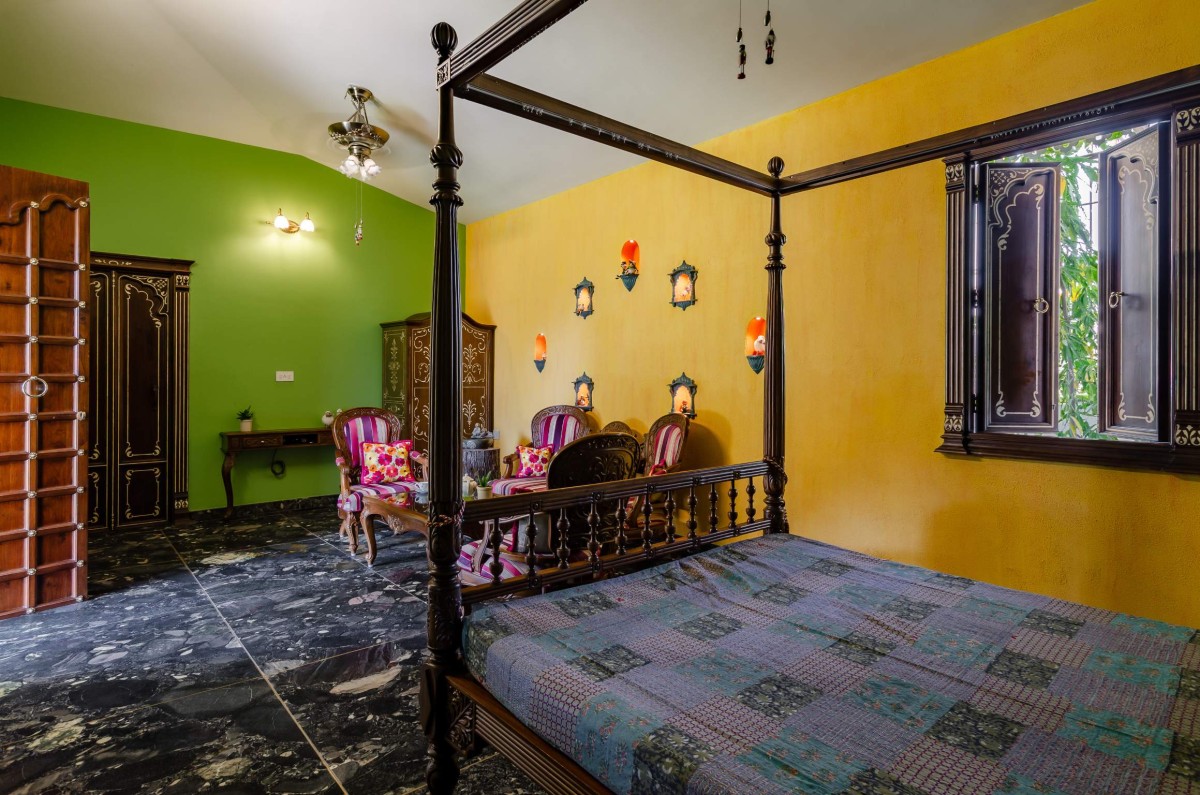 The interiors of outhouse are done in traditional Rajasthani haveli style, along with beautiful exclusive handpicked furniture, with bone inlay work. Colour palette of interiors is quite bright reflecting colors of Rajasthan, complemented with small niches and balanced with subtle exteriors.