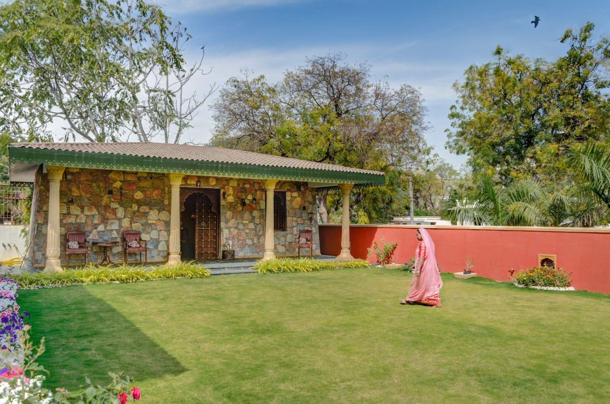 The project outhouse is extension to residence of Mr. Narendra Khamesra, Udaipur, Rajasthan. As every design requirement has a story, so is this, especially extension. Mr. Khamesra wanted to build a recreational and rejuvenation space for his father, as senior Mr. Khamesra started inclining towards outdoors, with his health being major factor, making walks necessary, but in safe environment. Hence, half of the plot left vacant previously, gave ample of space to fulfill the requirement. Senior Mr. Khamesra's choice of vernacular architecture style facilitated with contemporary modern amenities accomplished design guidelines.