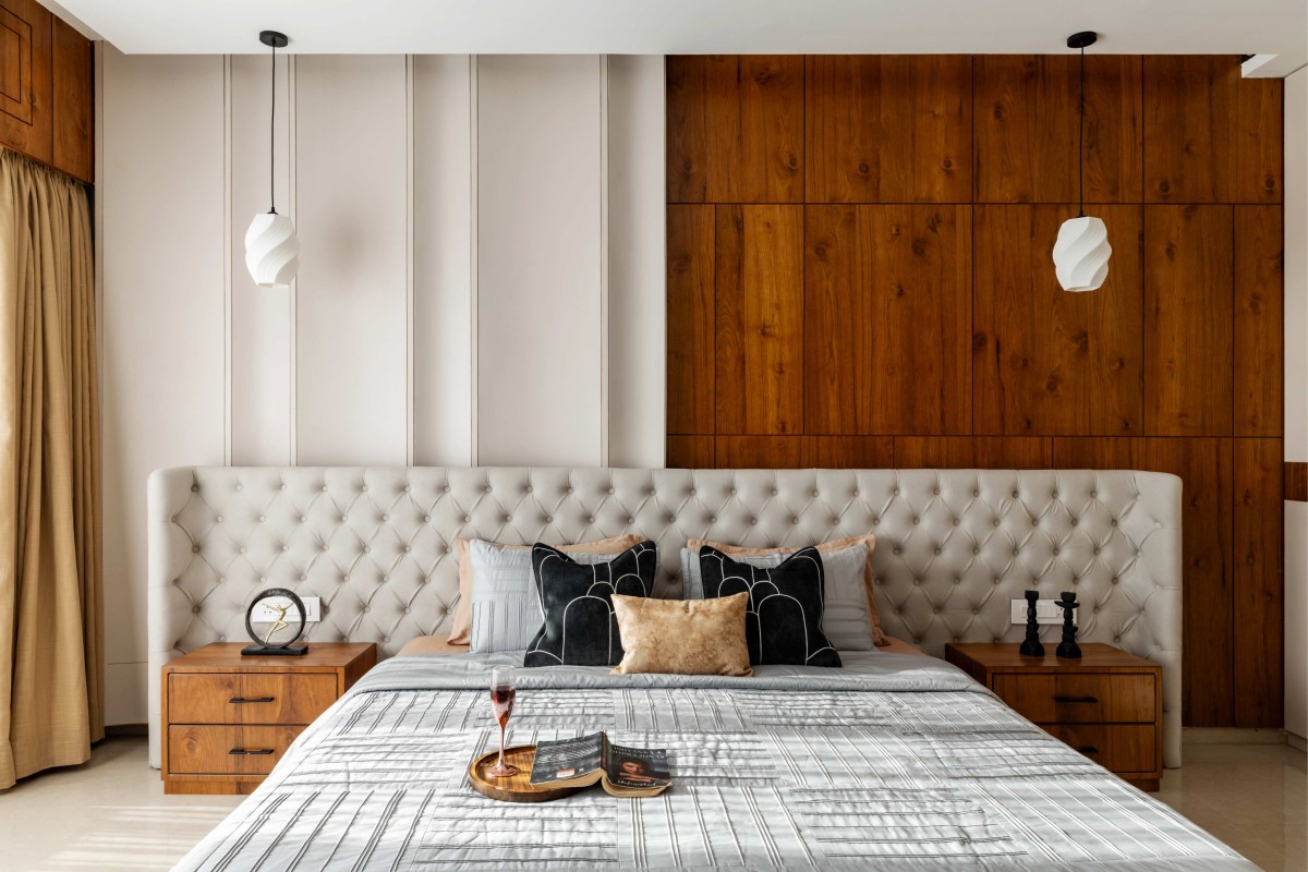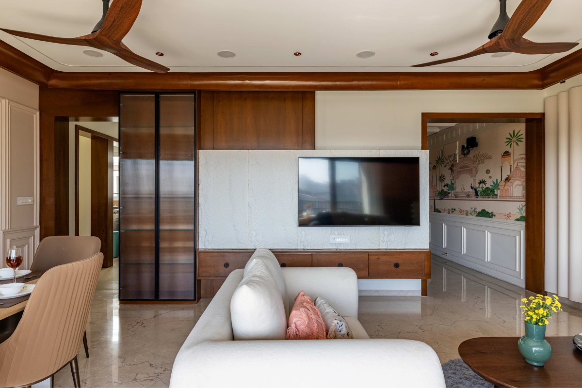 Each of the three bedrooms carries a distinct theme, expressed through varied colour stories, textures, and lighting moods, while maintaining a cohesive design language. The false ceiling design plays a key role across spaces—treated as a visual element rather than a mere functional layer—using modern textures, clean geometric patterns, and indirect lighting to elevate ambience.