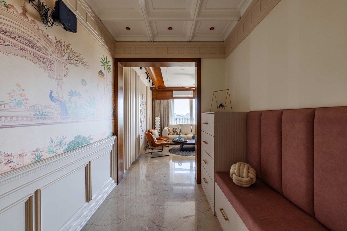 The entrance sets the tone with customised Indian traditional wallpapers, accented with peach and earthy hues, creating a warm and inviting first impression that beautifully bridges tradition and contemporary living.