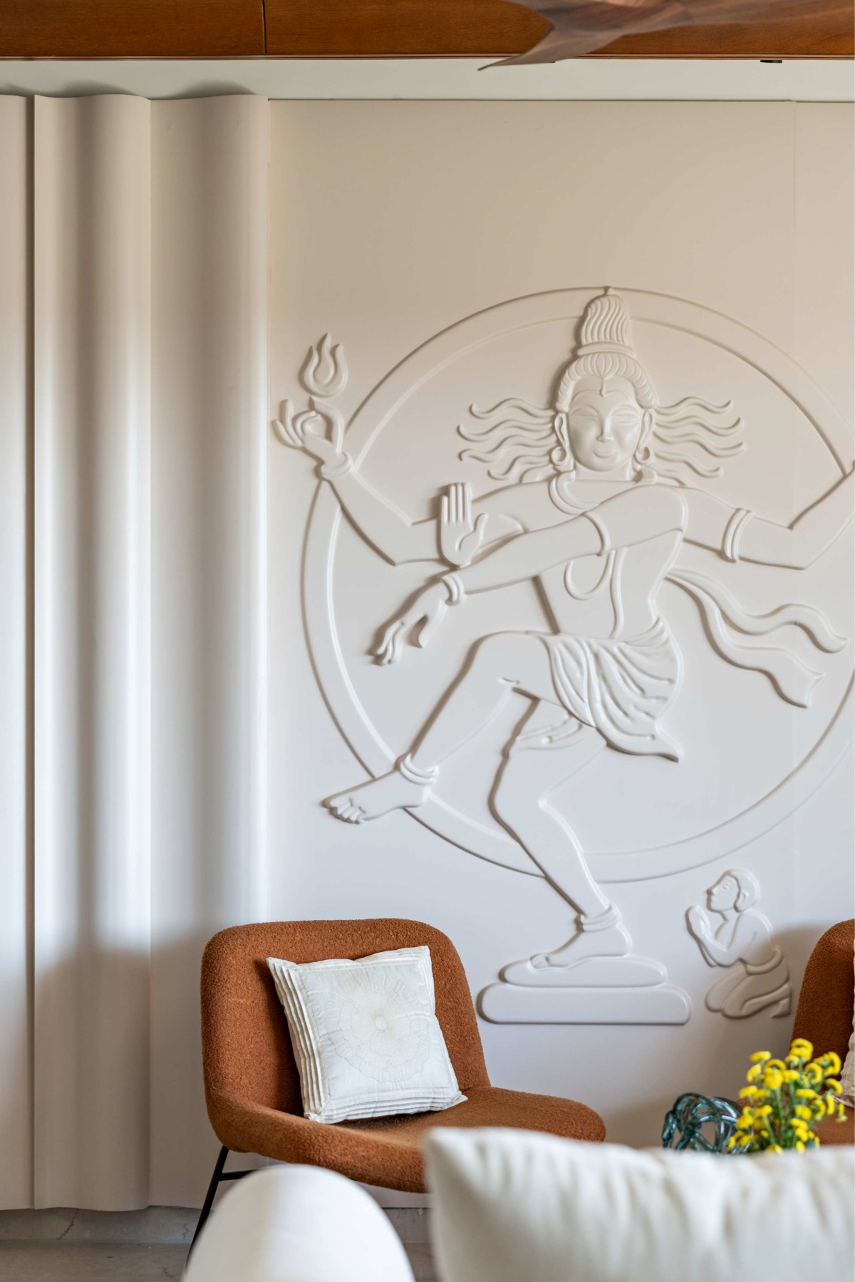 At the heart of the home lies a serene living space conceived as a place of mindfulness and quiet retreat. The defining feature of this area is a thoughtfully integrated Natraj mural, positioned on the main accent wall visible from the entrance. Acting as both a spiritual and visual anchor, the mural introduces movement, rhythm, and meaning while remaining seamlessly aligned with the home’s modern aesthetic. Rather than overpowering the space, it adds a soulful layer that grounds the overall design narrative.