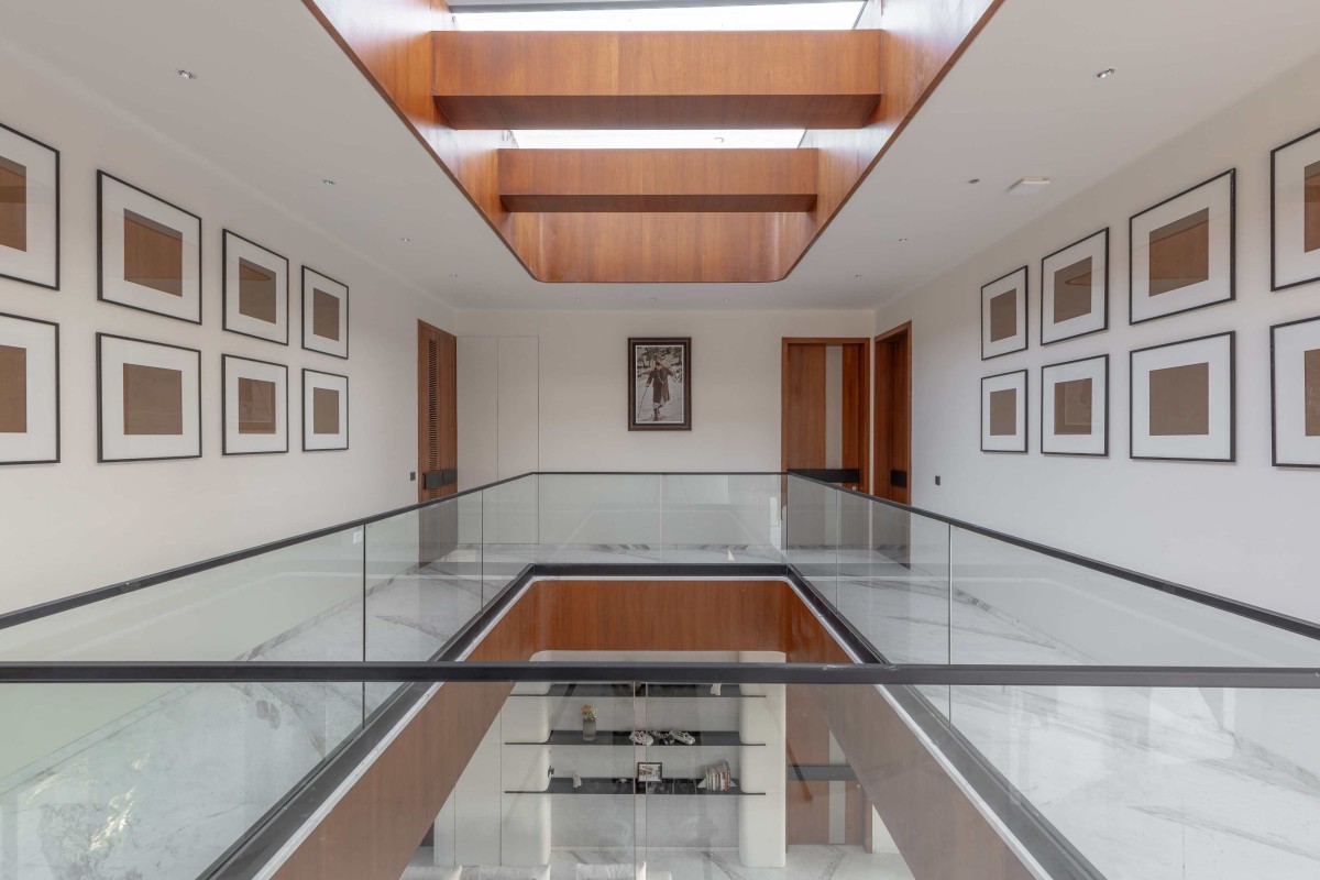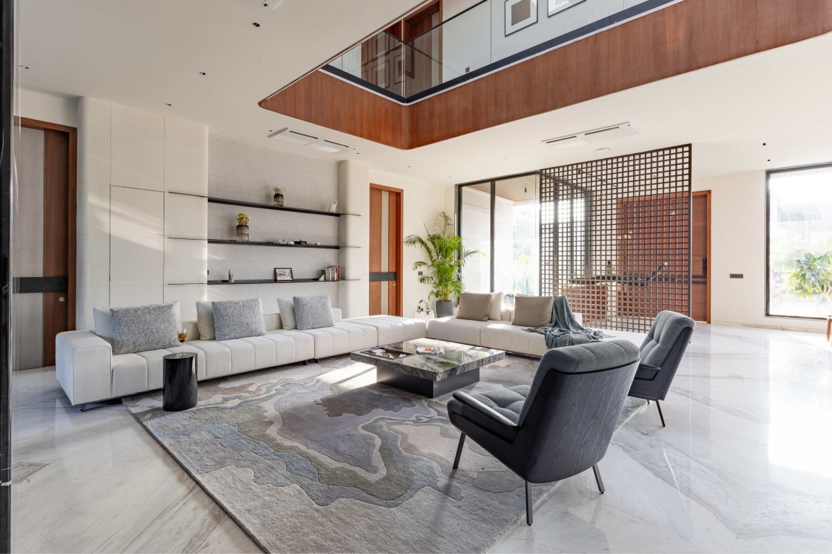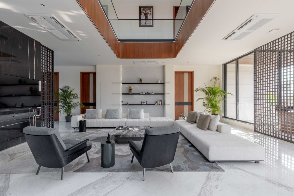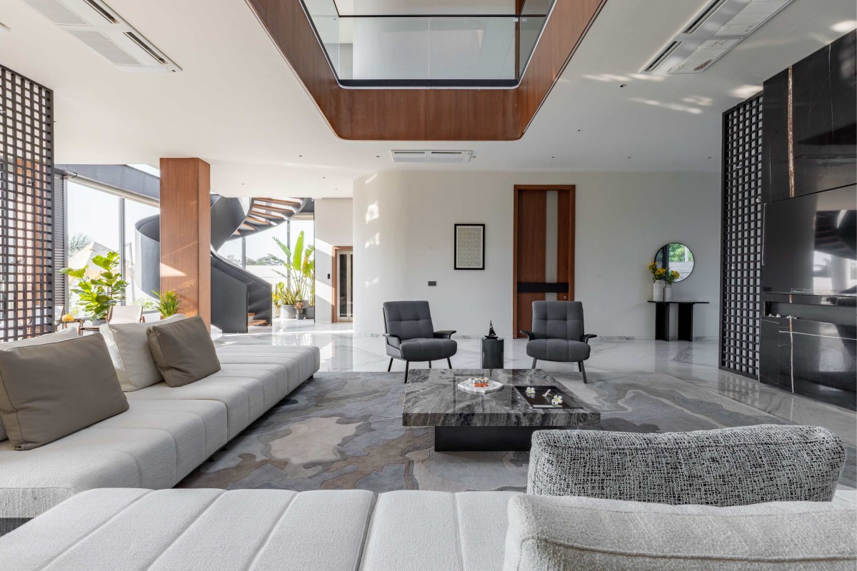 At the heart of the residence lies a dramatic double-height volume defined solely by a skylight. This central light well draws daylight deep into the interiors, creating an ever-changing play of light and shadow while enhancing vertical continuity across floors. The sense of openness here becomes an experiential anchor, grounding the home in light and proportion.
