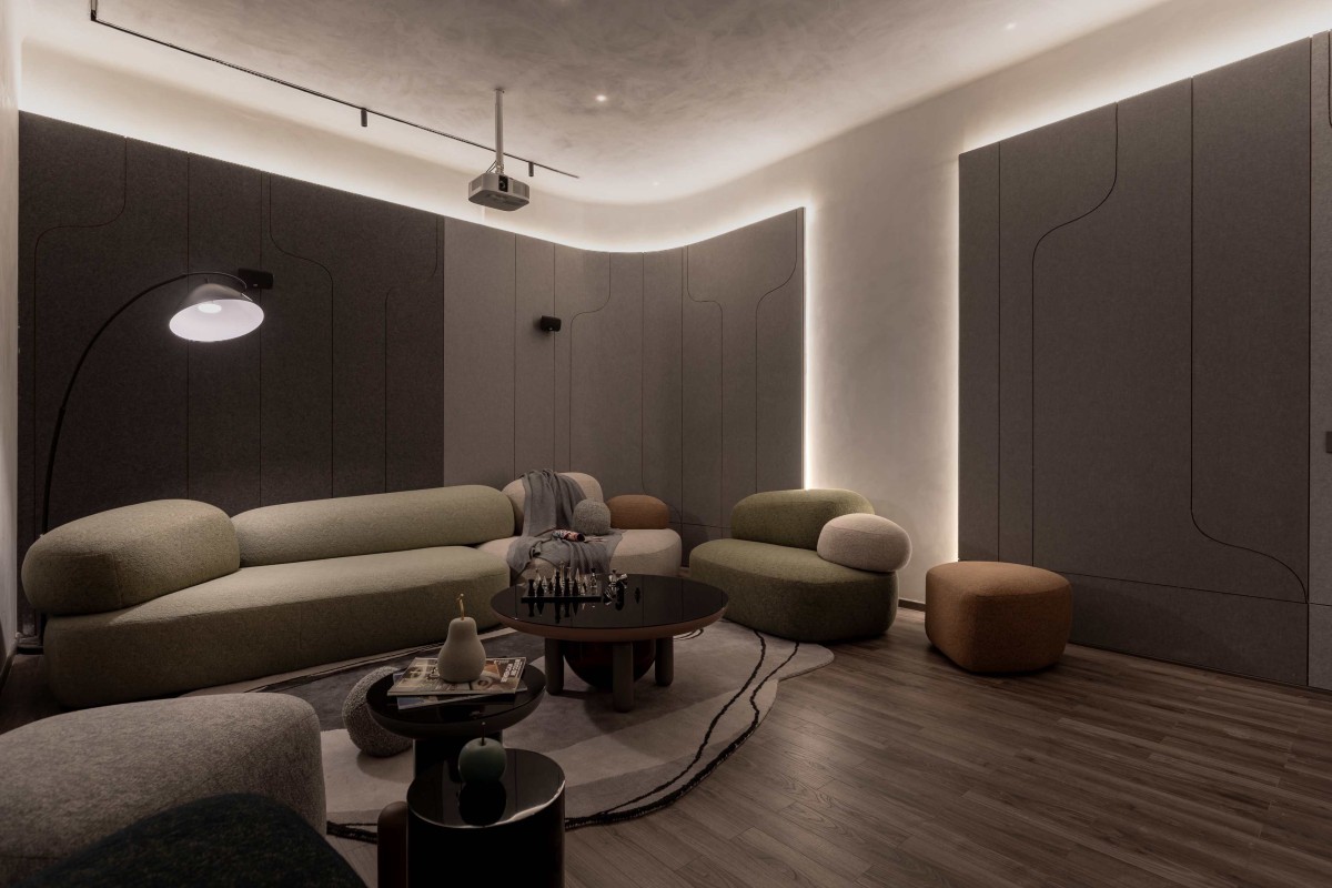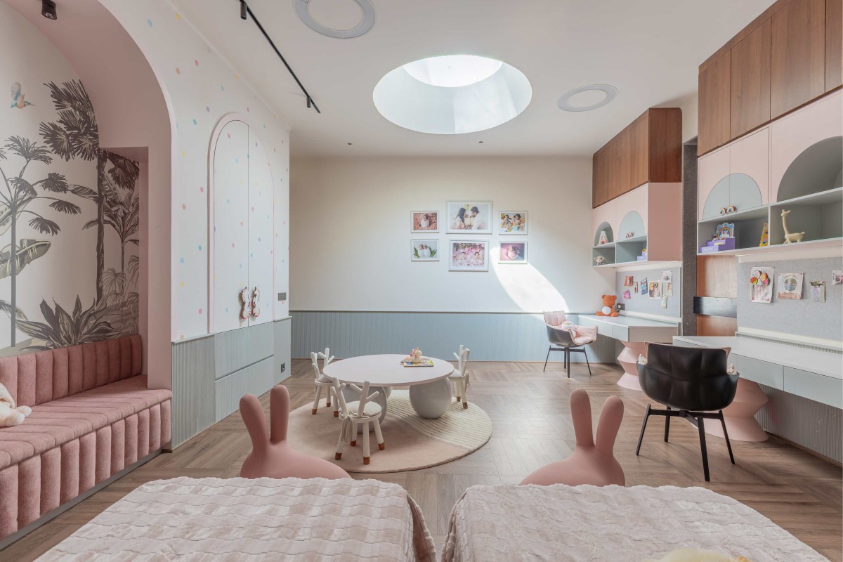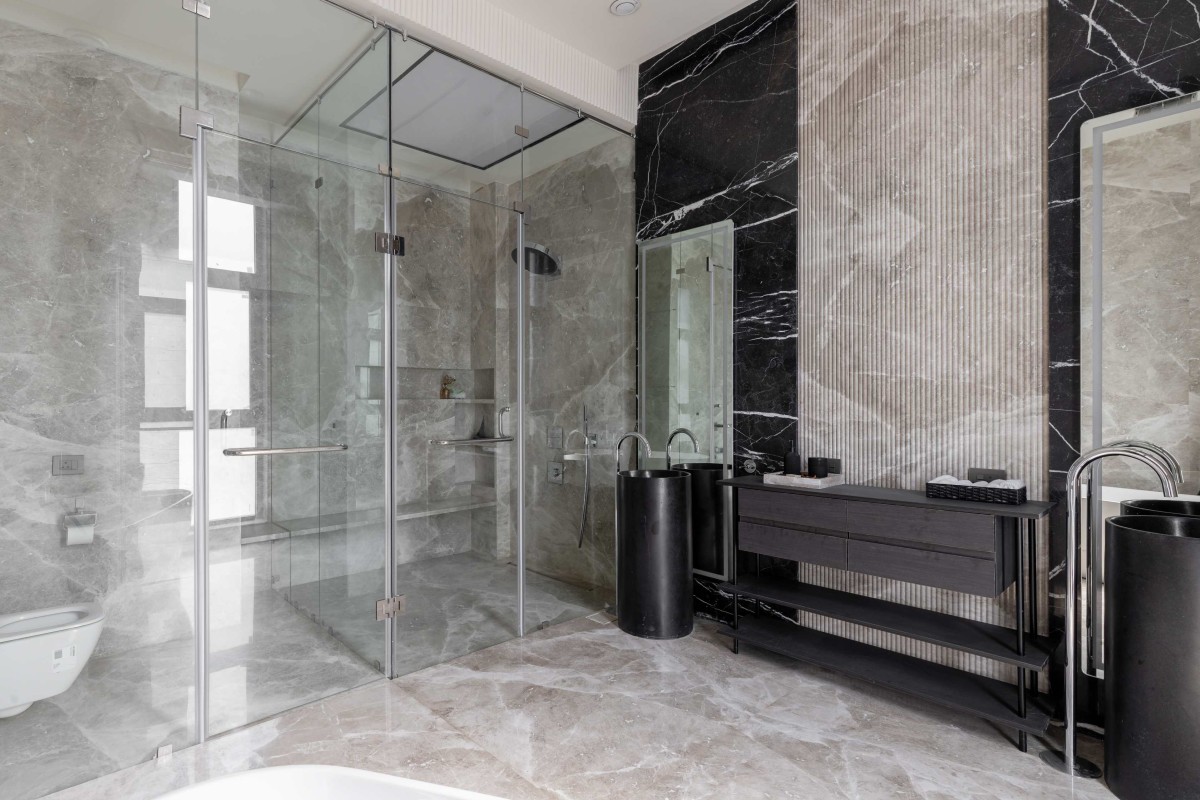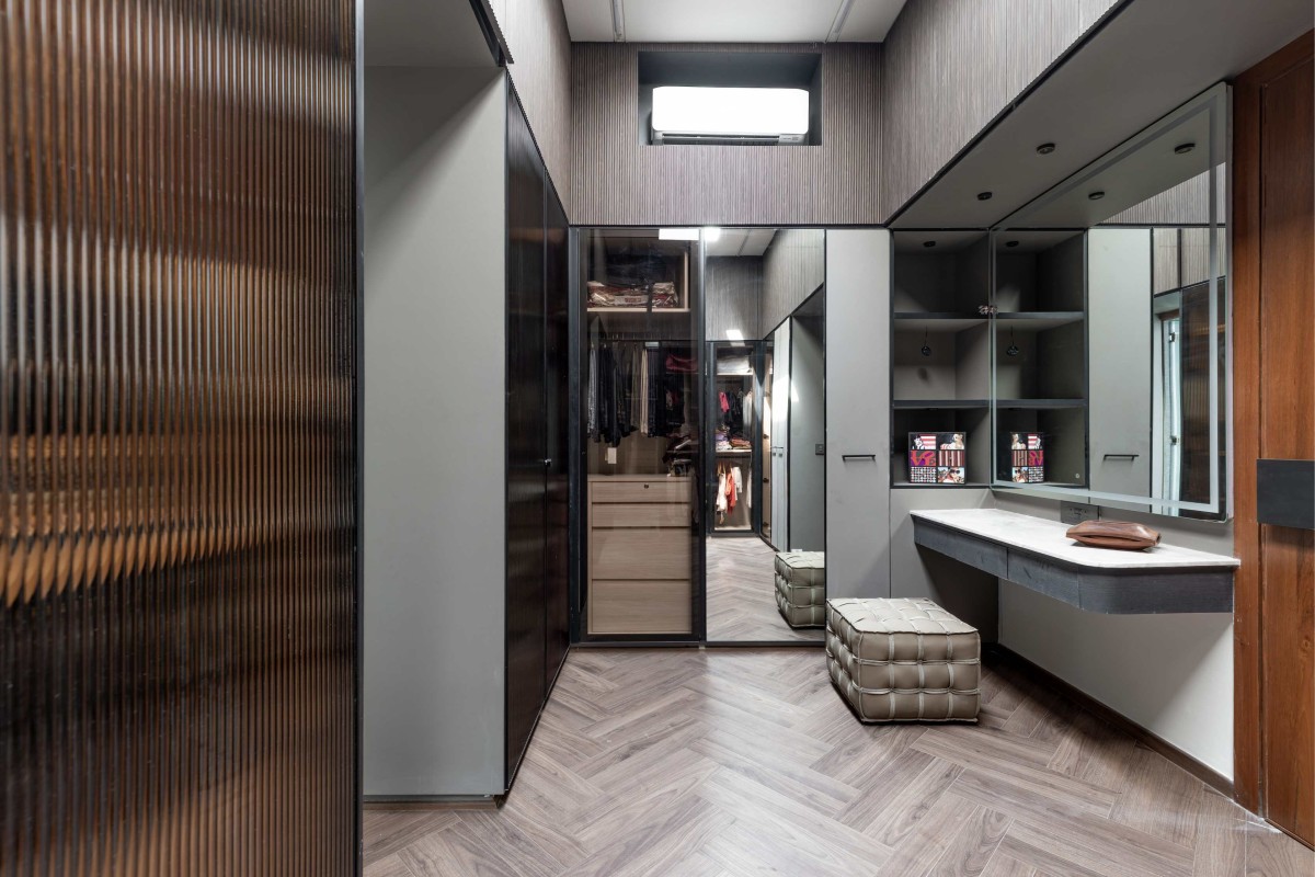 At the heart of the residence lies a dramatic double-height volume defined solely by a skylight. This central light well draws daylight deep into the interiors, creating an ever-changing play of light and shadow while enhancing vertical continuity across floors. The sense of openness here becomes an experiential anchor, grounding the home in light and proportion.