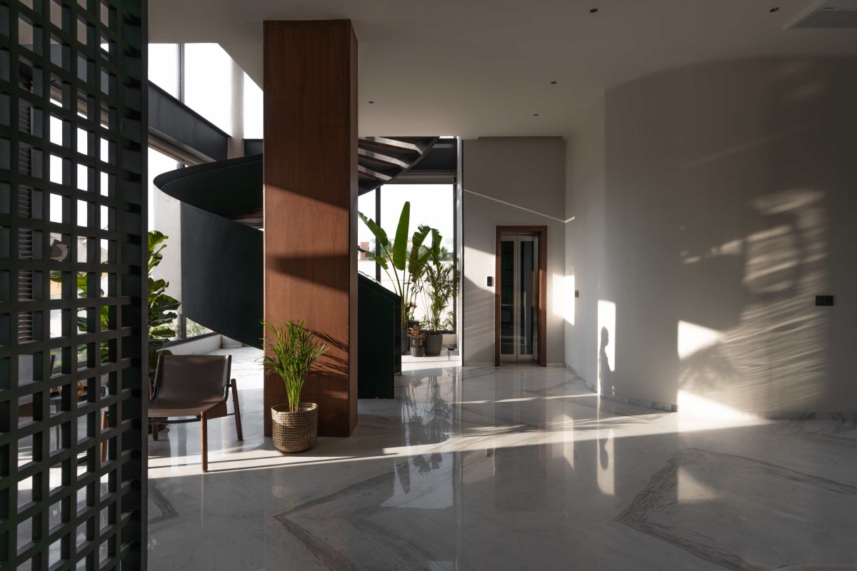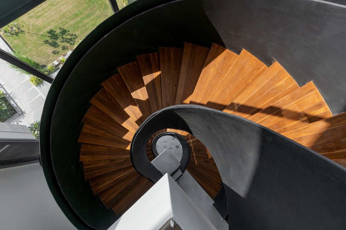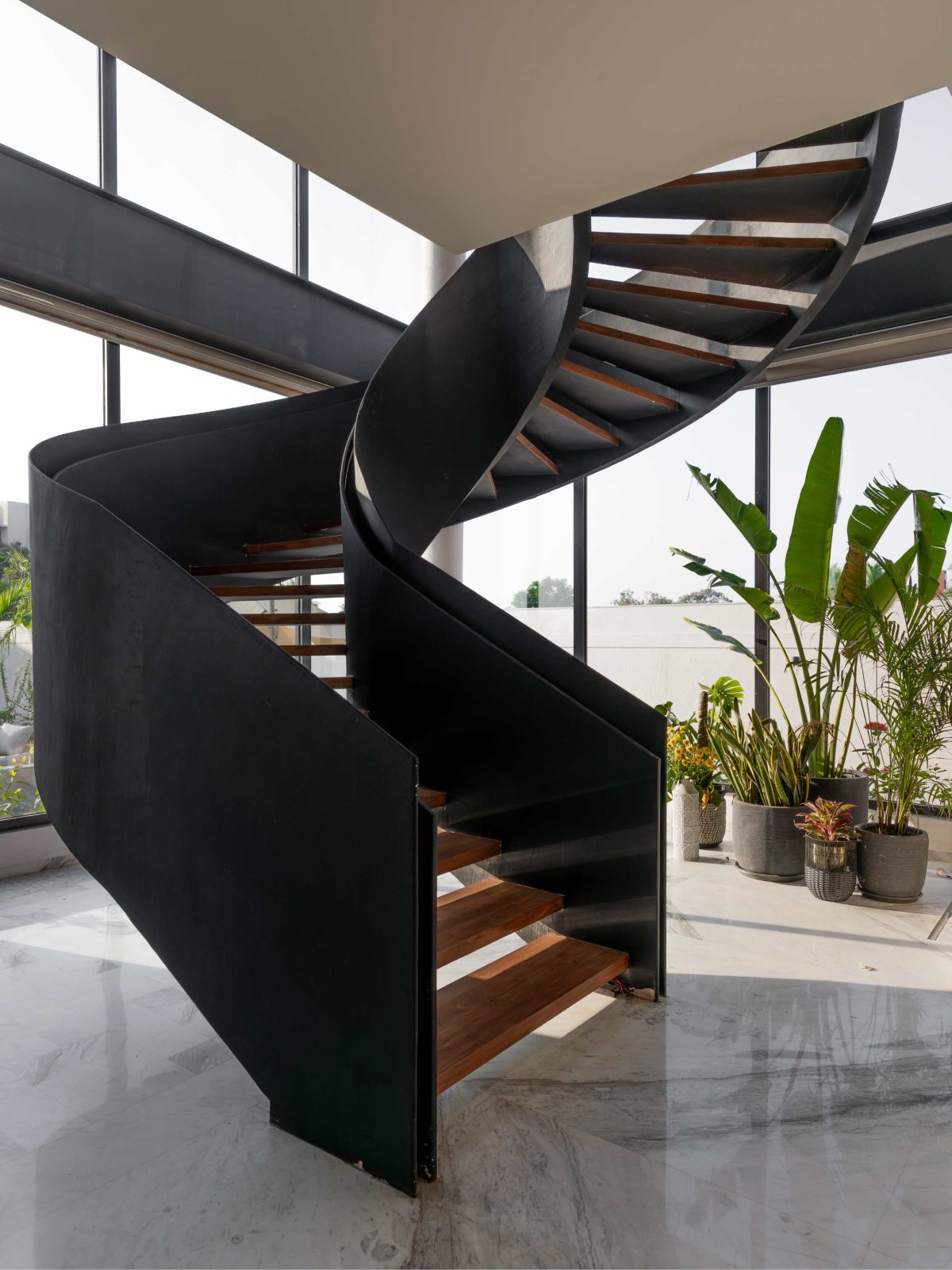 In contrast, the front zone of the house accommodates a sculptural helical staircase rising through a nearly 40-foot-high volume. Serving as both a functional connector and a visual statement, the staircase introduces movement and softness within the otherwise rectilinear framework. Its presence is subtly echoed on the façade through horizontal metal beams that frame the stair zone, offering fleeting glimpses of the curved form behind the louvred screen.