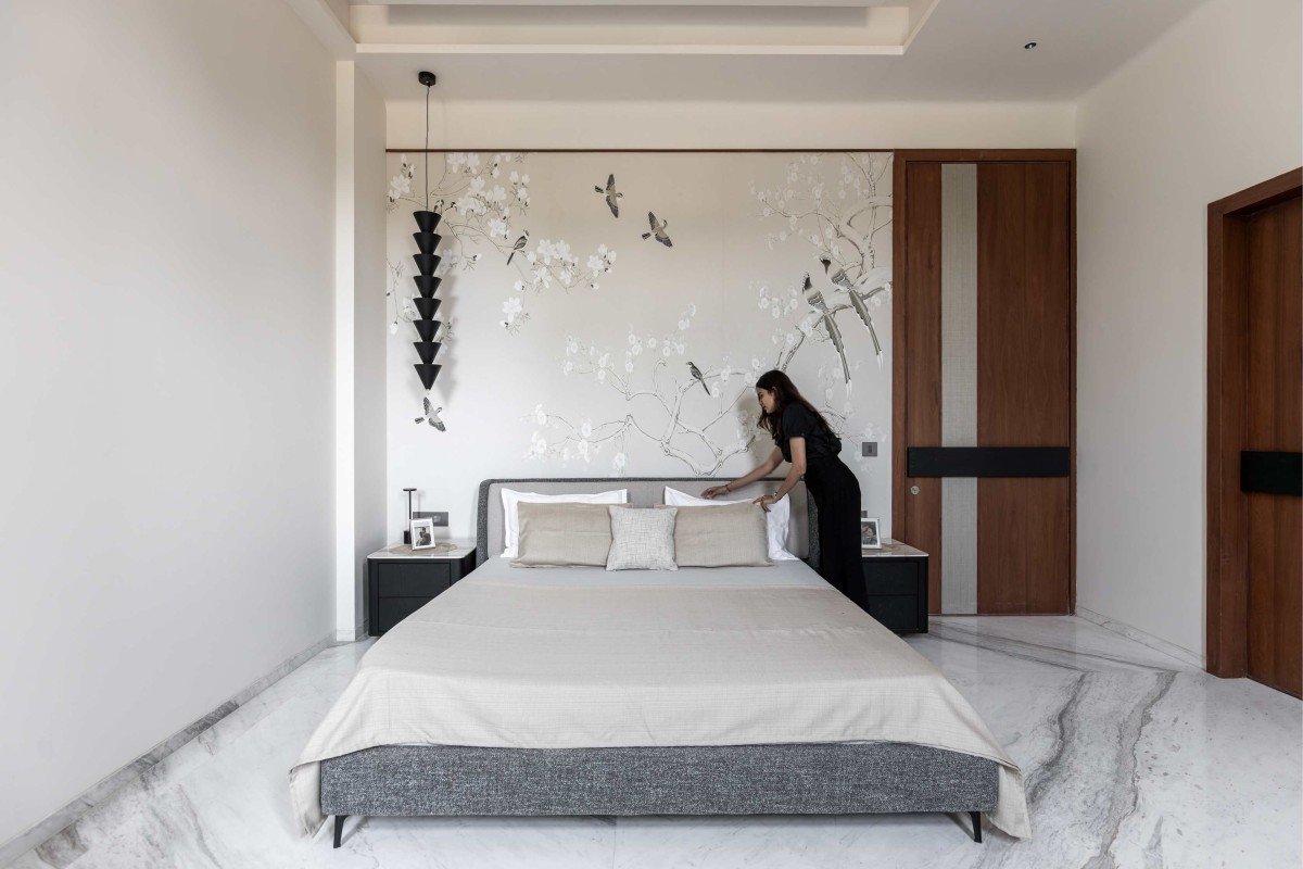 Material choices respond to both climate and comfort cool stone flooring grounds the lower level, while warm wooden flooring above introduces intimacy within private spaces. A predominantly white palette allows form, proportion, and natural light to define character. Concealed services and a recessed terrace water tank ensure visual clarity, reinforcing a home defined not by excess, but by restraint, precision, and timeless architectural intent.