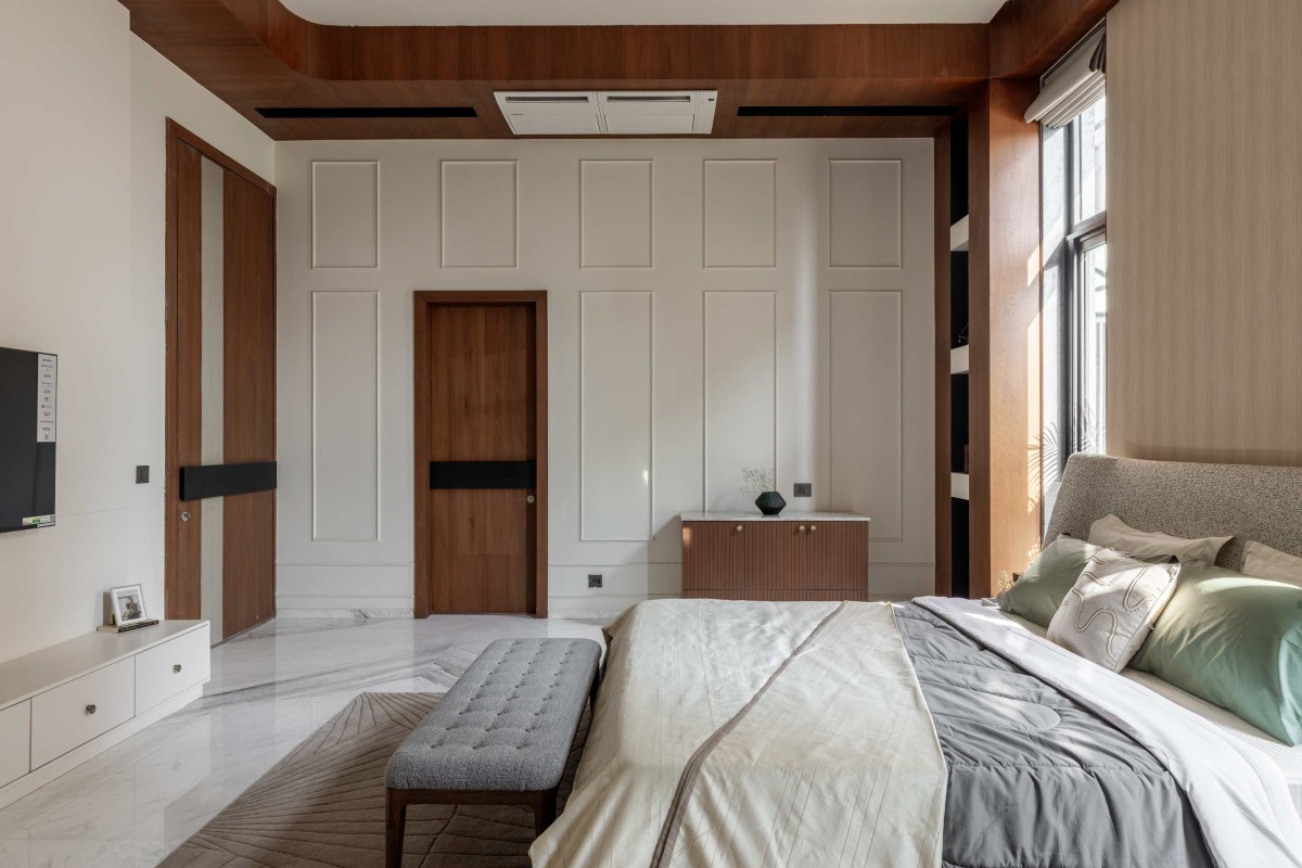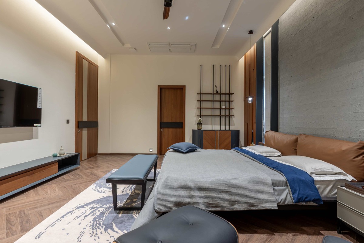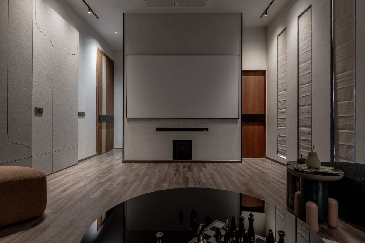 The entrance sequence leads into an artistic foyer, subtly articulated through a refined screen that marks the transition without disrupting visual continuity. Beyond, the home opens into a 30-foot-wide columnless living and dining space, an expansive, fluid volume conceived to support both daily life and larger gatherings. Within this open plan, three pivoting design elements are introduced purely as spatial dividers, intuitively segregating the living and dining zones. One of these incorporates a rotating television unit, allowing flexibility while maintaining seamless connectivity to the kitchen and surrounding spaces.