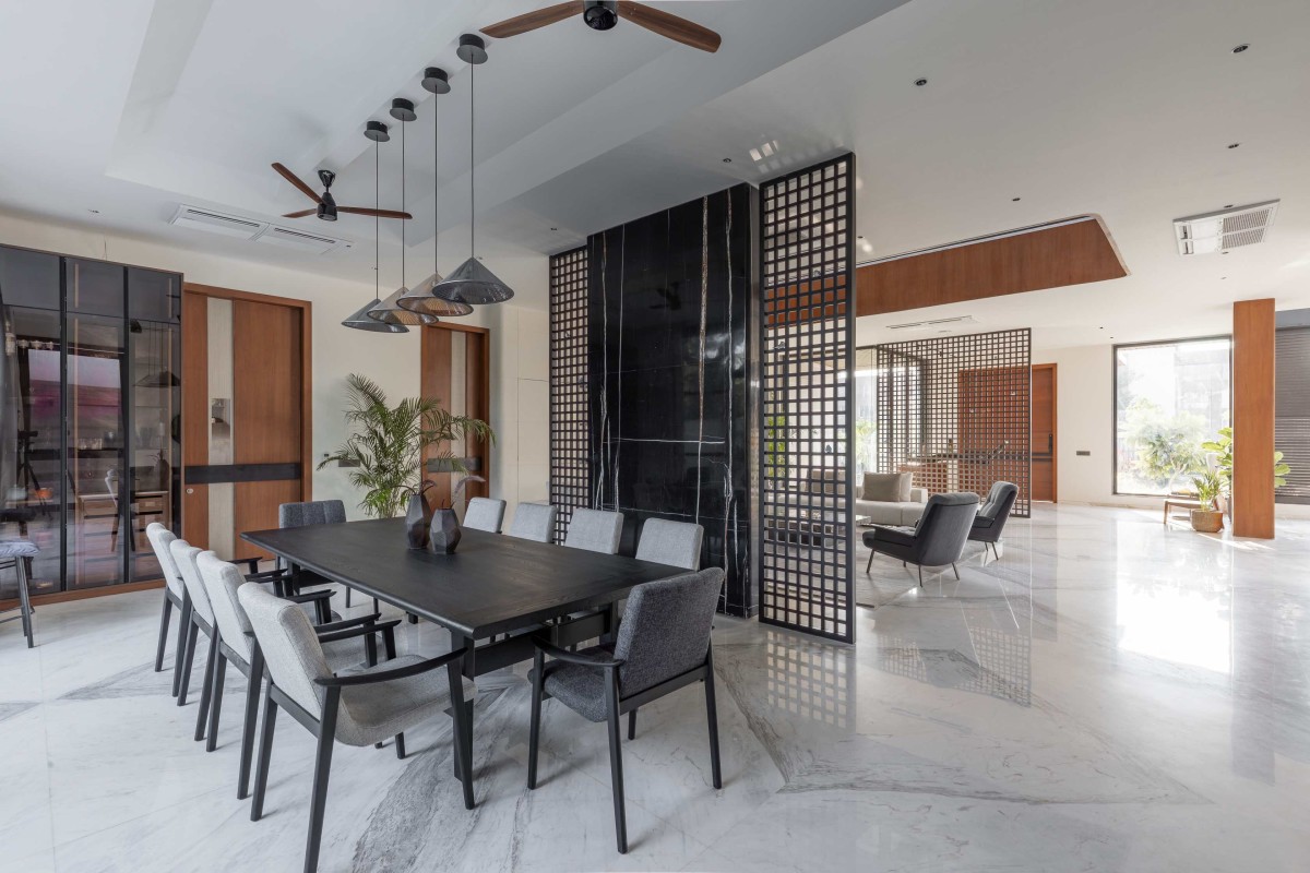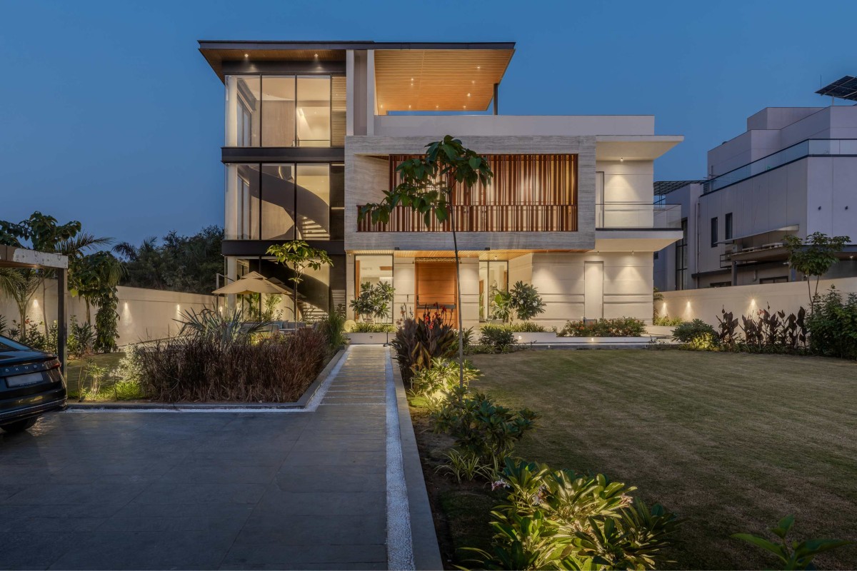 Set behind an expansive open garden court, the house establishes a composed and understated sense of arrival. The landscape is intentionally minimal, allowing the architecture to remain the primary visual focus. Defined by clean lines and rhythmic wooden louvres, the façade negotiates privacy while softening the modern profile. A restrained material palette of metal, glass, wood, stone, and concrete grounds the structure, lending it quiet sophistication and depth.