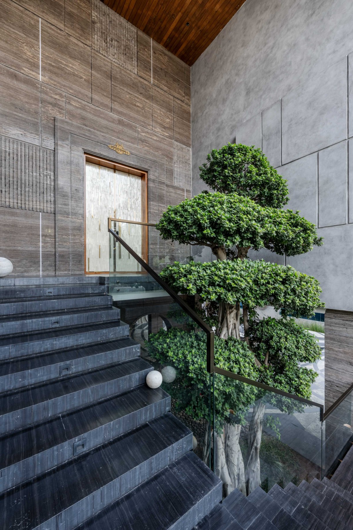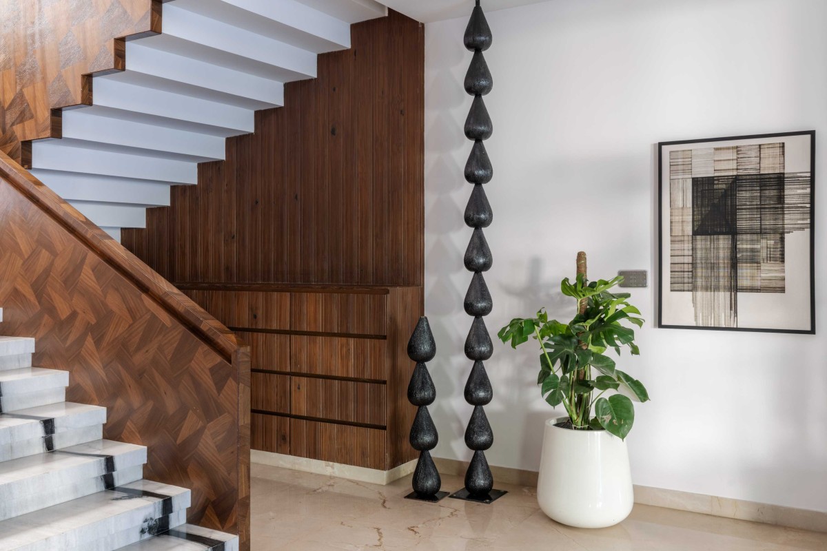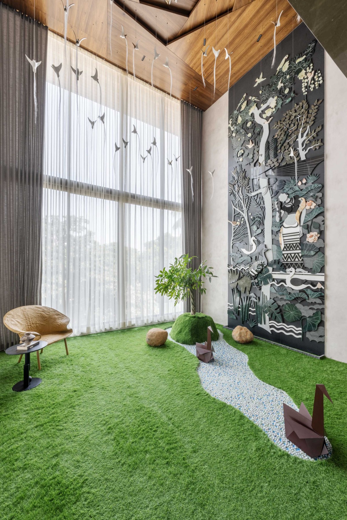 This sit-out is a sanctuary of light and nature, enriched by a mesmerizing stone mural crafted from granite and marble pieces in a tropical motif. An island-like ambiance is achieved with a green mound, white pebbles, and origami birds delicately perched. Above, spiralling bird sculptures ascend from the mural to the wooden ceiling, completing the poetic composition. Inspired by Hamsala Deevi, the client’s coastal hometown, this space is flooded with natural light throughout the day — a distinctive design feature that reduces the need for artificial lighting well into the evening.