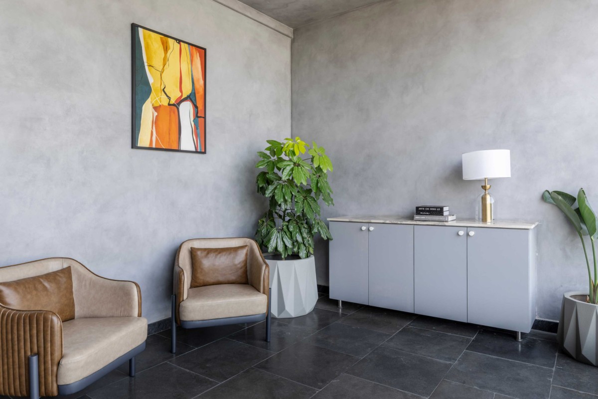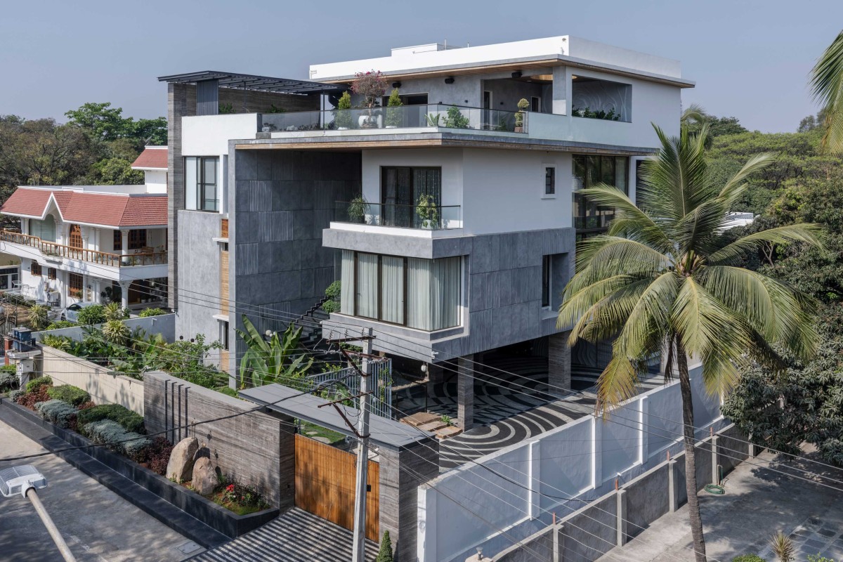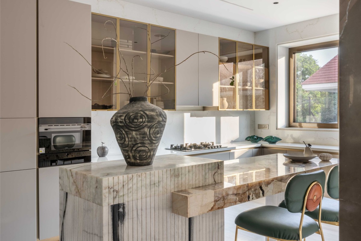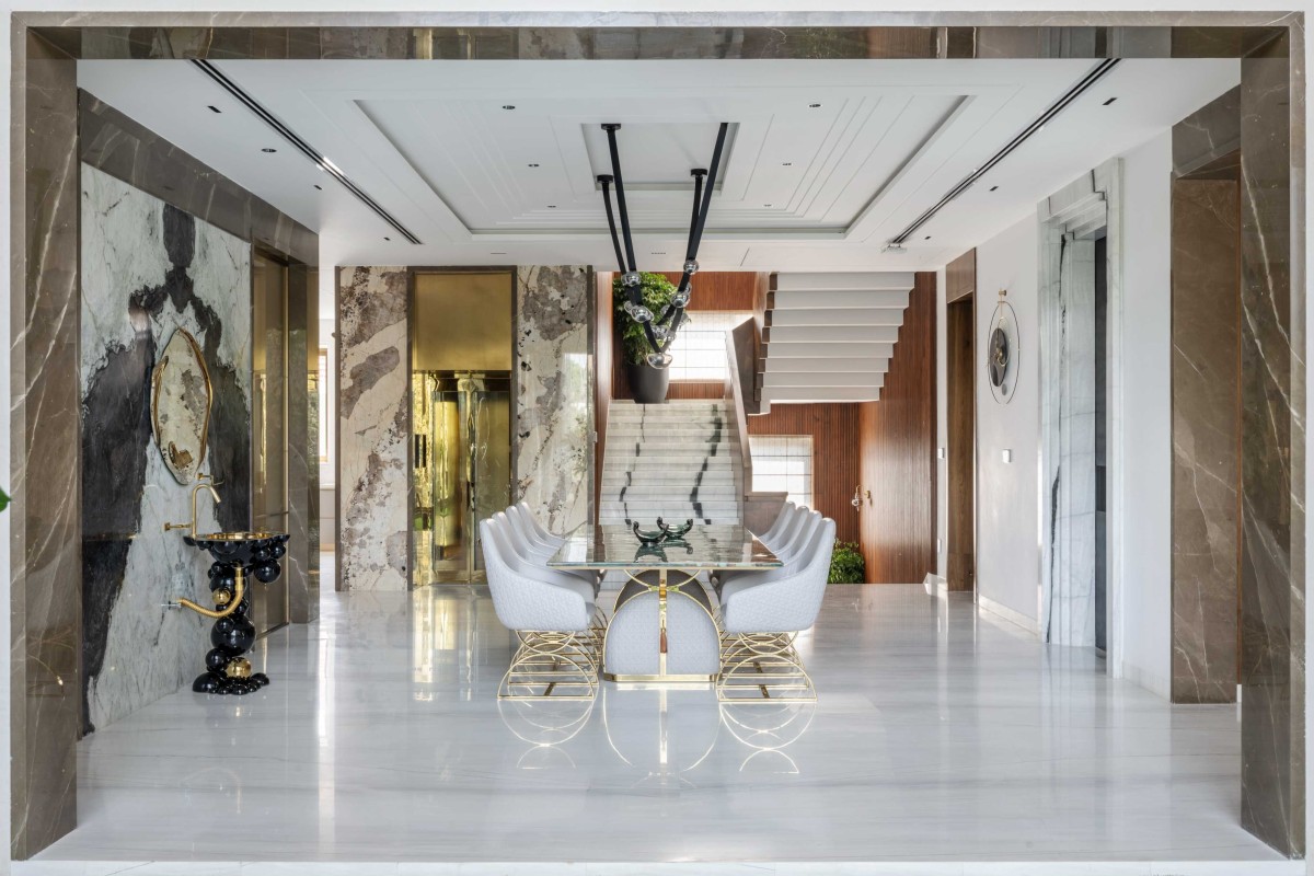 Ascending to the first floor, the foyer introduces brass butterfly accents and a console table. The adjacent drawing room features a grand U-shaped floor-to-ceiling window that overlooks the road, inviting natural light to cascade across the interiors. Behind the foyer, the dining space centers around a stunning 10-seater green quartzite table. One side opens to the lift and staircase, while the opposite side reveals a captivating double-height sit-out — the residence’s beating heart.