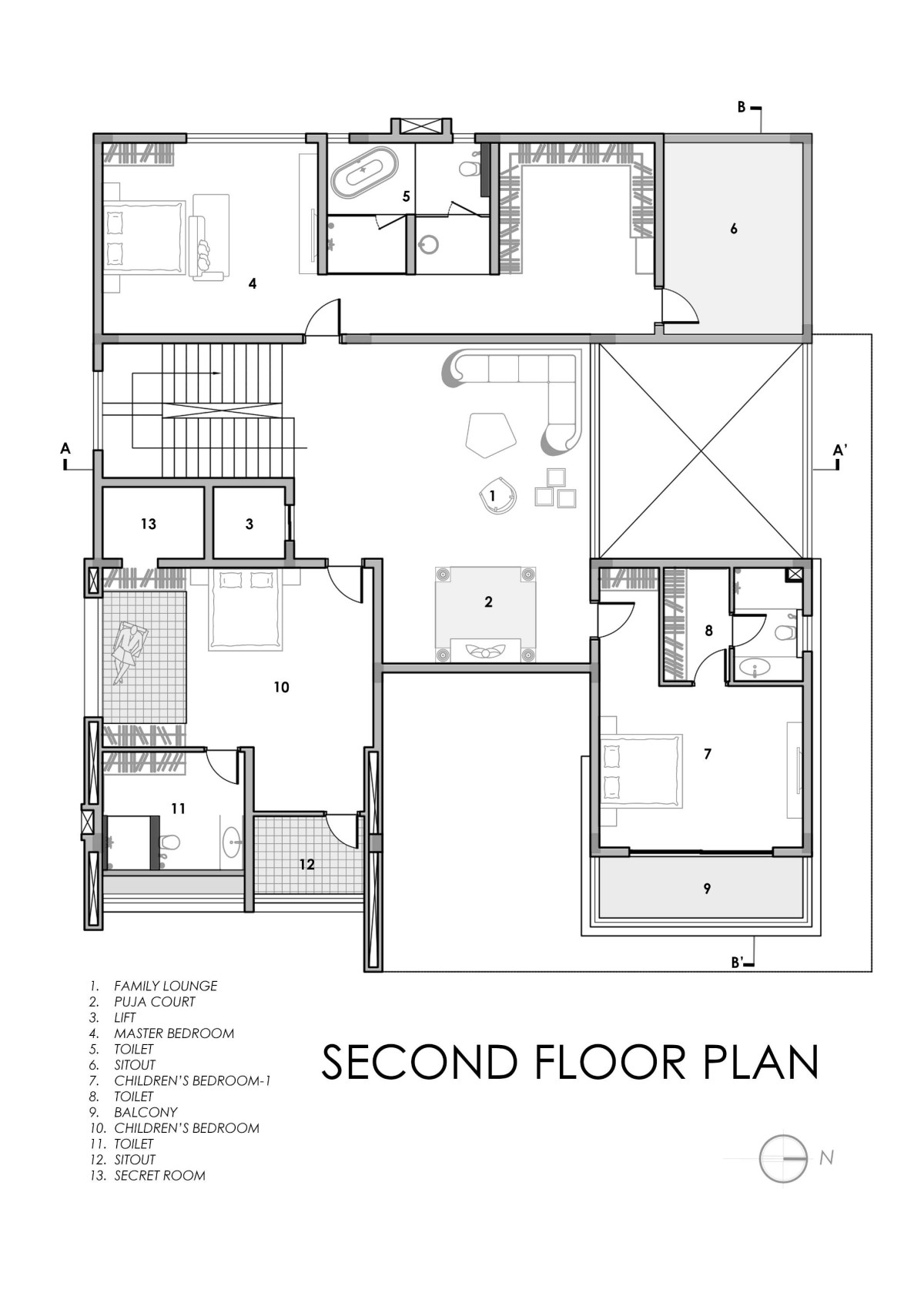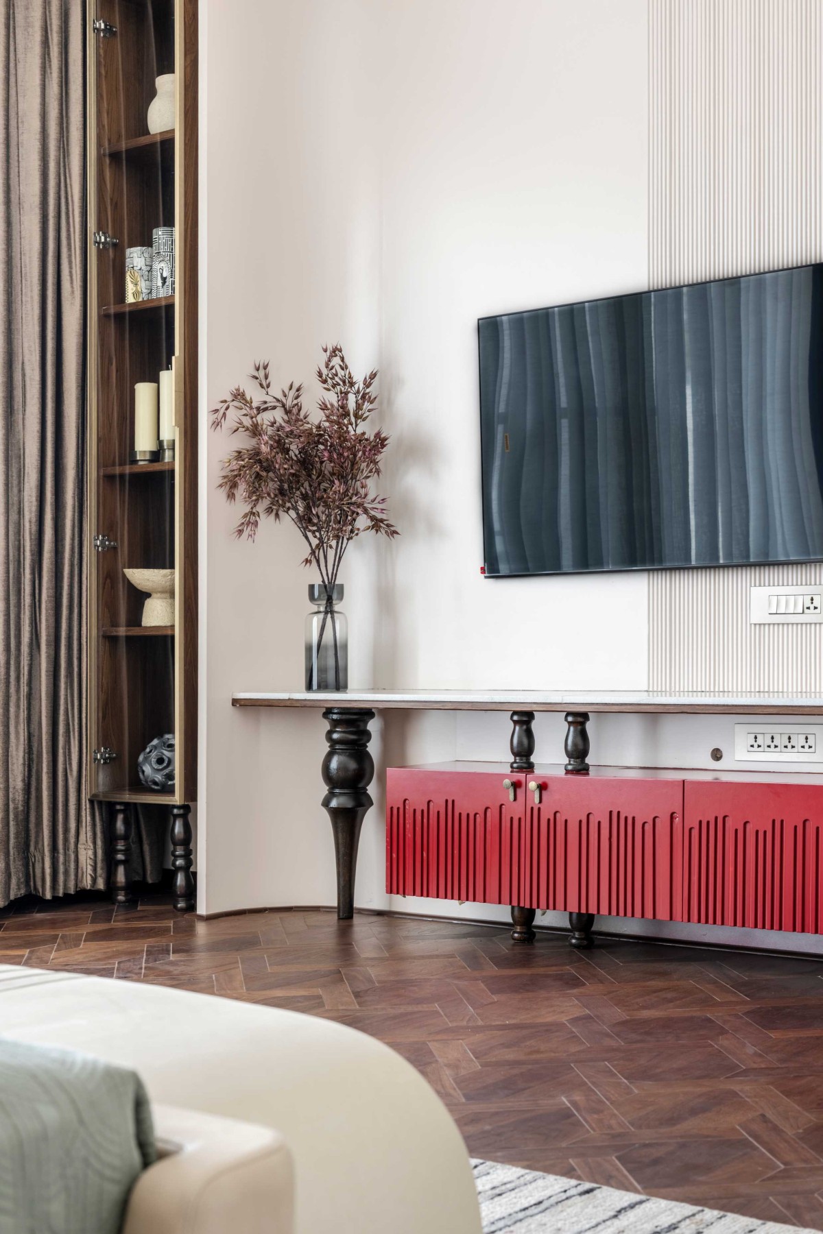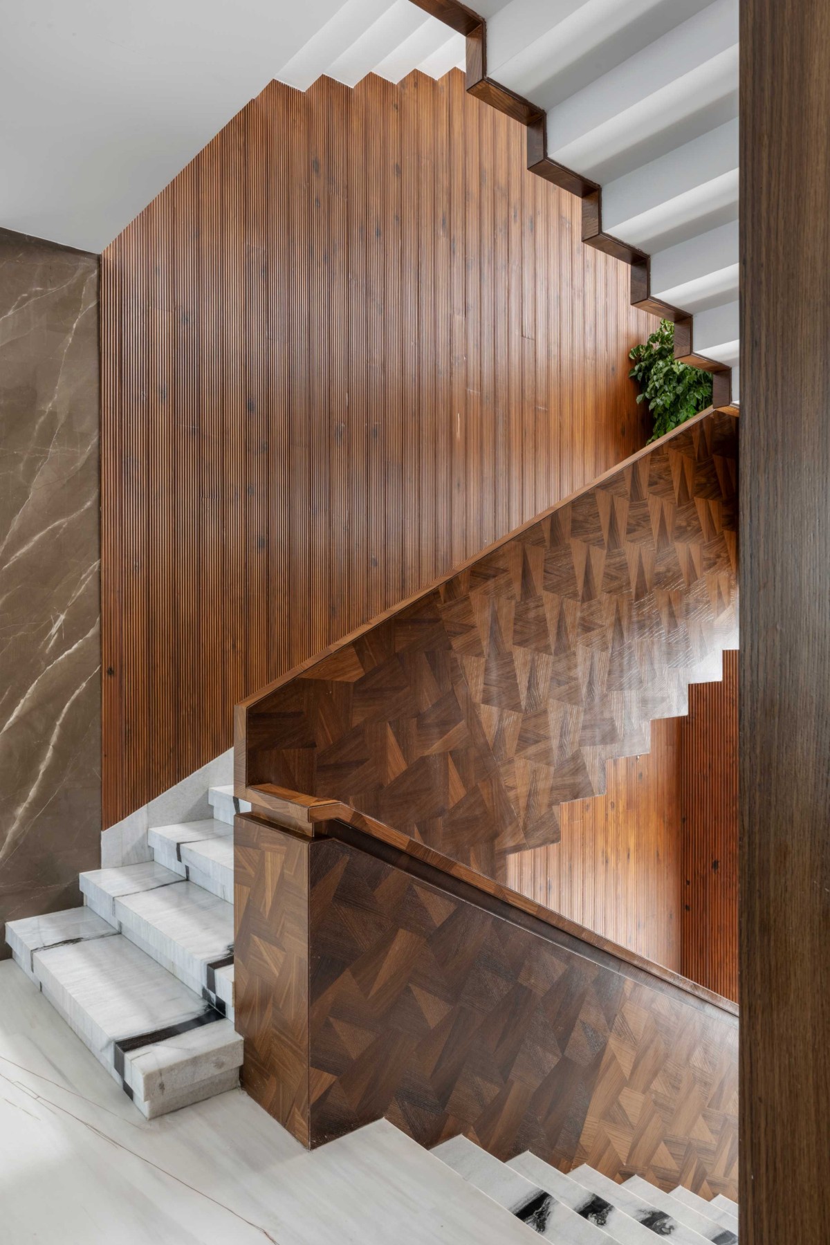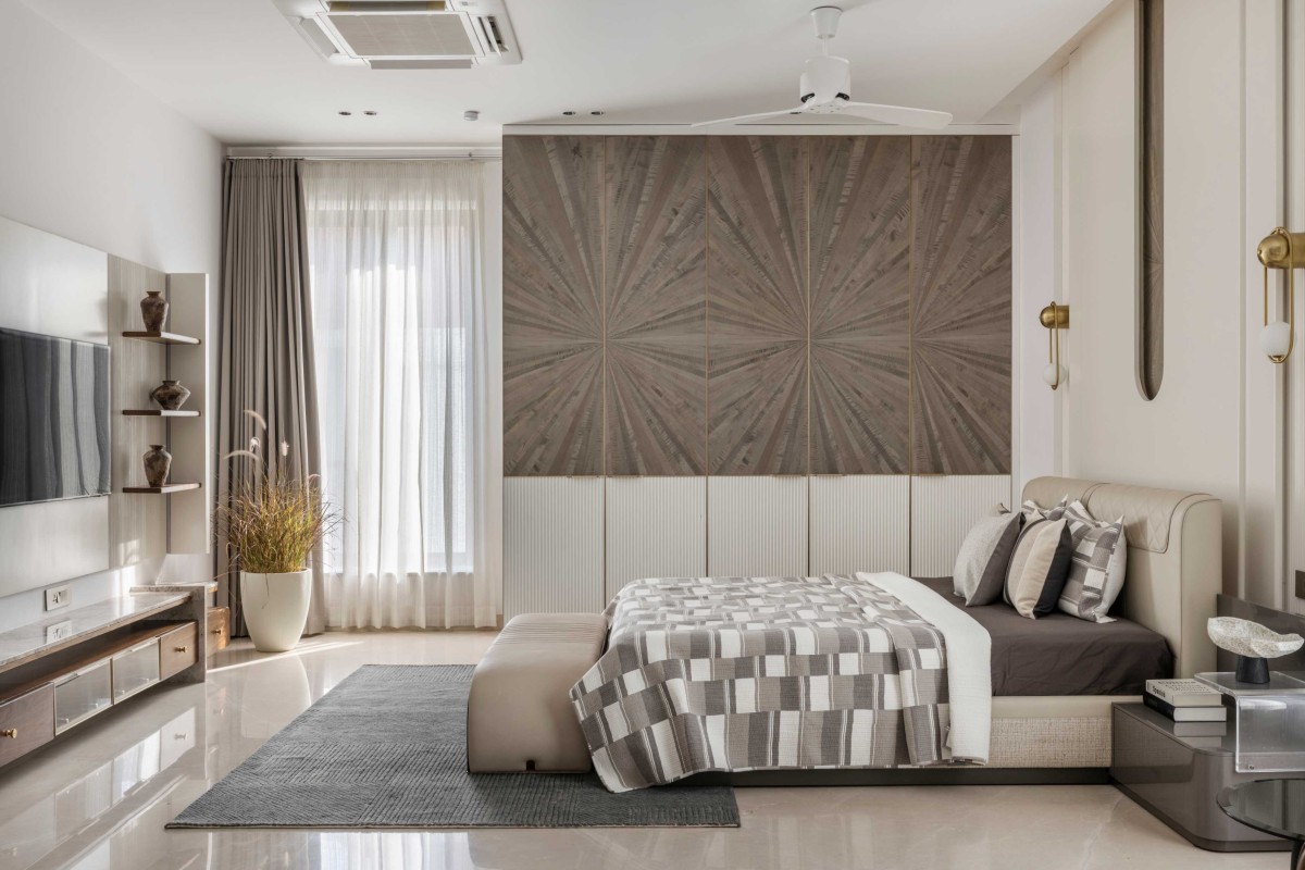 The second floor centers around a family lounge overlooking the double-height sit-out. An elevated Puja space takes prominence here, with wooden pillars, a brass tree accent, and a marble backdrop lending a spiritual aura. The master suite — encompassing a master den, opulent washroom, walk-in wardrobe, and pool-facing balcony — lies just beyond the lounge defined by a soothing palette of peach, red, and wooden flooring. The master suite’s washroom stands out with a handcrafted marble backdrop running floor to ceiling behind the washbasin, paired with a standalone bathtub and gold CP fittings.