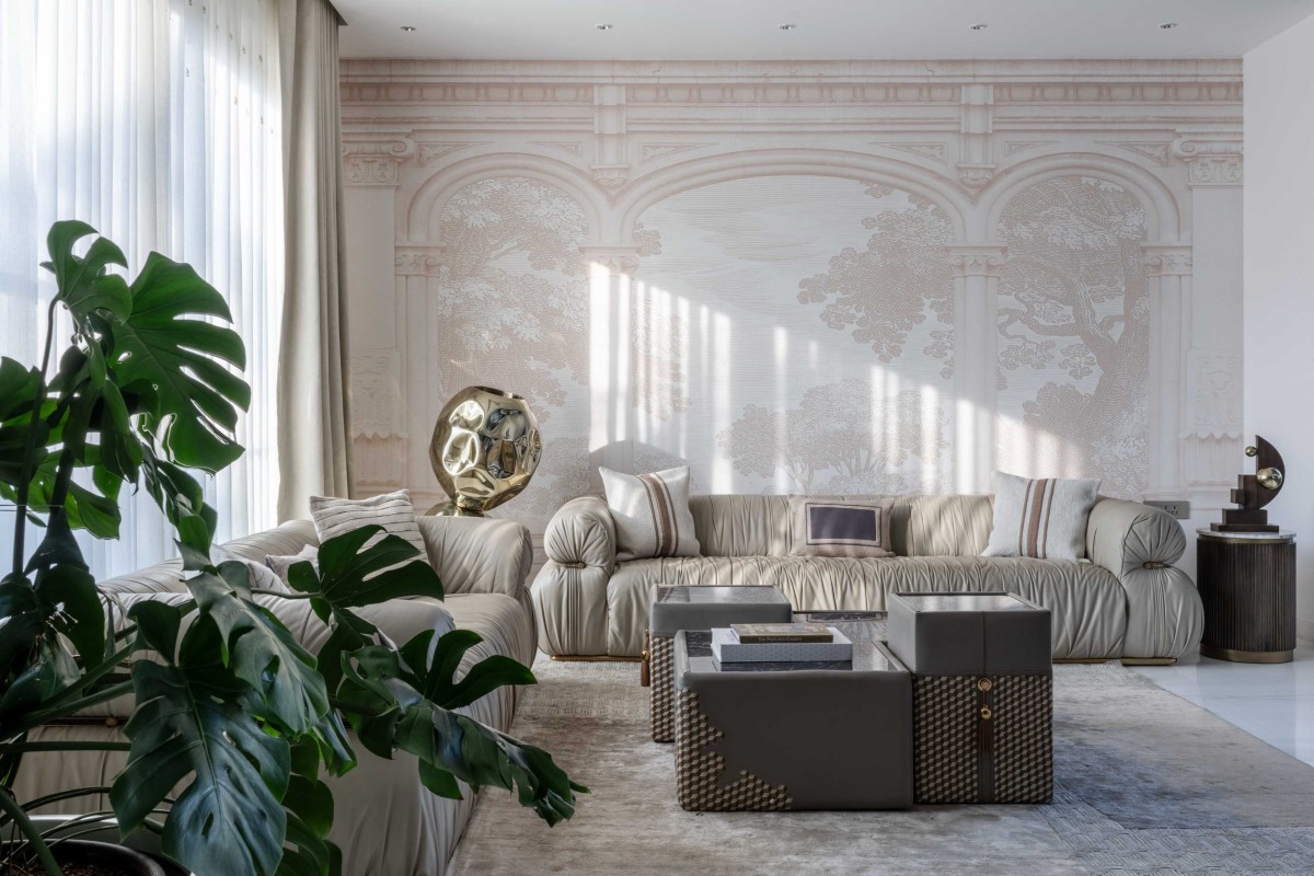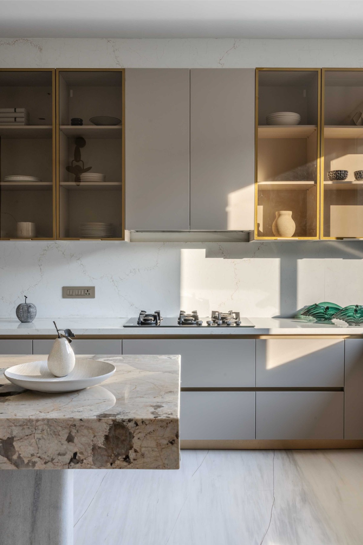 This floor also houses dry and wet kitchens, a pantry, and utility areas. The dry kitchen’s standout feature is an island counter finished in Patagonia quartzite and white Panda marble, enhanced by beige cabinetry with gold-profile glass doors — a blend of function and sophistication.