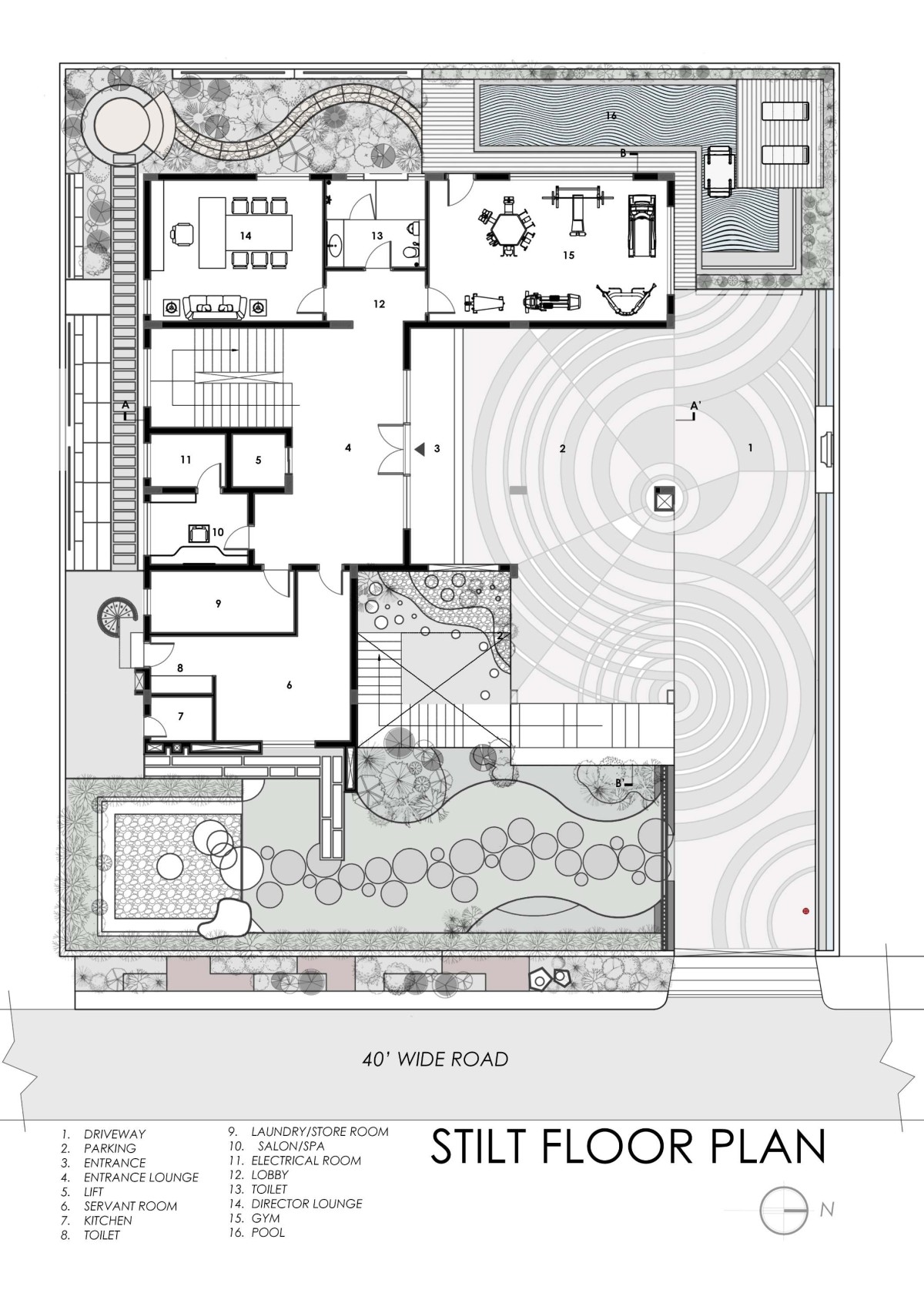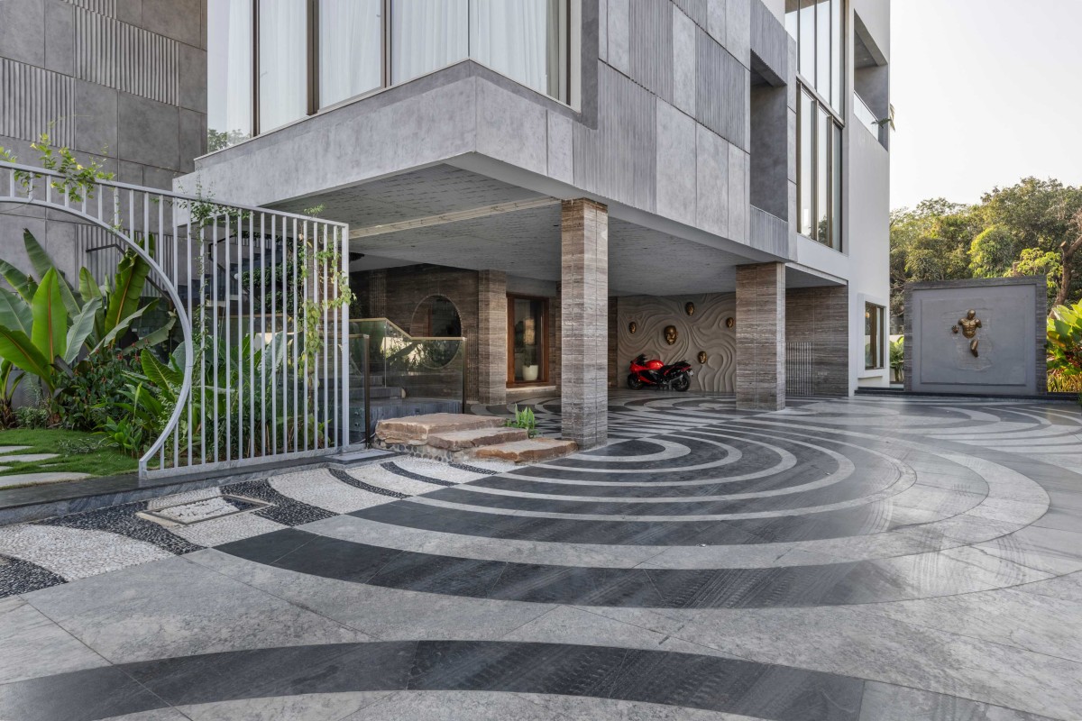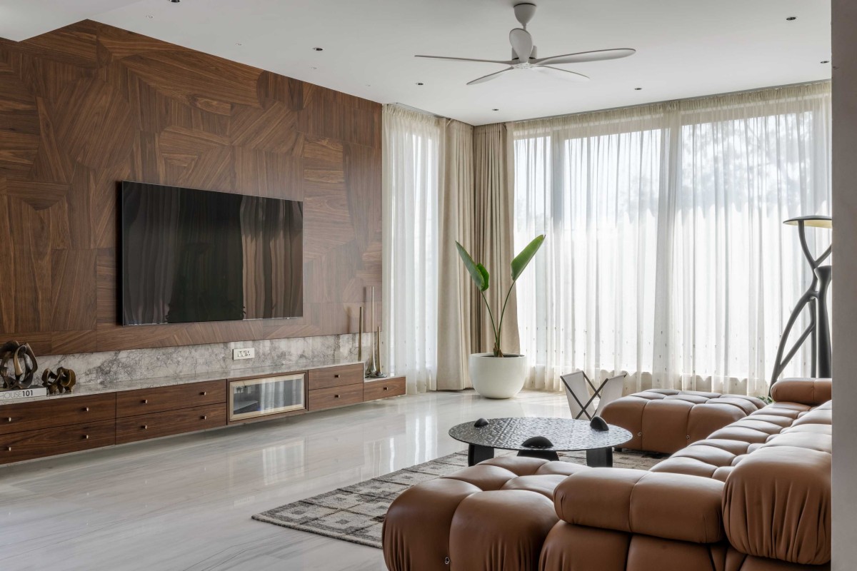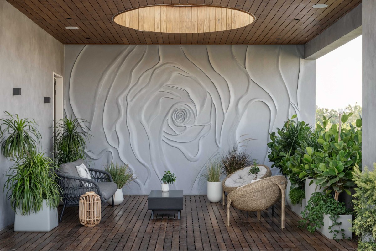 The home theatre embraces a futuristic design language, while the terrace offers two inviting seating decks. One deck features a circular skylight, a lotus-inspired mural, and lush greenery — an idyllic relaxation spot. The second deck, designed for party buffets, is defined by a stone backdrop wall and a pergola that completes the elegant outdoor setting.