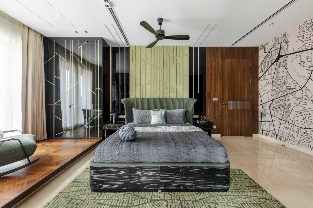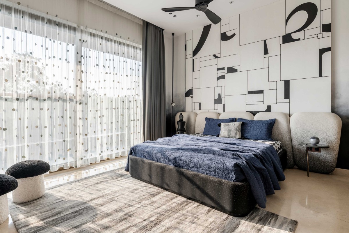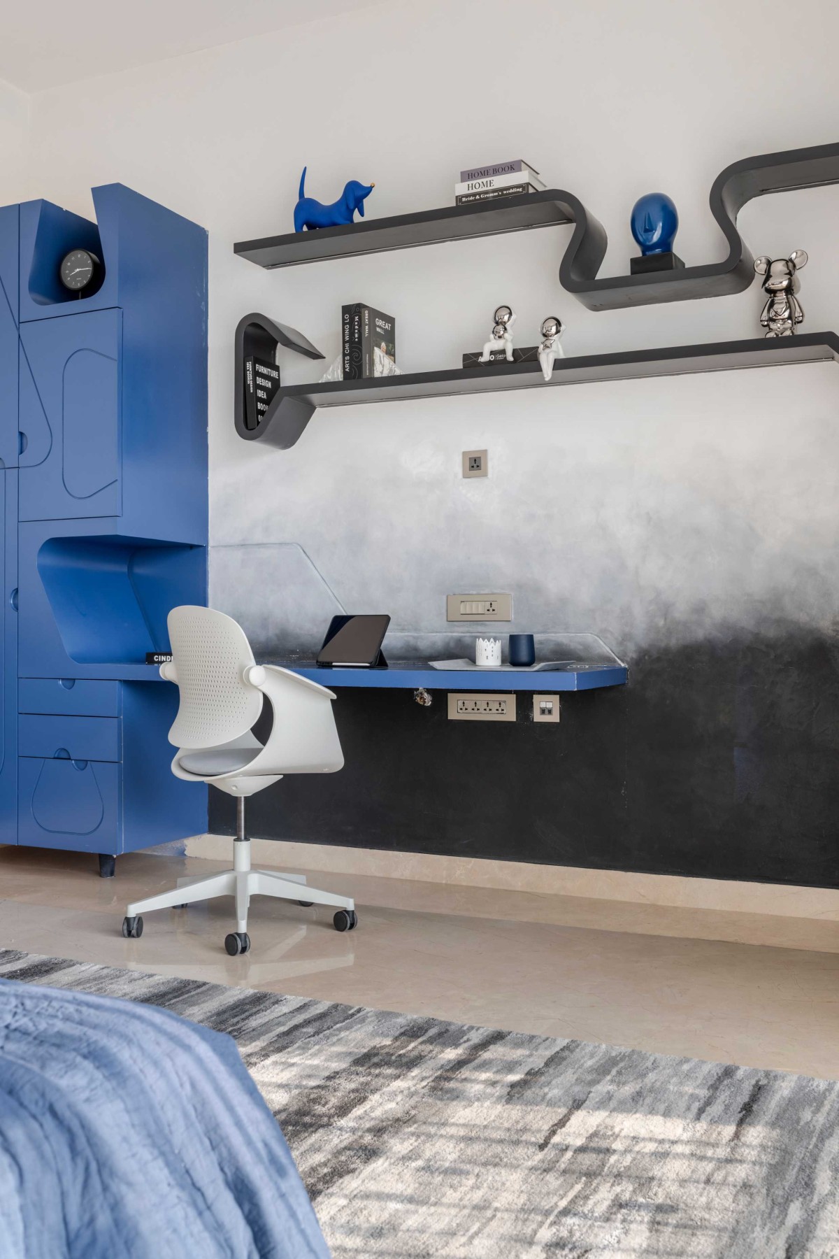 Two additional bedrooms for the client's sons flank the Puja space. The younger son’s room presents a bold black-and-blue palette with ombre-finish walls, while the elder son’s room features warm wooden tones, a plush headboard, and black back-painted glass. A wallpaper resembling a city map and a skyline motif on the washroom's blinds complete the elder son’s space.