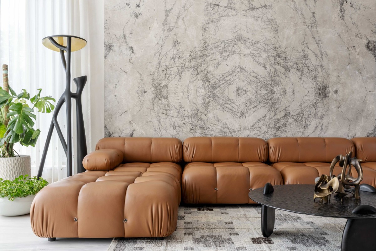 The living area overlooks the sit-out, fostering a seamless indoor-outdoor connection. The dining space is further enriched with a designer washbasin and a mirror from White Domus. The powder room surprises with a bold Bisazza glass mosaic panel. The parents' bedroom embraces a neutral palette with designer veneer accents, while the attached washroom channels a retro-inspired aesthetic with distinctive patterns and fittings.