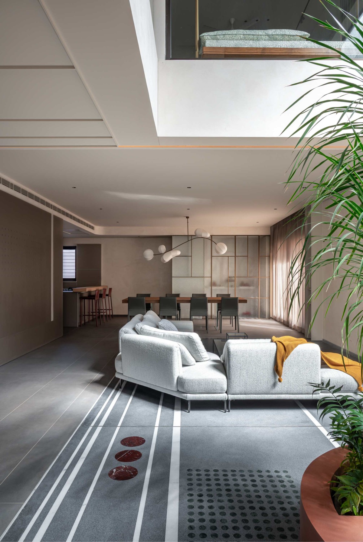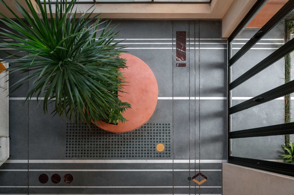 Materiality plays a key role in crafting the home’s identity. The use of ferrocement as a malleable material enabled us to sculpt a thin ephemeral facade. The interior courtyard has in-situ terrazzo with marble inlay that flows out to the outdoor deck area to seamlessly connect the inside and the outside across the fenestration.