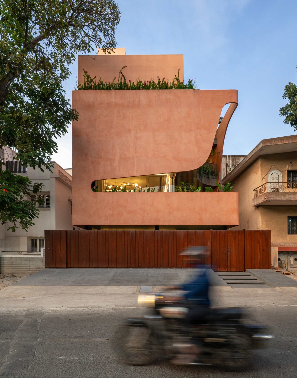 The facade, light and fluid in its articulation, folds and curves to create a play of depth and shadow. This design move not only defines the building’s unique identity within its urban context but also carves out a void with a garden in it. This suspended green intervention blurs the boundaries between architecture and landscape, transforming the building into a living organism that breathes with its surroundings. The garden enhances the microclimate by filtering air and light, while also offering the family intimate connections with greenery at different levels of the home. Seen from the street, they lend a sense of domestic warmth and ecological sensitivity to the design.