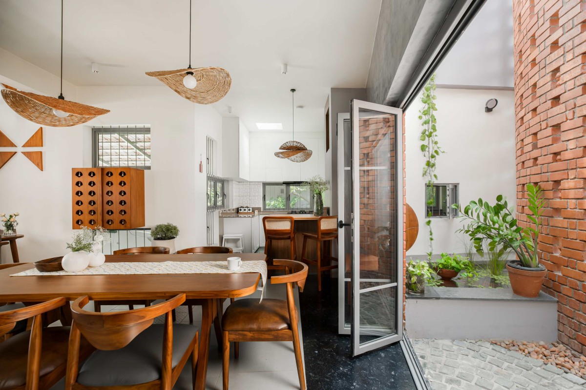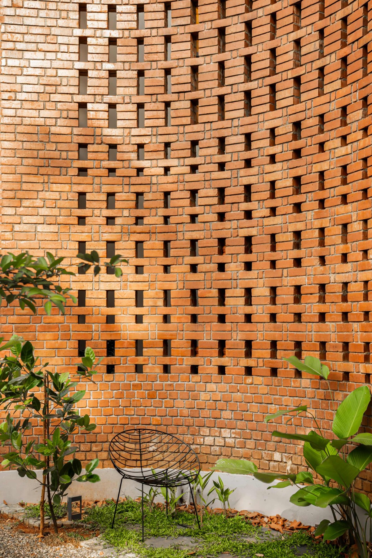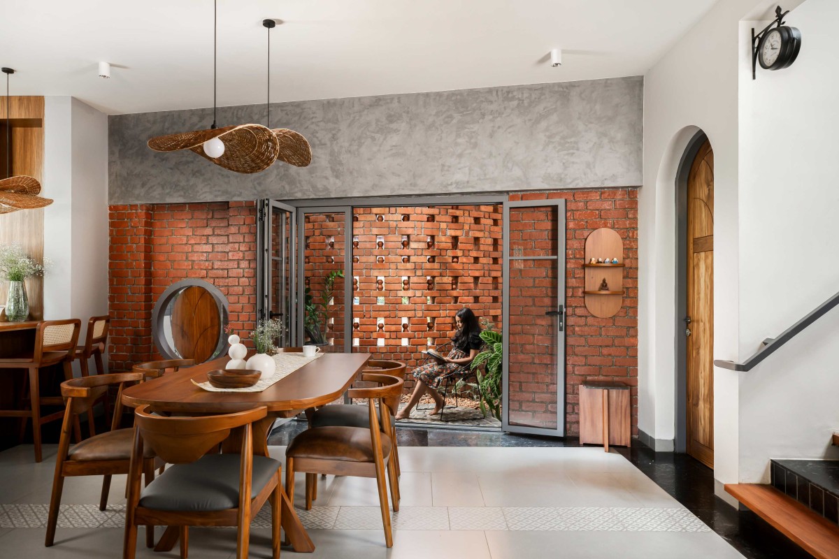 Beyond the living and dining spaces, through folding glass doors, the house opens into its most evocative pause: the patio. Designed as an inward-looking courtyard, it exists between enclosure and openness, defined by a semi-circular, double-height brick jali wall. From within, it becomes a focal point as the wall follows a deliberate pattern, bricks are arranged to create voids that increase in frequency as the eye travels upward, allowing more light and air at the top where heat naturally accumulates. Nestled within the voids are small terracotta pots, tucked in like birds in a nesting wall, disrupting predictable shadow patterns and adding moments of surprise.