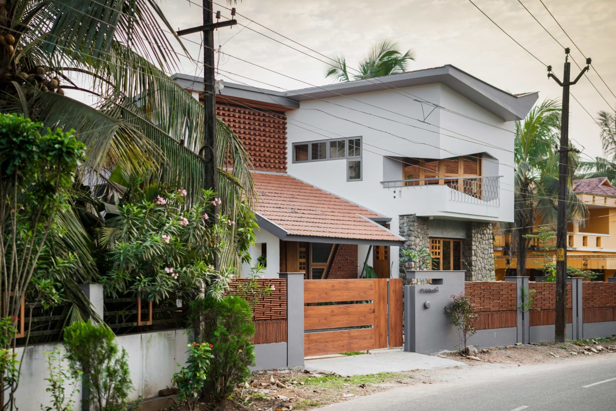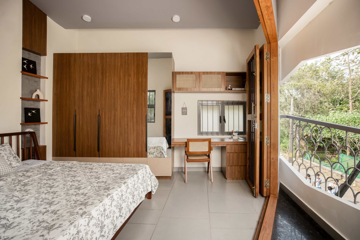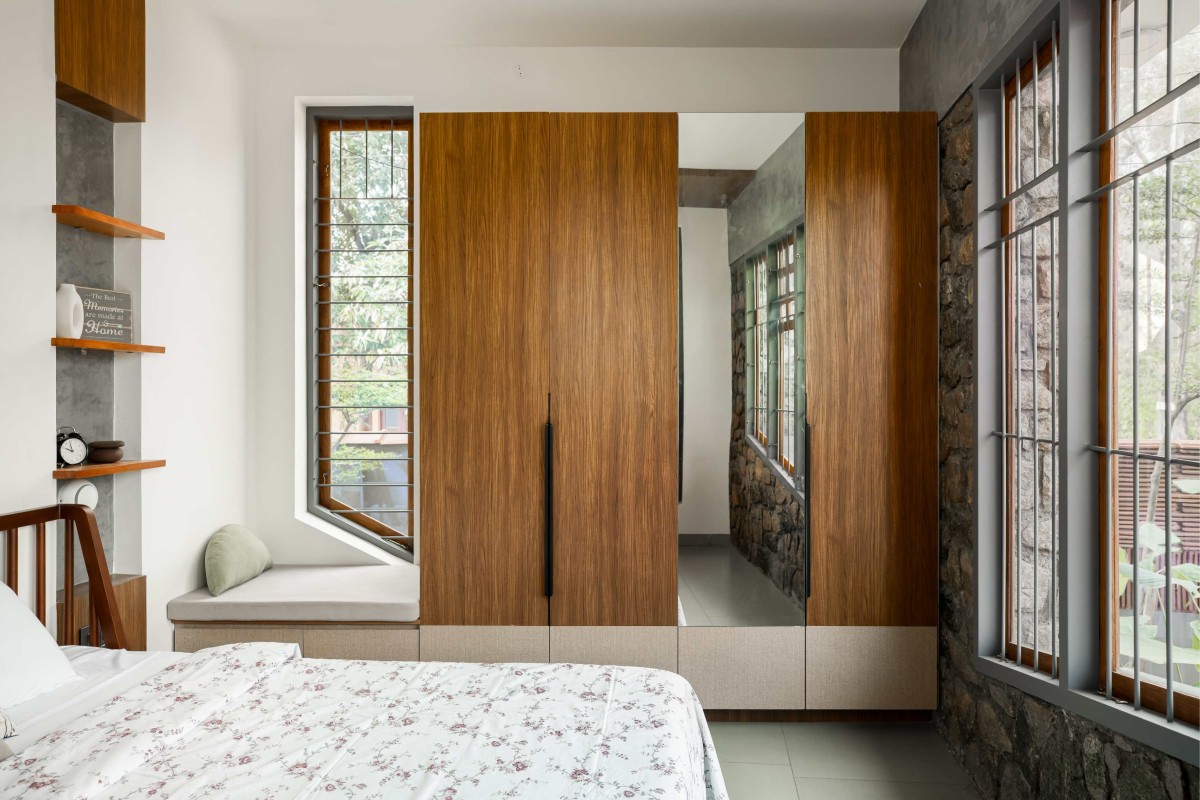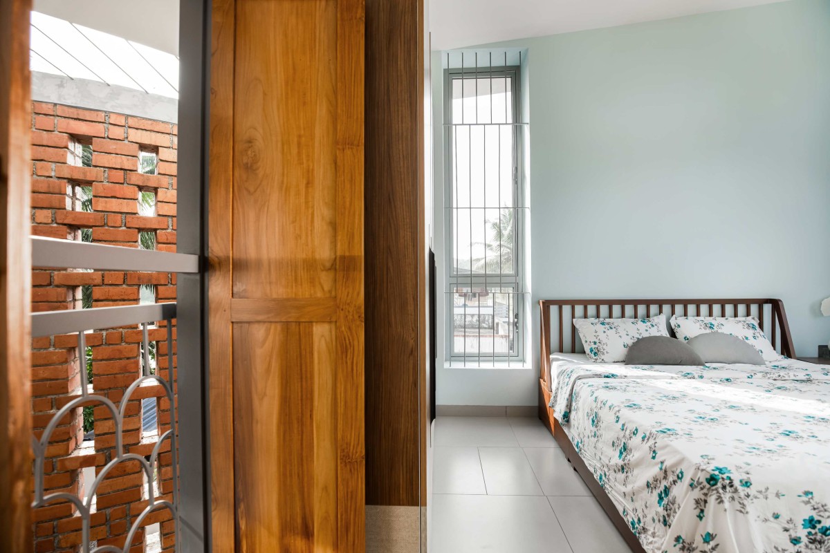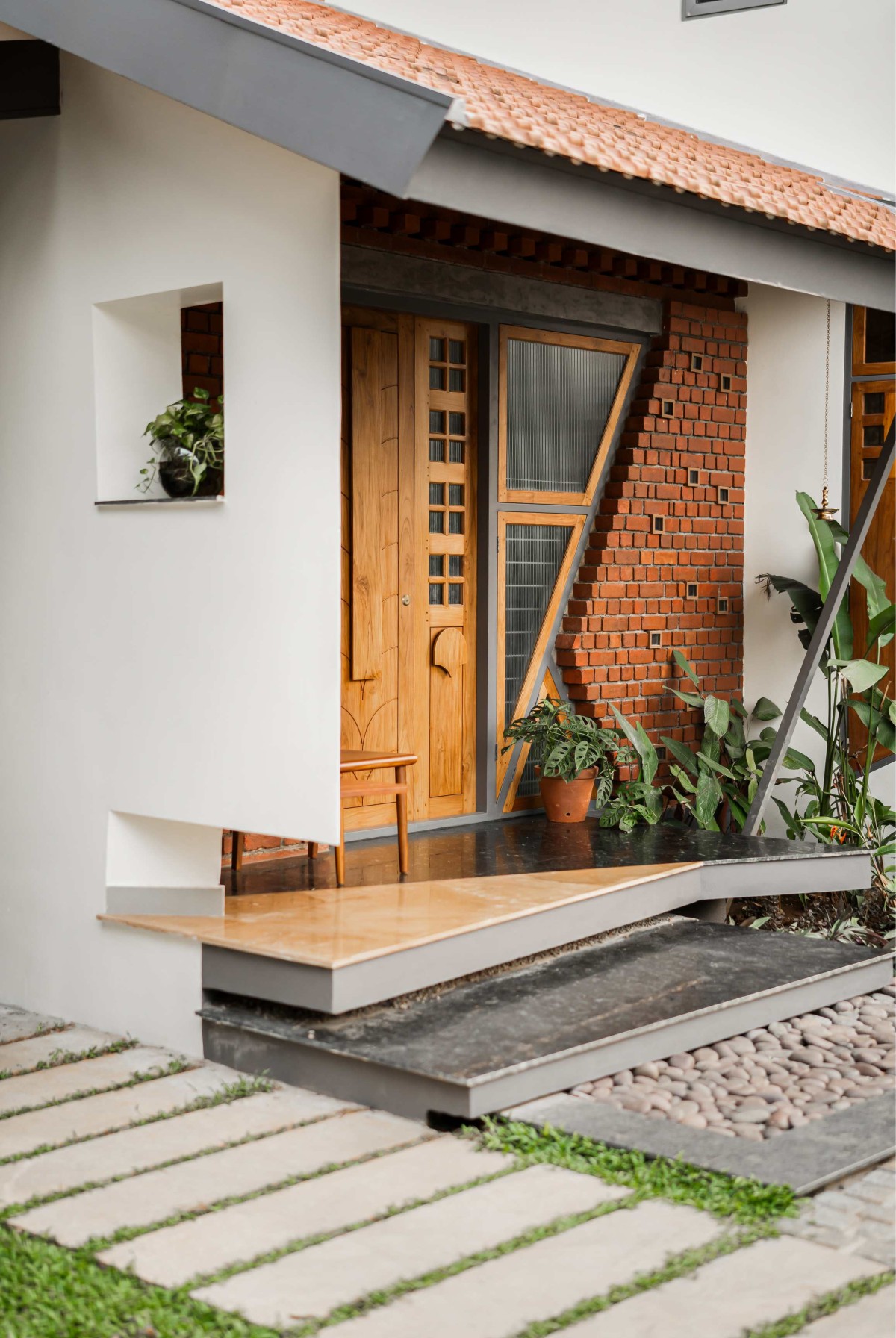 Passive cooling strategies are embedded throughout. Rat-trap bond masonry in the south and west-facing walls creates air cavities that reduce heat transmission, while a double-layered roof system, Mangalore tiles above and terracotta ceiling tiles below, forms an insulating buffer against the sun. The result is a home that remains noticeably cooler, even during peak summer afternoons.