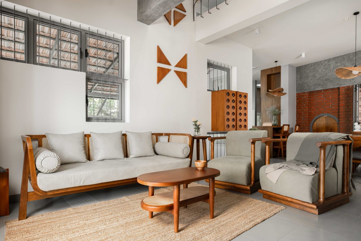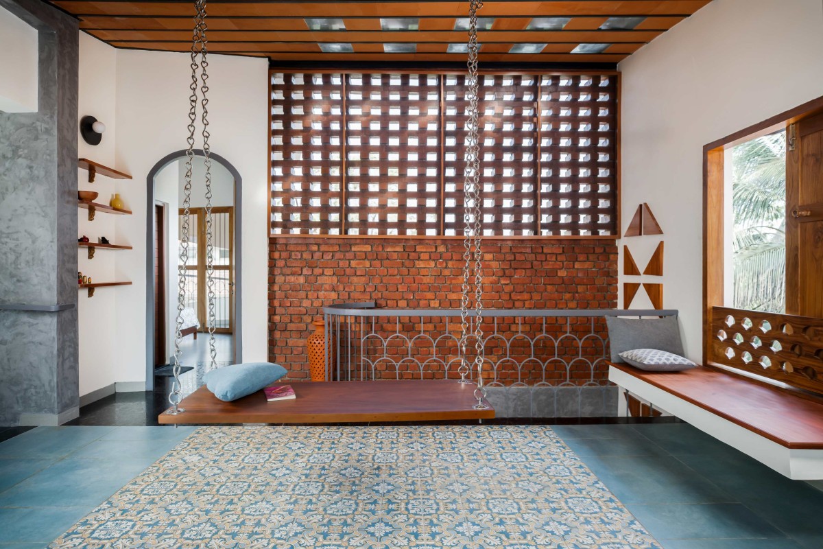 At the heart of this sequence rises a double-height volume above the living and dining areas. Woven pendant lights descend at varied heights, their basketwork casting delicate shadows that drift and dissolve as the day progresses. In Palakkad’s intense summers, this volume performs efficiently as hot air rises and escapes through carefully positioned brick jalis near the ceiling, while cooler breezes from the surrounding paddy fields are drawn inward. A fine wire mesh sits discreetly behind the brickwork, keeping insects out without interrupting the visual rhythm.