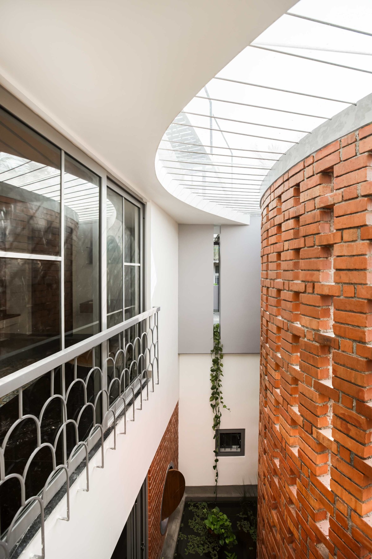 The staircase, positioned to one side, demands its own lauding. Open wooden treads float between steel stringers. The balustrade, a geometric pattern of scale-like forms welded in metal, casts intricate shadows on the textured wall beside. A skylight floods the stairwell with natural light. As you ascend, perspectives quite literally evolve: the living area below, the brick jali wall of the patio visible through openings, the promise of private spaces above.
