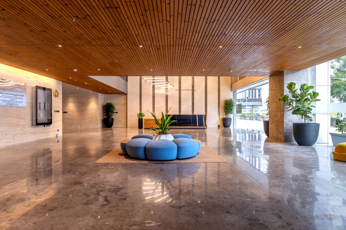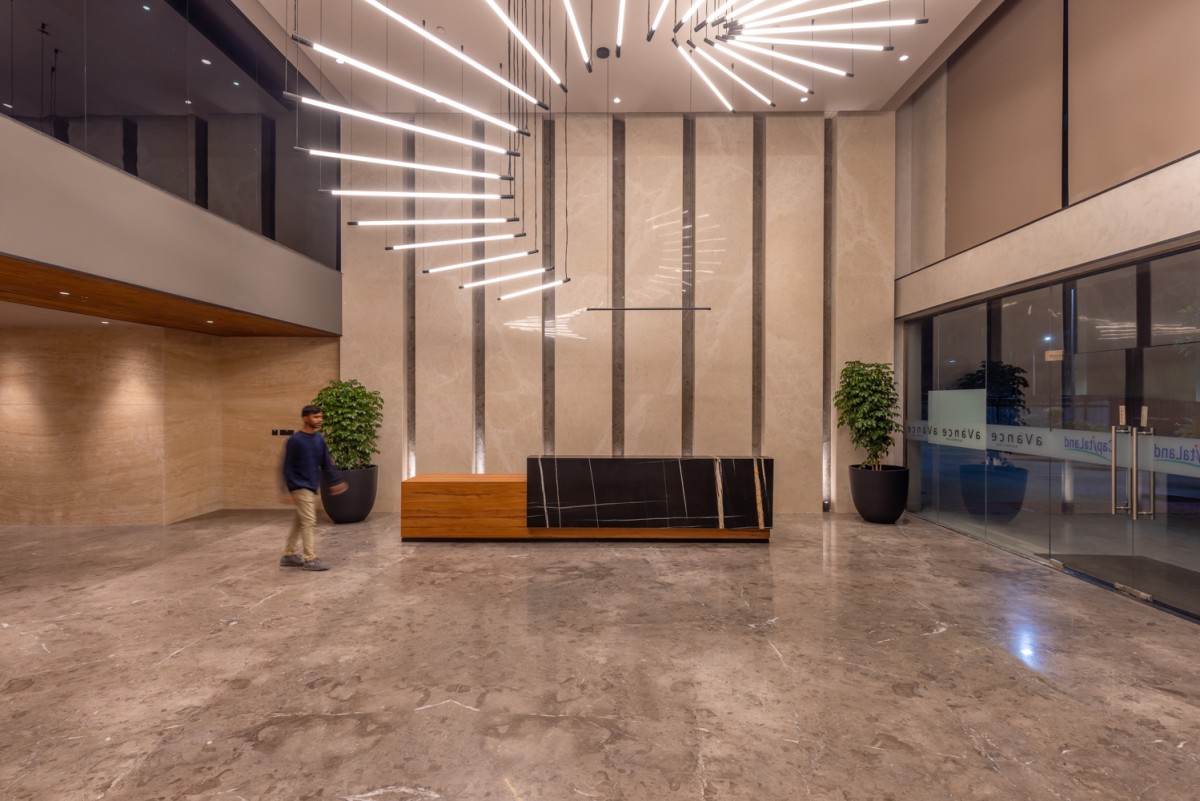 The lobby was envisioned as the project’s most important threshold—an interface between the bustling corporate exterior and the calm, dignified interior. Surrounded by wide arterial streets and a dense cluster of commercial towers, the site demanded a design that would not only assert presence but also extend a sense of composure and refinement to all who entered. The lobby was thus conceived not as a mere waiting zone, but as a spatial experience that establishes identity, continuity, and lasting impressions.
