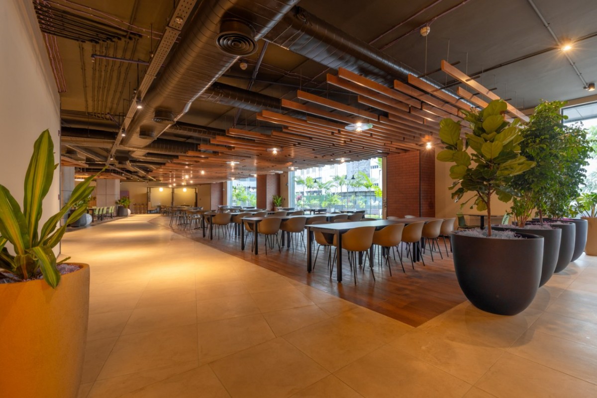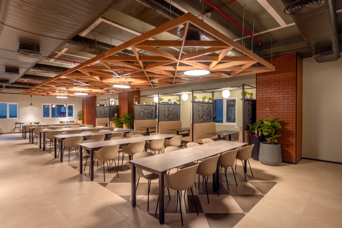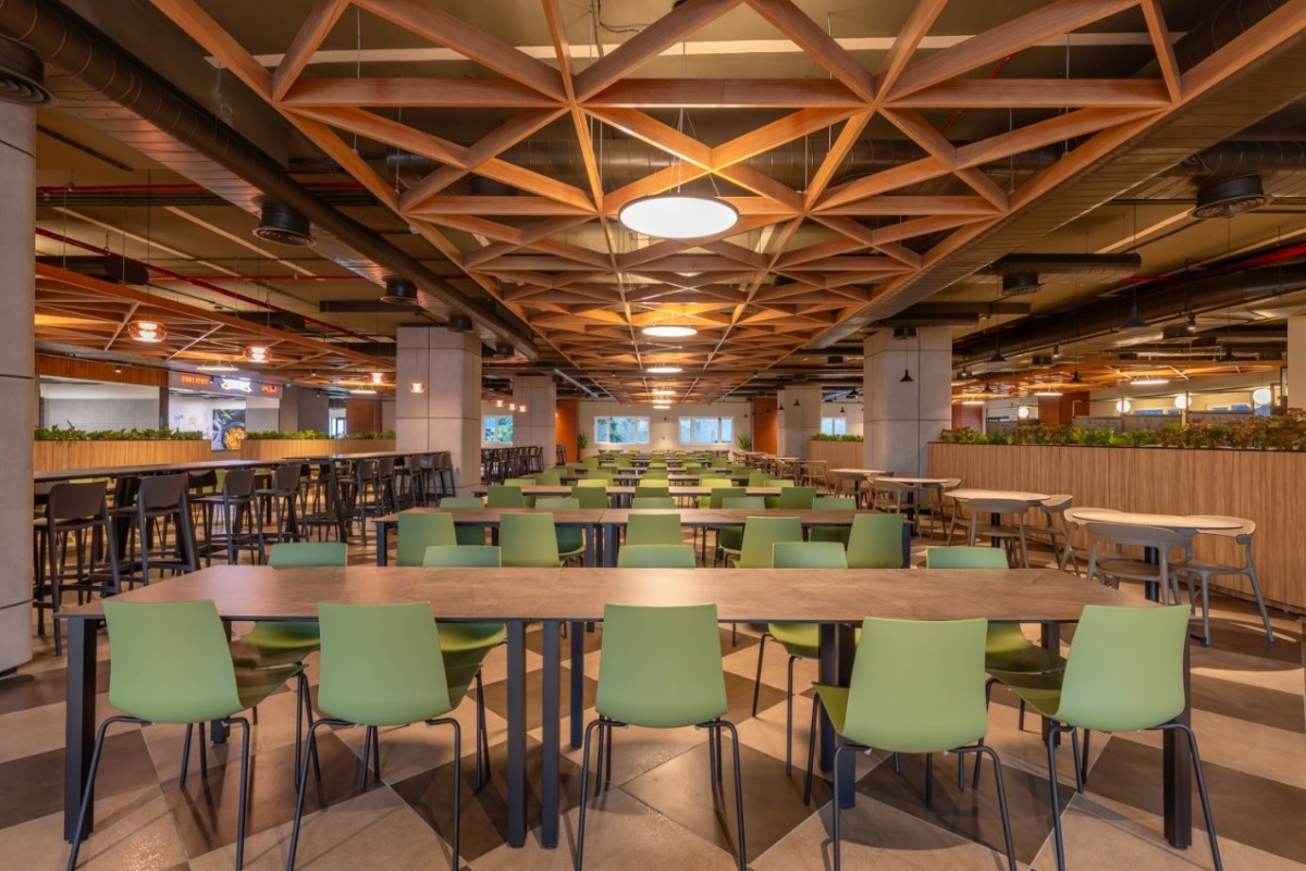 The design inspiration stemmed from a sense of natural warmth and biophilia, expressed through materiality and spatial layering. An exposed wooden lattice ceiling was introduced as a unifying feature, its rhythmic geometry concealing building services while adding texture, scale, and order to the expansive volume. Beyond functionality, this ceiling element also served to subtly define different zones within the cafeteria—café-style seating clusters, communal tables, and bar-style counters.