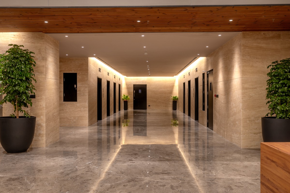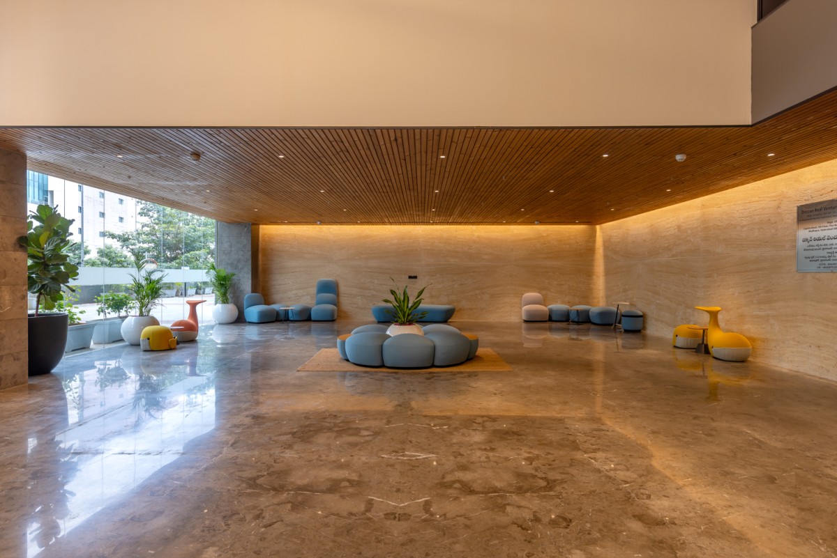 Spatially, the lobby was configured around principles of openness and flow. Circulation remains unobstructed, while seating clusters are arranged to encourage informal interactions. The reception desk anchors the experience against a stone-and-wood feature wall, while the travertine cladding guides users toward the lift corridor, reinforcing the design’s intent of continuity. Oversized planters punctuate the space, introducing greenery as a counterpoint to stone and marble, and embedding a biophilic quality that softens the formality of the corporate setting.