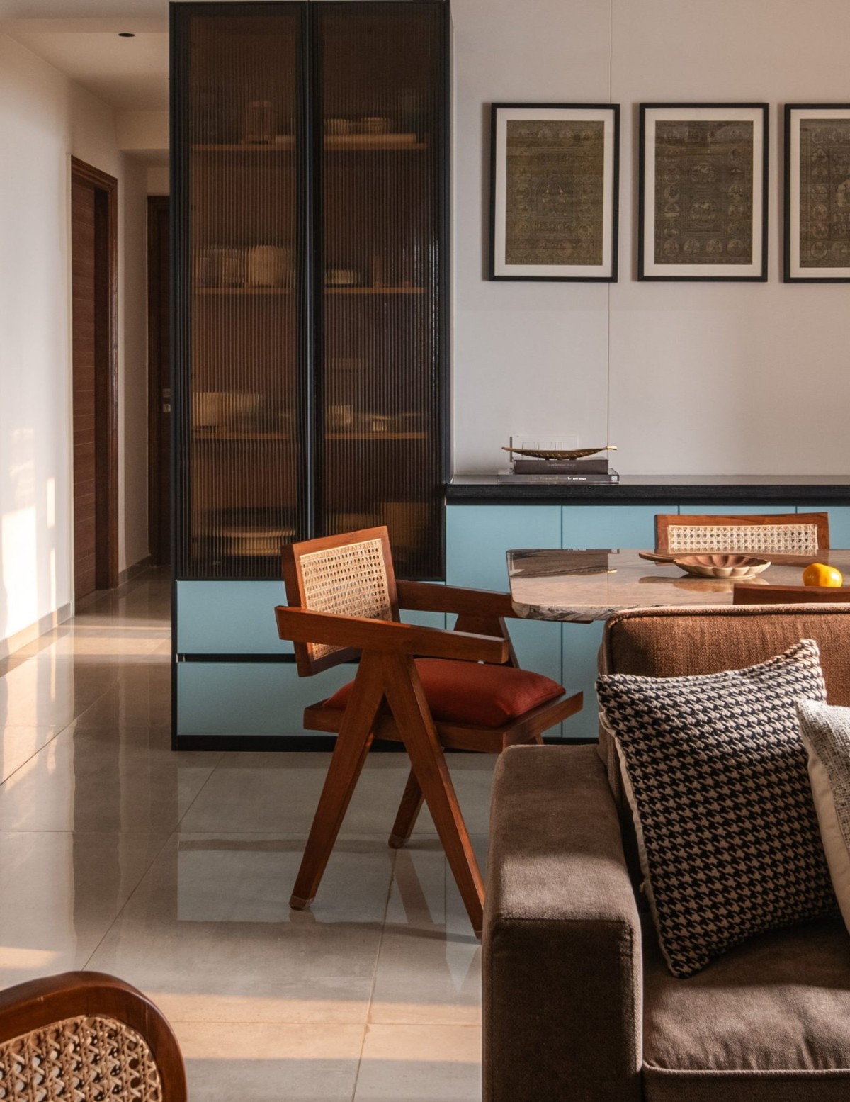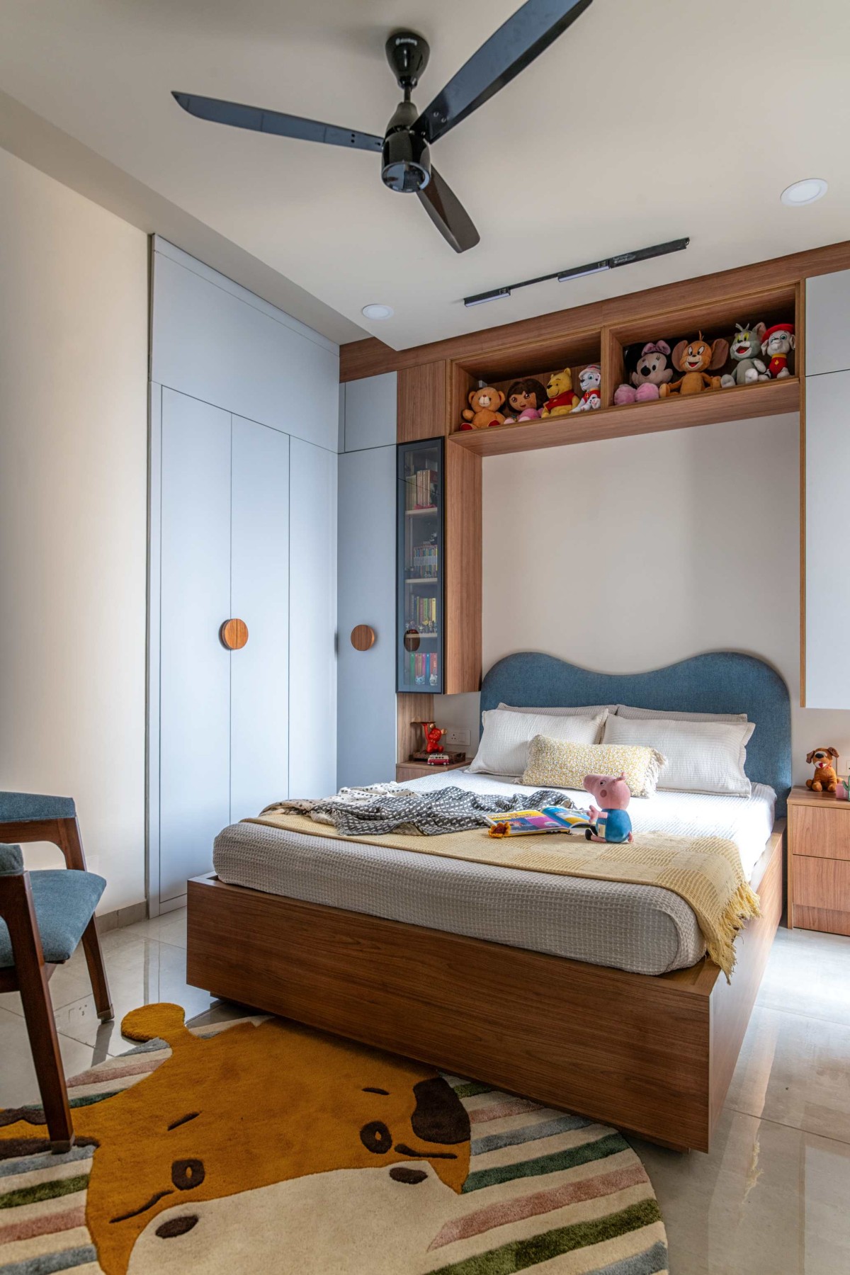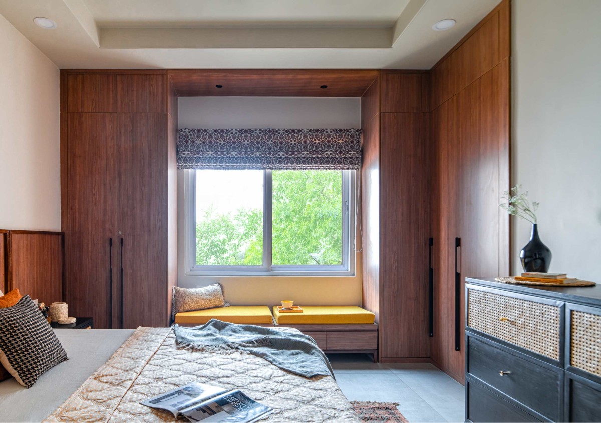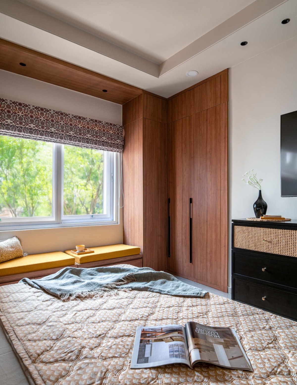 Another bedroom embraces a snug window seat, invitation to slow down with a morning chai or a good book. Storage has been seamlessly integrated around it, blending into the overall design rather than standing apart. Clean-lined wardrobes, warm finishes and concealed functionality ensure the room remains visually light yet highly practical.