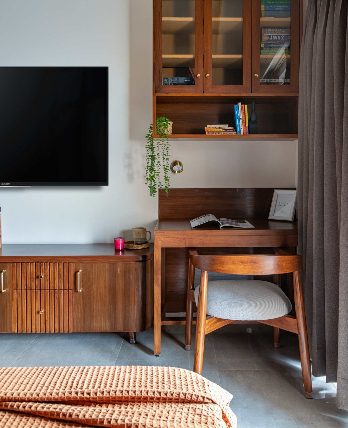 The TV-cum-study unit further demonstrates the home’s design language. Warm materials, minimal detailing and smart storage come together to create a unit that is both aesthetic and purposeful. Open and closed shelves balance display and concealment, allowing the family to personalise the space while keeping clutter in check.