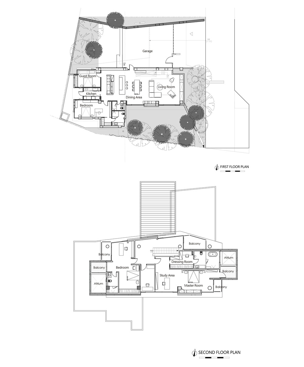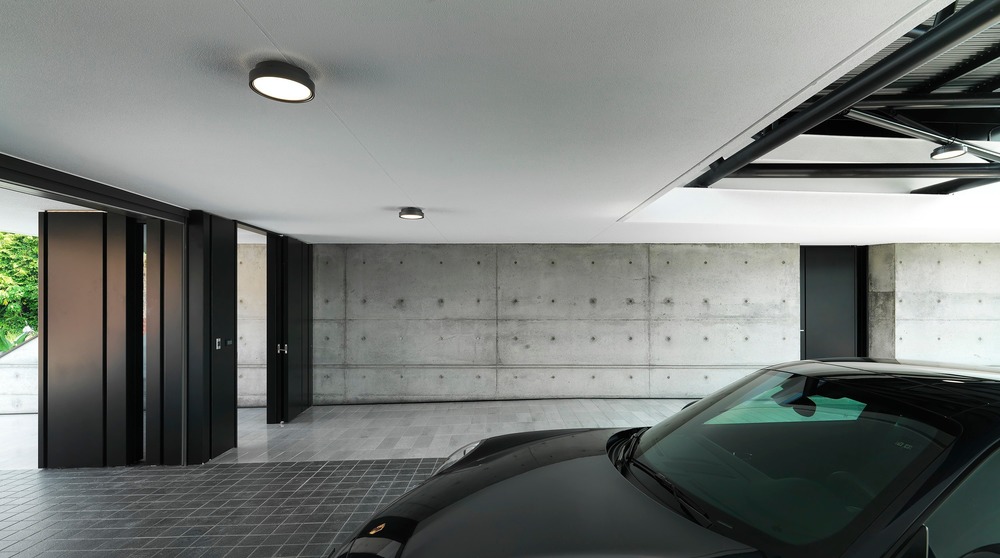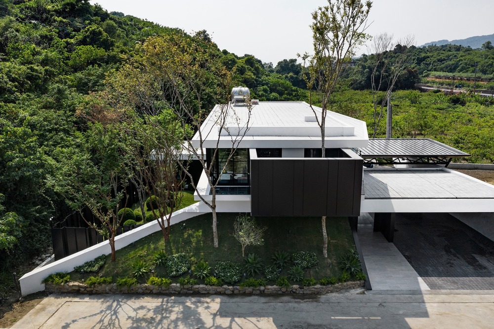 This project quite far away from the city is what most people in Taiwan would term the countryside. The property is adjacent to the low-density residential area of the Agongdian Reservoir in the mountains of Kaohsiung. At a glance it looks like an orchard with lots of hills. In front of the property, there is a private 6 meter road that takes into account: privacy and the safety of vehicles entering and exiting. The building is 6.5 meters away from the road. A green slope was created under the suspended wall on the second floor of the main building facing the southward hilly land. The natural grassy slope in the courtyard echoes the greenness of the hillside slope. A number of Taiwanese beech trees were also planted to further enhance the greenness of the property. All of this allows the inhabitants to easily view the change of seasons while creating a rare atmosphere that is impossible to achieve in a city-like environment.