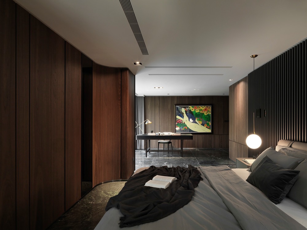 The living room has always been the focus of the family. By significantly reducing the cost of construction, critical resources were brought to bear on the spaces inside. The south-facing hilly green slopes situated in the courtyard extends the public space for the family. Over time, the movement of the trees creates light and shadow in the yard which brings a liveliness to the residents. Everyone needs a sanctuary away from the stresses of city life and that is the space that has been created. Plentiful natural light enters the room through the large floor-to-ceiling windows. This means that we only need a small number of artificial light sources. As time goes by, the owners can directly feel the difference of light, reminding them to cherish the beauty of the moment.
