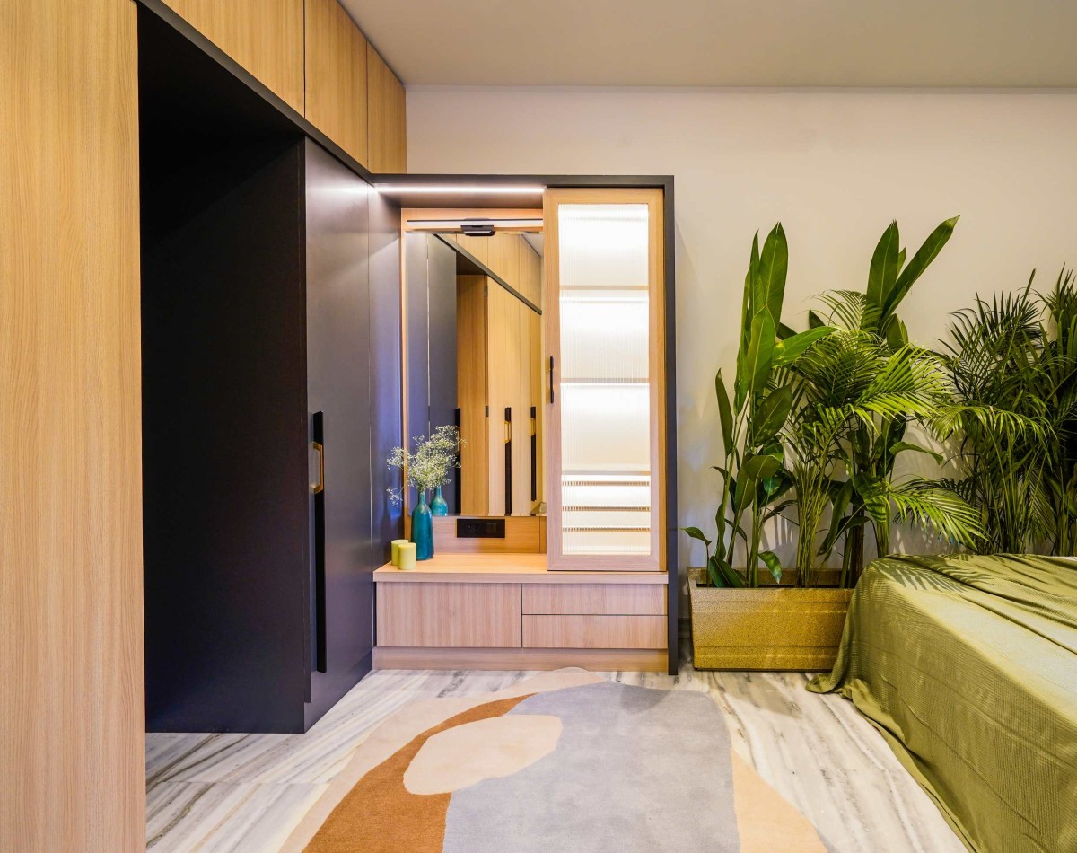 What makes this room remarkable are the thoughtful layers of design. A carved niche with jali-inspired detailing doubles as a prayer corner, grounding the space in cultural resonance. Adjacent to it, the pooja room clad in Onyx stone adds a luminous depth, glowing subtly with natural veining and creating a spiritual anchor within the home. The dining wall also conceals a hidden door seamlessly integrated into the panelling, a detail that exemplifies Studio Timescape’s belief in design that is as functional as it is refined.