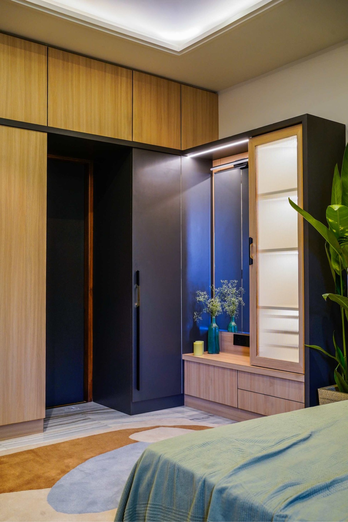 Custom cabinetry in ash-toned wood and deep grey laminates is detailed with fluted glass shutters and matte black hardware, marrying precision with warmth. A streamlined dresser corner is accented with minimal décor—ceramic vases, glass bottles, and a muted palette that amplifies the clean aesthetic.