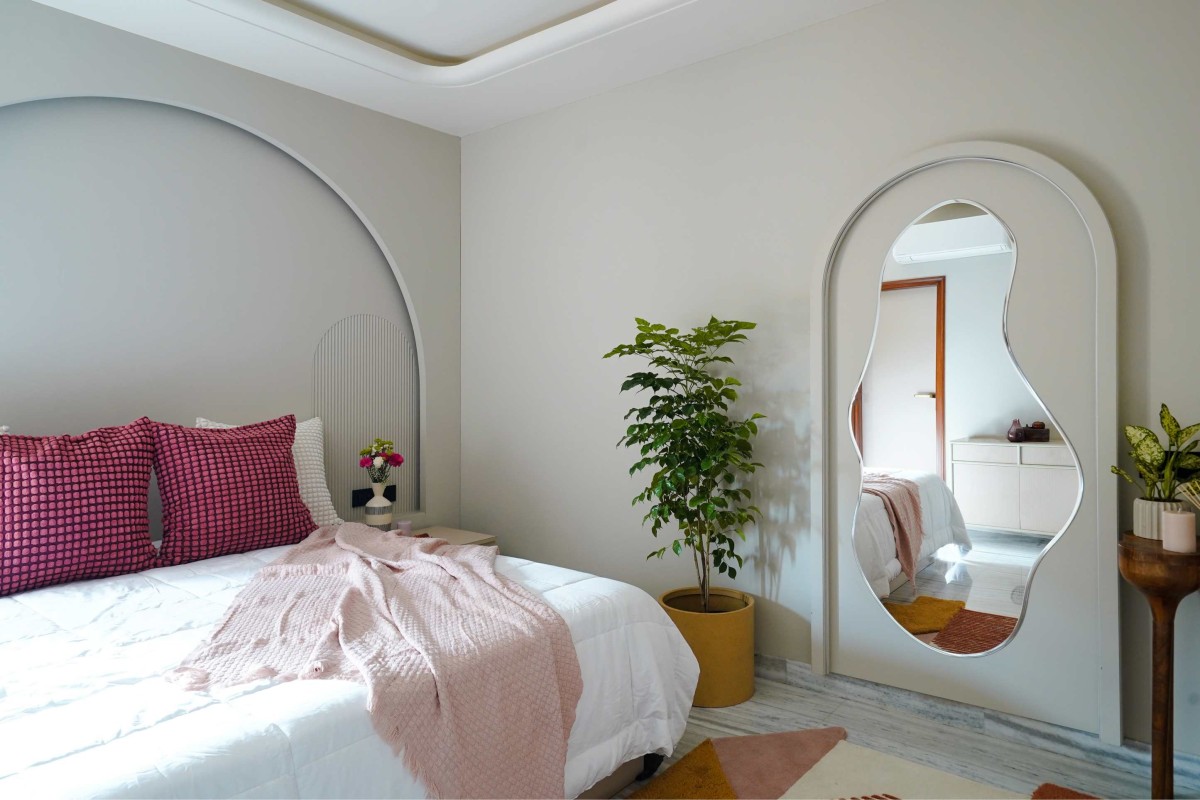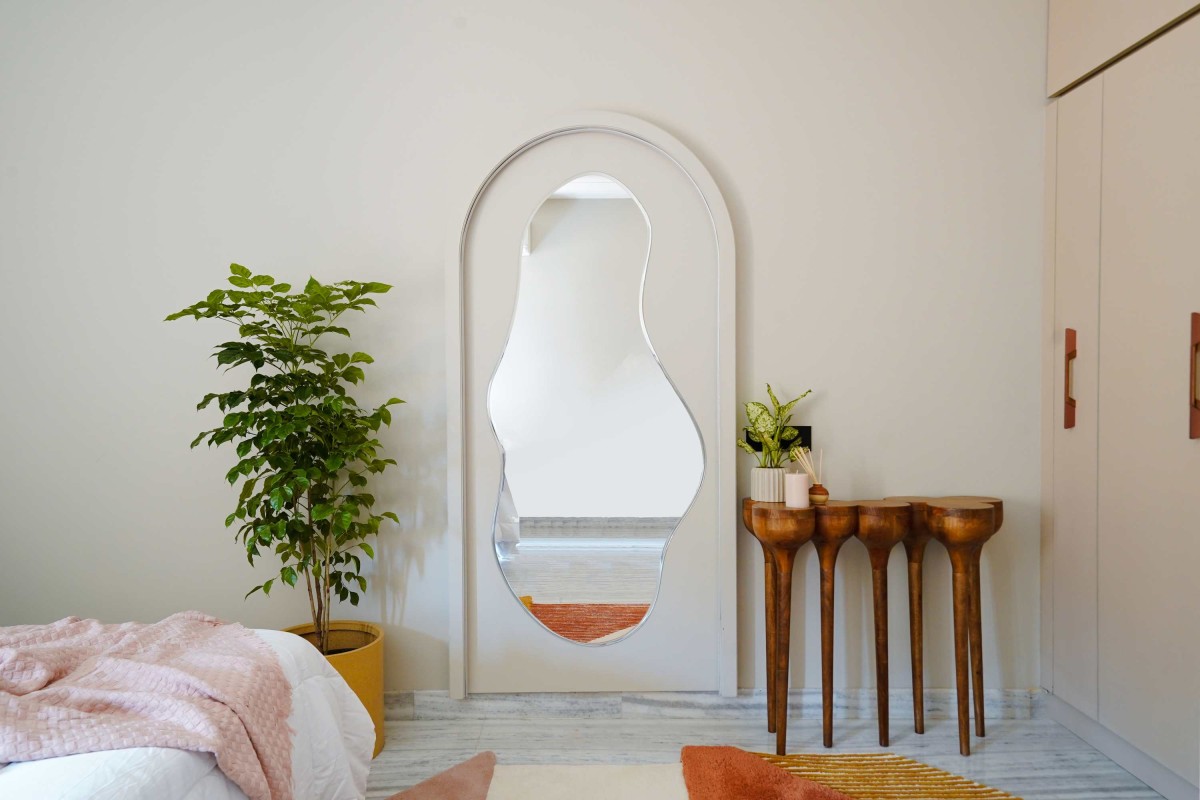One of the room’s most compelling details is the organic full-length mirror framed within a tall arch. Its fluid silhouette contrasts beautifully against the room’s otherwise linear rhythm, becoming both a design statement and a playful anchor. Placed before it is a shaped Cocoon rug in tones of rust, ivory, and mustard, which enlivens the floor with bold geometry and soft tactility. Alongside, a drop console in solid mango wood adds sculptural depth with its carved legs, completing the vignette with a balance of craft and functionality.