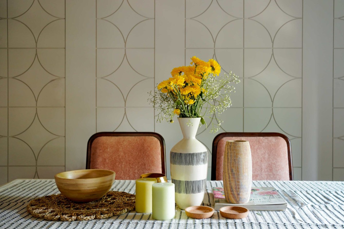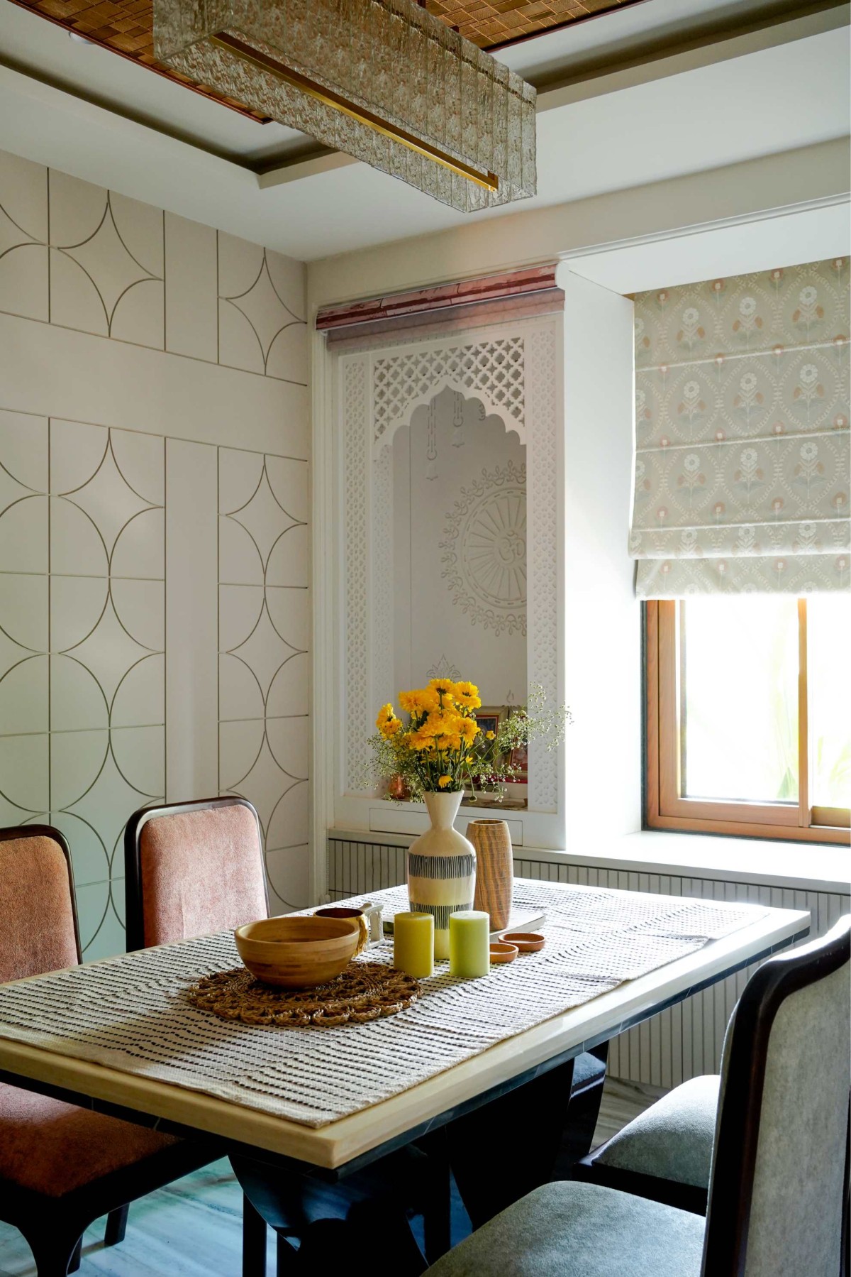 To the right of the foyer lies the dining area, conceived as a space of quiet sophistication. A wall panelling detailed with geometric patterns creates rhythm and depth, while an elegant wooden arch frames the transition. At its centre, a sleek dining table is styled with earthy ceramics and fresh florals, paired with upholstered chairs in muted rose tones that soften the overall palette. Above, a textured ceiling detail and crystal chandelier add refinement without overpowering the serenity of the space.