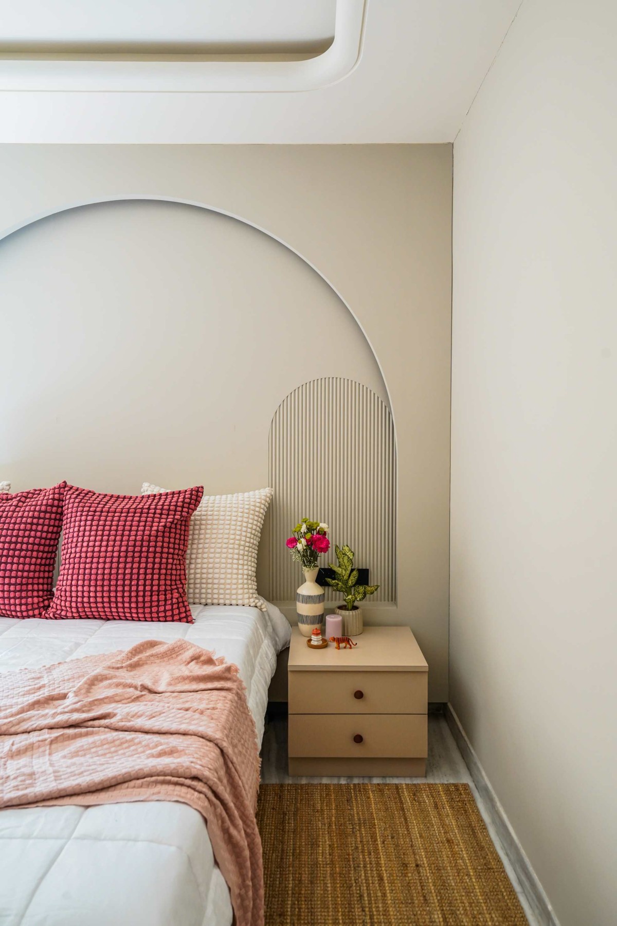 The material palette leans towards the muted and tactile. A natural jute rug underfoot lends earthy warmth, while layers of textiles in soft blush and ivory bring comfort to the bed. Accents of burgundy in the cushions add depth without overpowering the neutral envelope. The side tables are styled lightly—with striped ceramics, fresh flowers, and greenery—introducing intimacy and freshness to the setting.