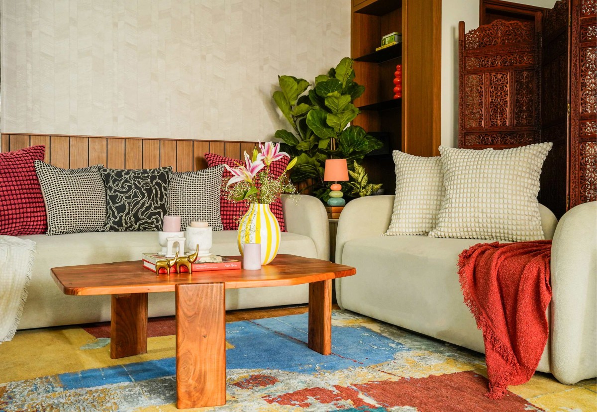 The centrepiece of the room is a striking Cocoon Fine Rug, whose painterly abstraction introduces an artful dynamism underfoot. Its layered hues act as a unifying canvas, holding together the understated walls, the warmth of wood, and the softness of upholstery. Upon it rests a collection of Furnicasa furniture in Babool (Acacia) wood, chosen for its rich grain and durability. The design of each piece balances comfort with craft- rounded sofas upholstered in quiet neutrals, paired with cane-accented lounge chairs that nod to tradition while keeping the form contemporary.