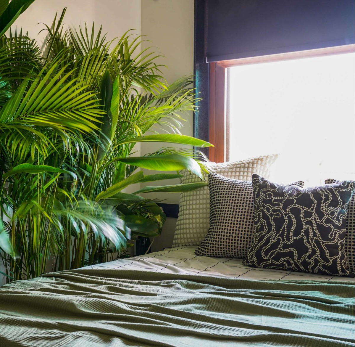 The bed is set against a striking backdrop, complemented by lush clusters of indoor palms that form a living green wall. This infusion of greenery not only softens the geometry of the room but also blurs the line between inside and outside, bringing a sense of calm vitality to the younger son’s retreat.