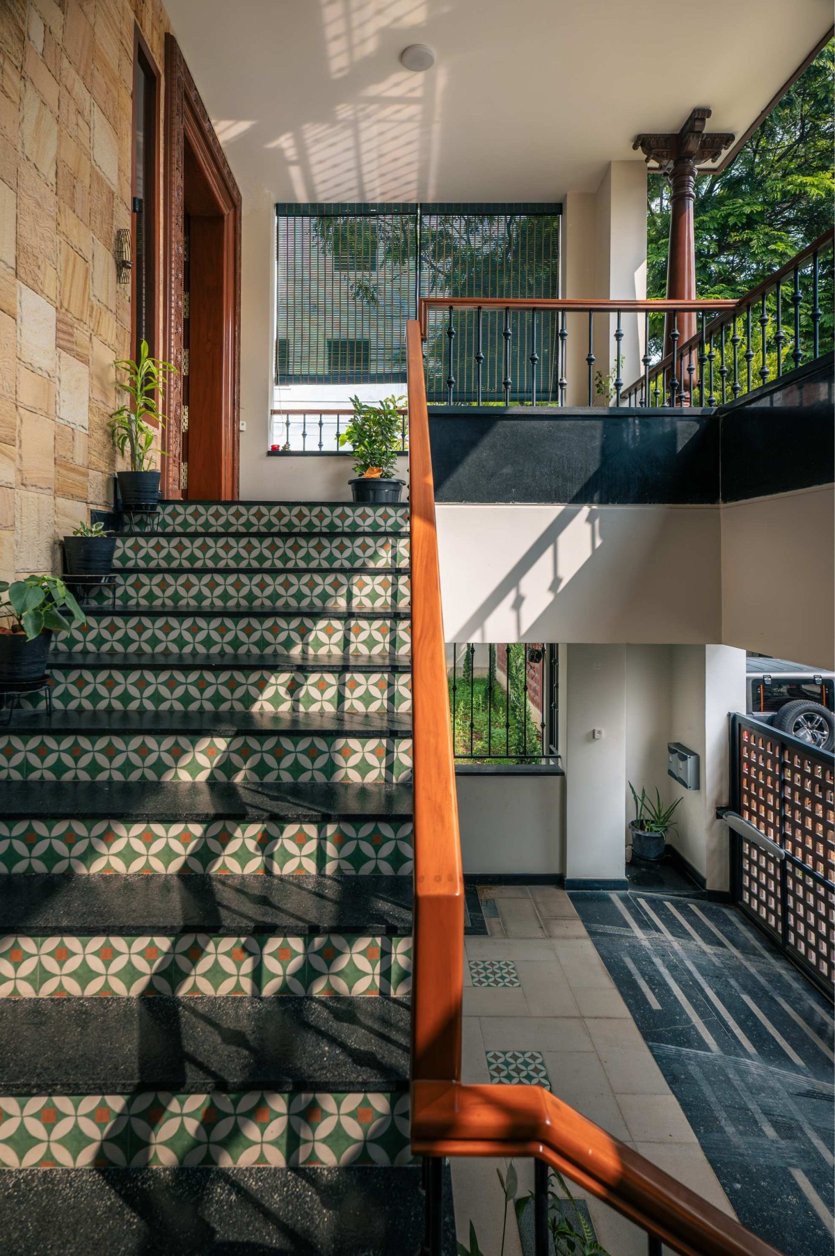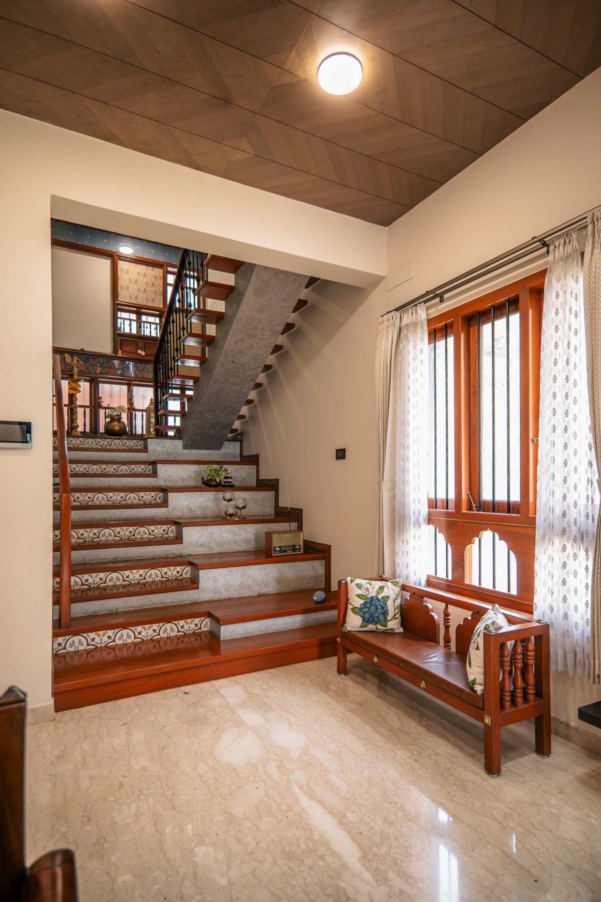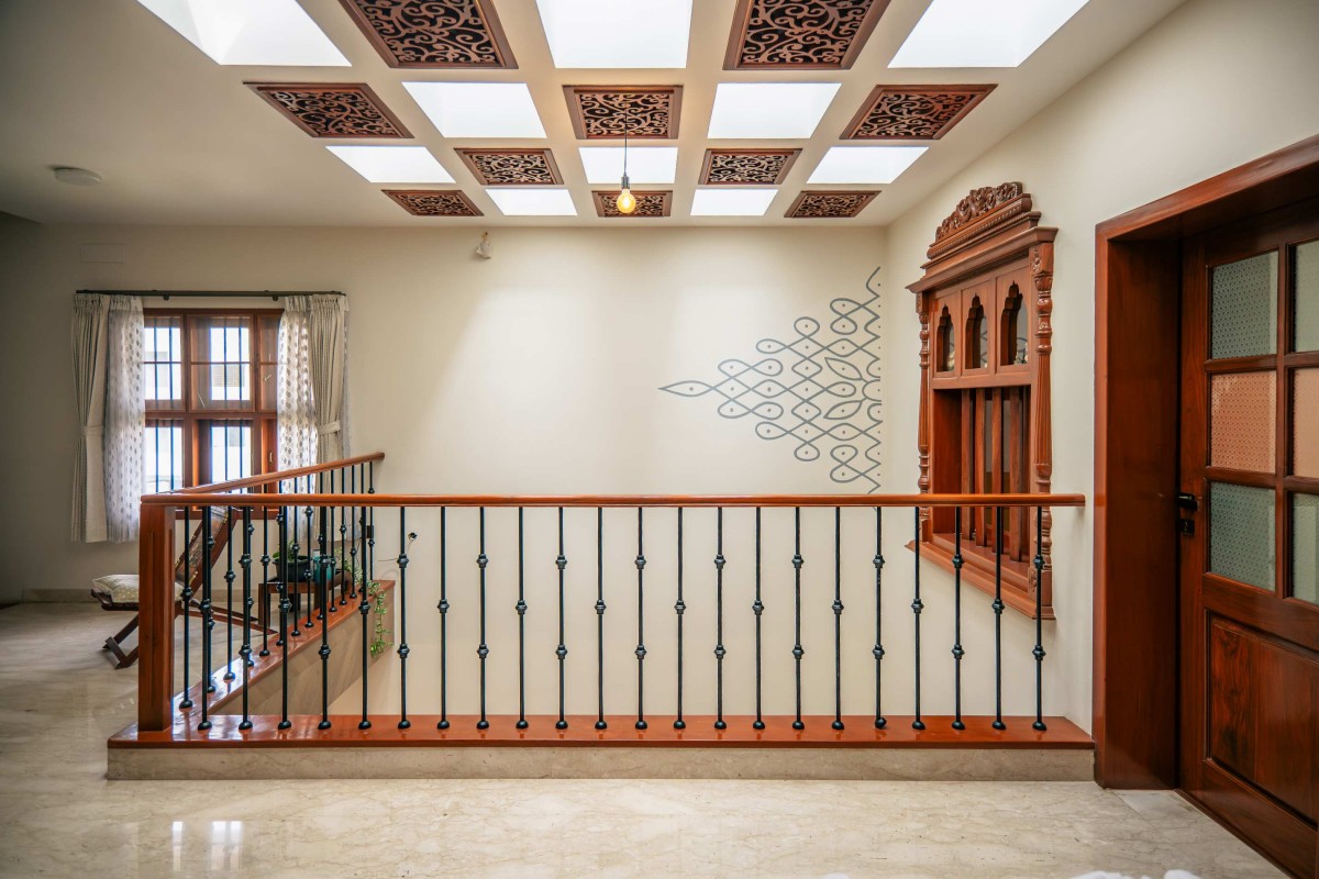 The staircase with patterned tile risers, wooden treads, and slender metal railings acts as a sculptural connector across levels. On the upper floor, the skylit ceiling is composed of carved wooden panels that filter sunlight softly through the day, giving the interiors a rhythmic and layered ambience.