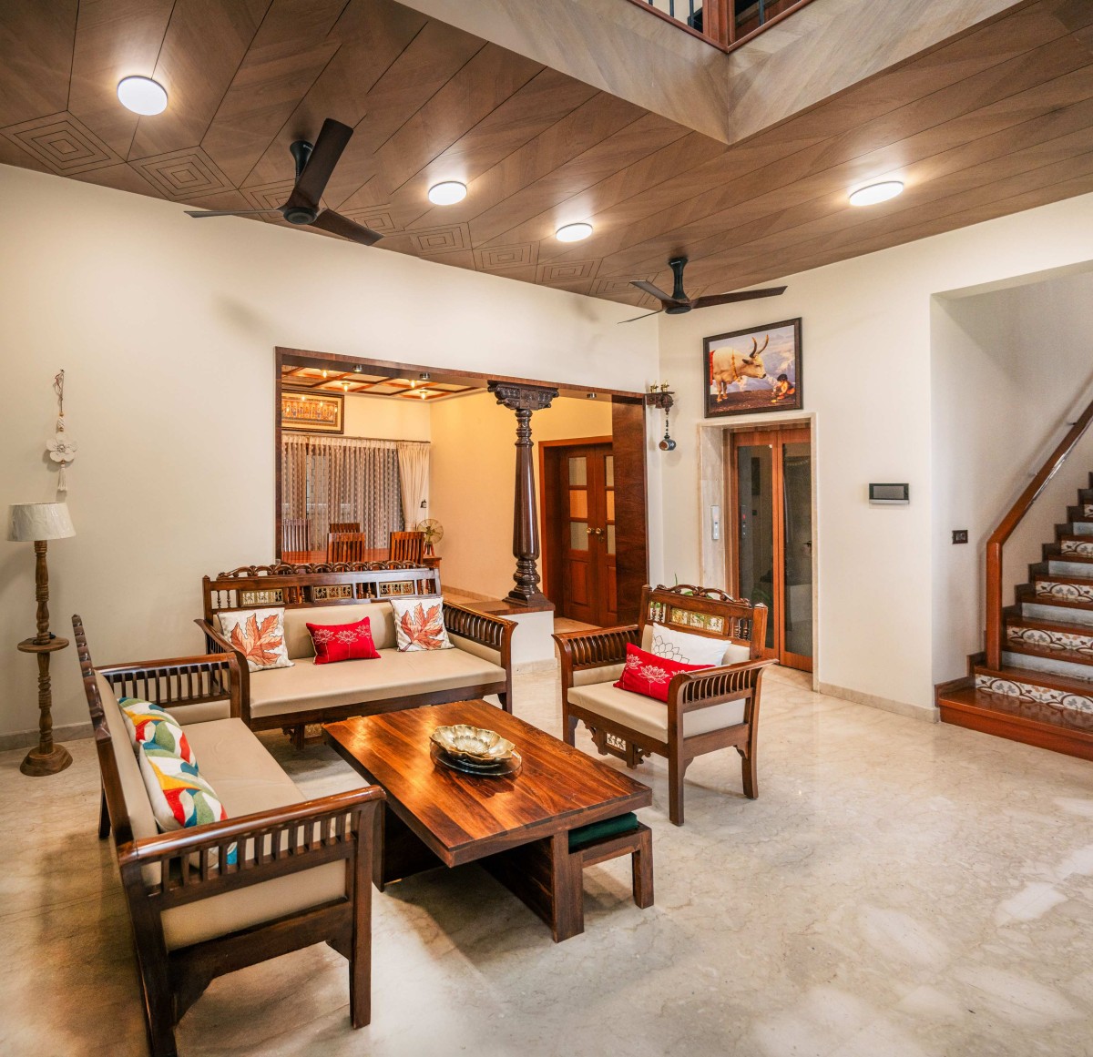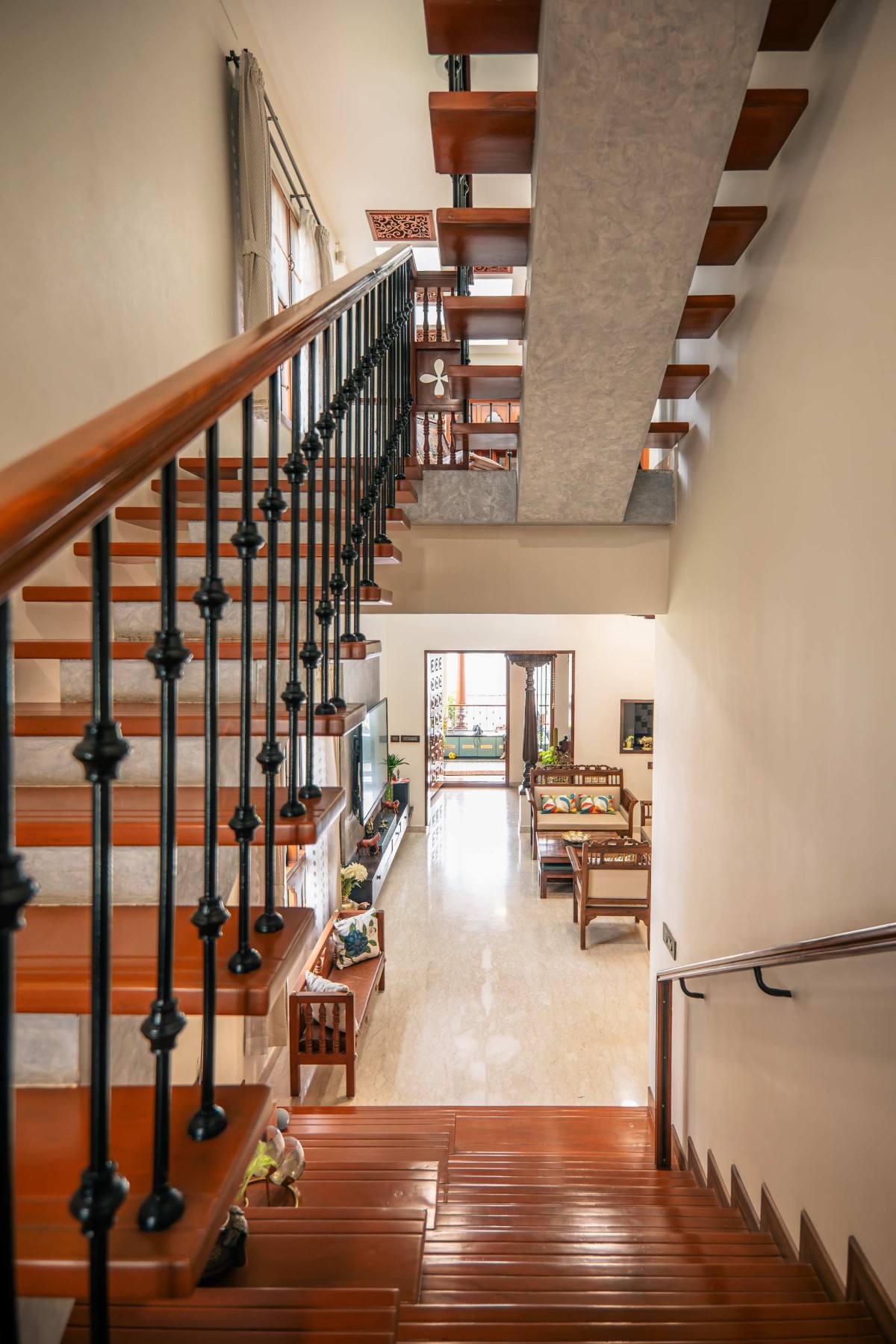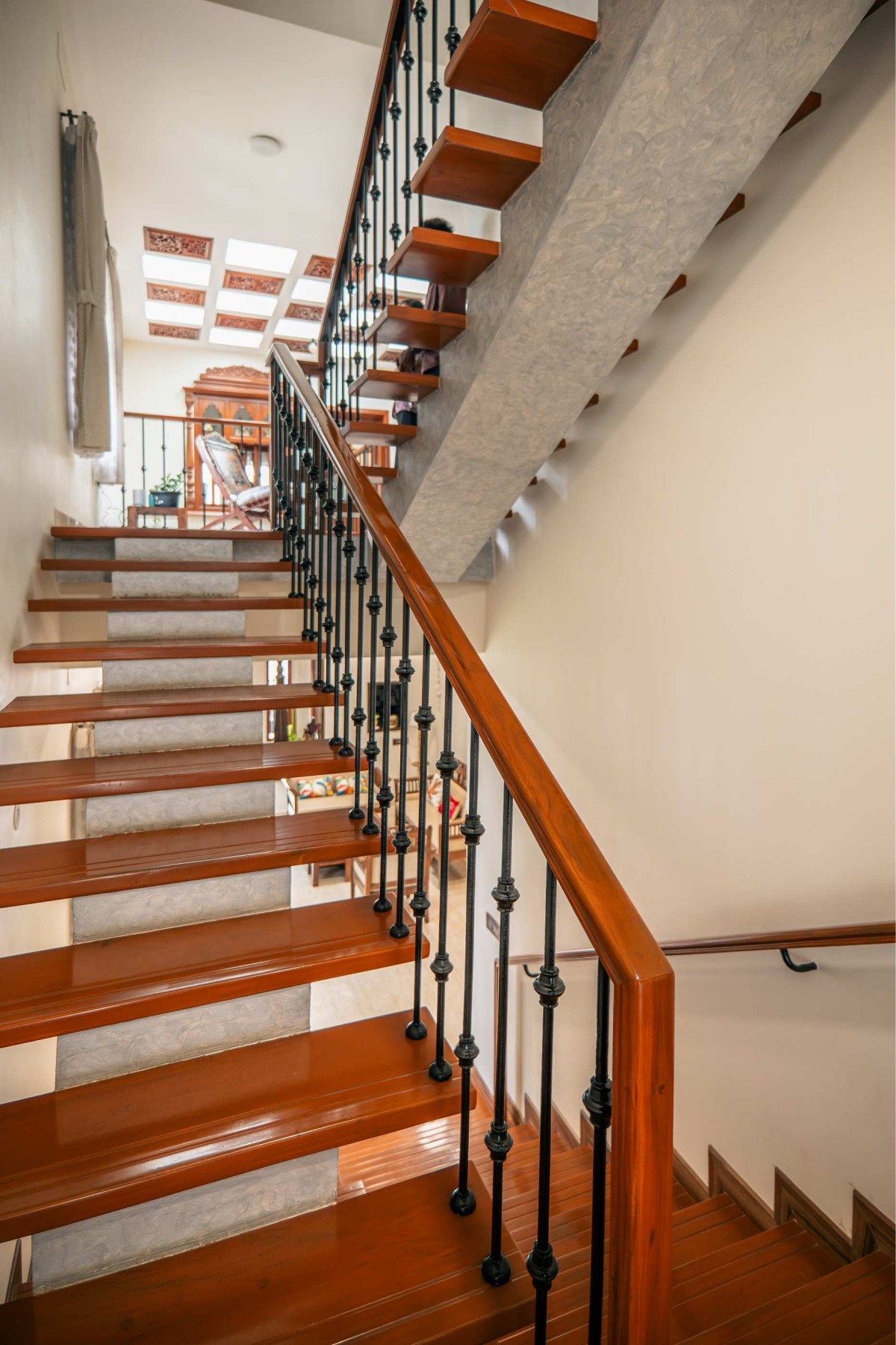 The staircase with patterned tile risers, wooden treads, and slender metal railings acts as a sculptural connector across levels. On the upper floor, the skylit ceiling is composed of carved wooden panels that filter sunlight softly through the day, giving the interiors a rhythmic and layered ambience.
