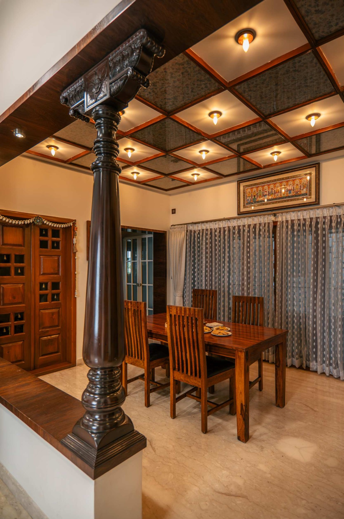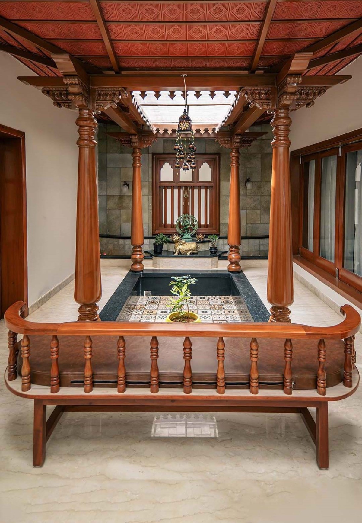 Light plays a defining role in shaping the experience of Devamshi. From the skylit passages to the open courtyard, daylight moves gently through the house, highlighting the textures of wood and stone. Each crafted element from the carved columns to the detailed railings which adds warmth and continuity, expressing the spirit of traditional craftsmanship in a simple and enduring way.